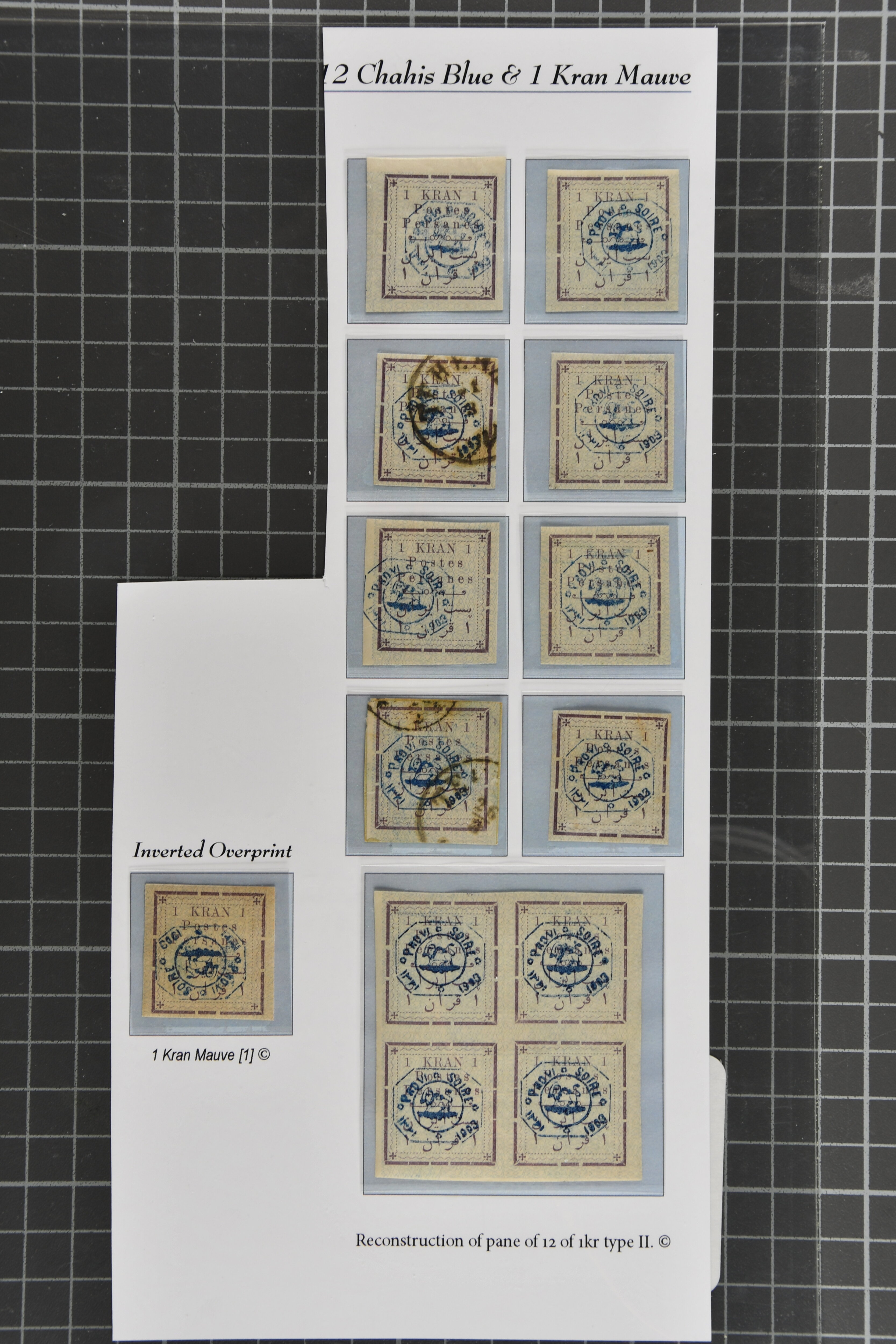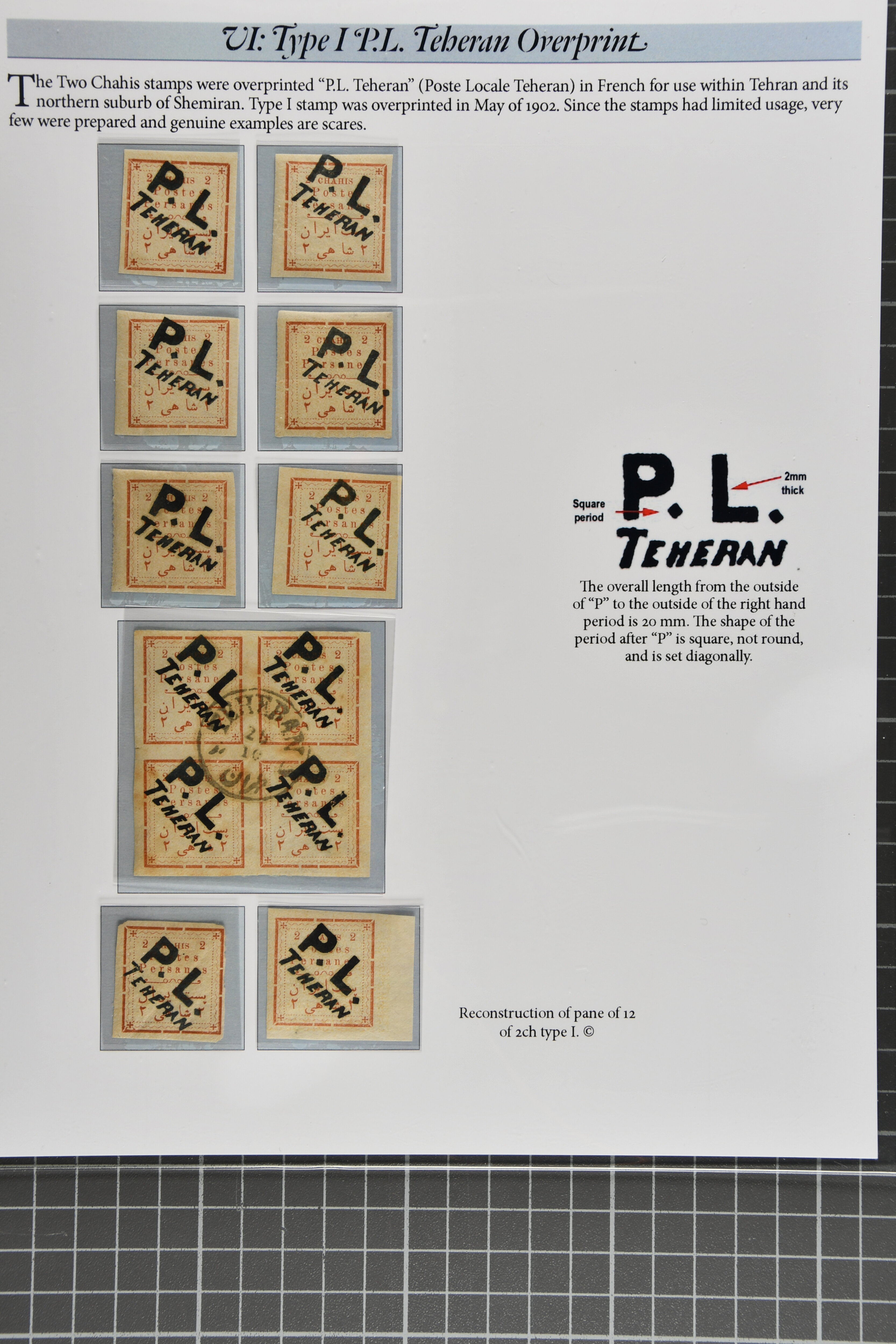 537 */bof/(*) image1902 (May): Teheran Local Post, Typeset 2 ch. red & buff, Type I, imperforate, overprinted "P.L. / TEHERAN" diagonally in black (Poste Locale Teheran), for use within the City and the northern suburb of Schemiran; the reconstruction of the pane of twelve types (2 x 6) comprising single examples (8) in unused condition (all are signed Sadri) and a used block of four (positions 7-8/1-10) cancelled by Teheran cds (Oct 26) in black. Position 4 with horizontal crease and one or two without gum but a remarkable and rare reconstruction Scott = $ 2'600+. (Image 1)