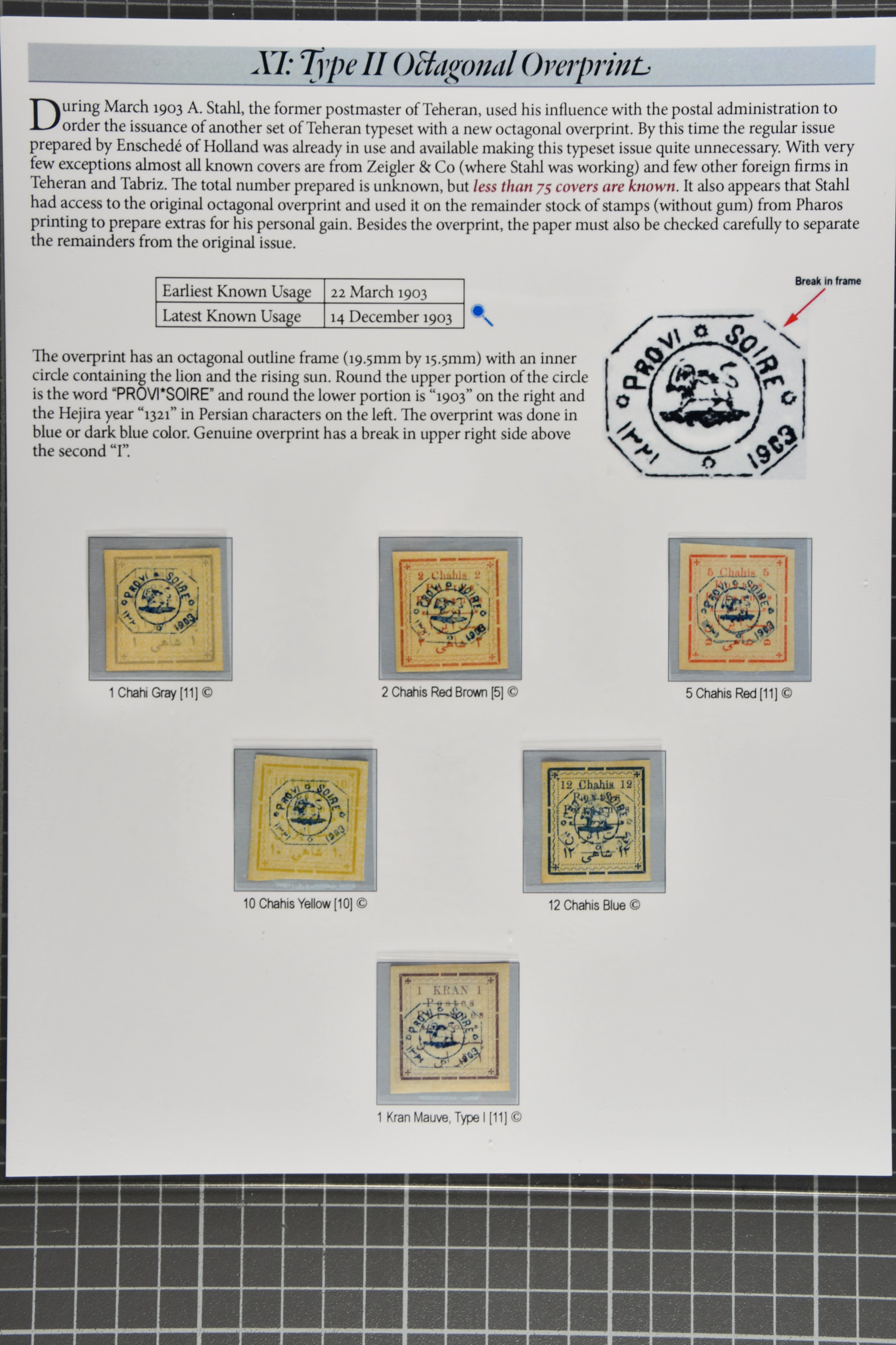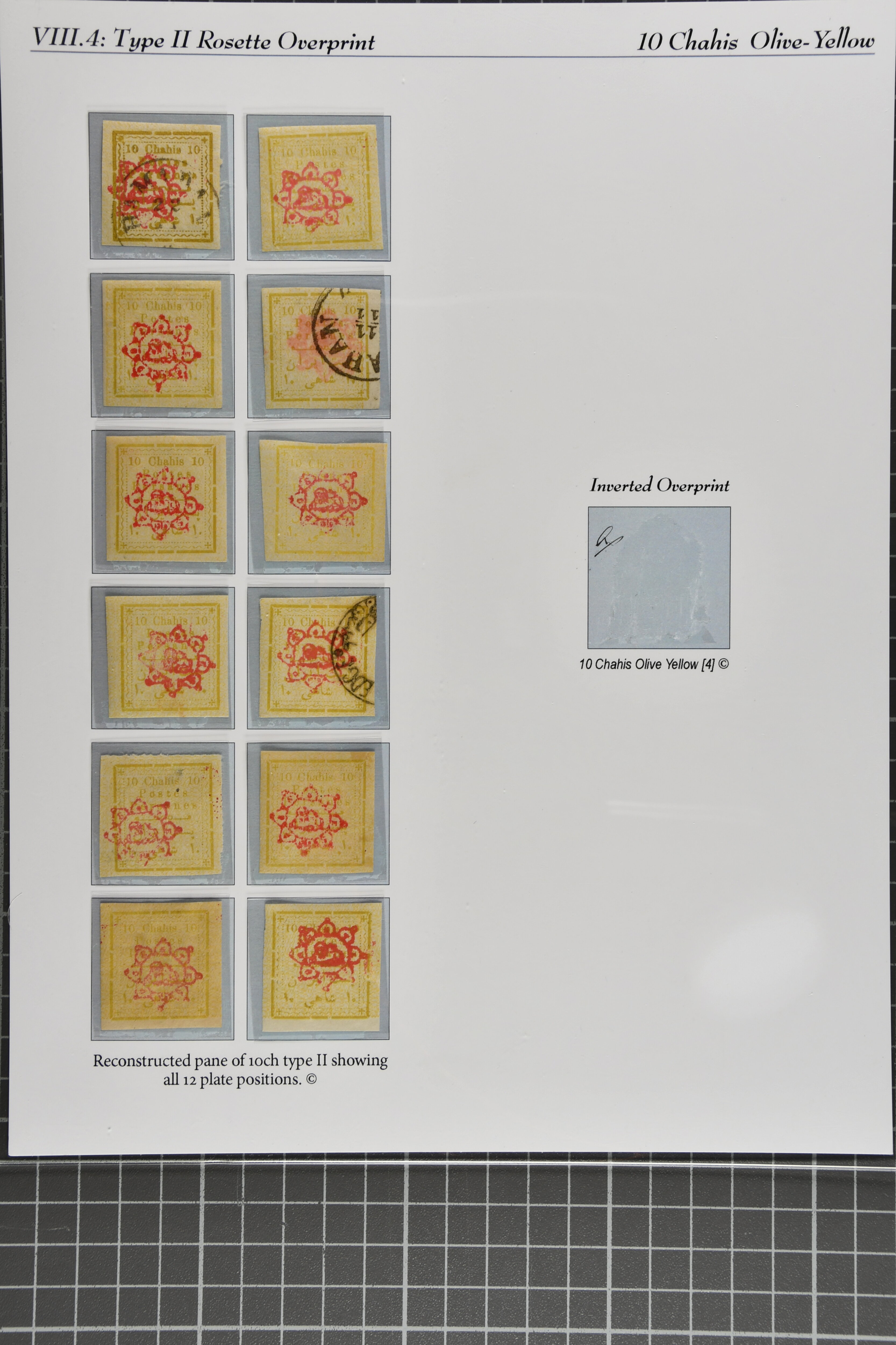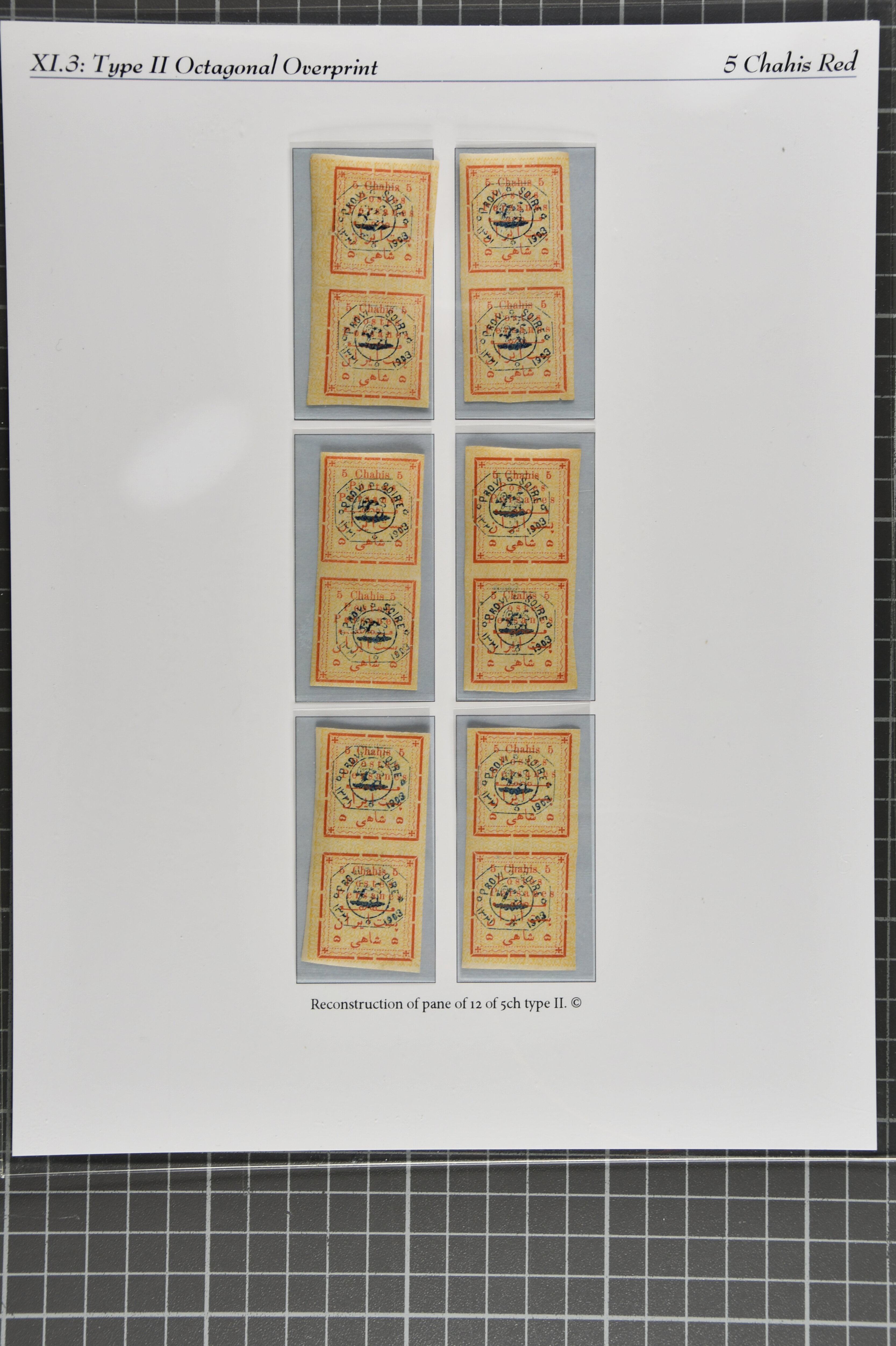 529 * image1902 (Sept): Typeset 10 ch. olive-yellow & yellow with red control handstamp, imperforate, the rare Type II (small Chahis), the reconstruction of the pane of twelve types (2 x 6), made up of single examples unused (9) and used (3), all four margin examples. All signed Sadri Scott = $ 945. (Image 1)