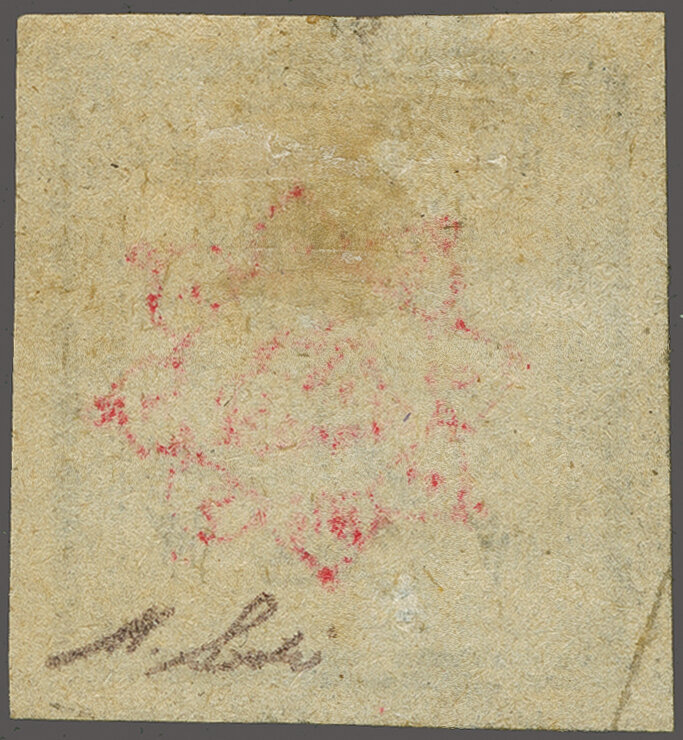 533 * image1902 (Sept): Typeset 10 krans deep blue & blue with red control handstamp, imperforate, Type II (small Krans), an unused example (position 8) with good margins all round, of fine fresh colour, large part og. It is believed that just 20 panes or sheets were printed of the Kran values: giving a total of either 240 or 480 stamps produced. Rare. Signed Sadri Scott = unlisted. (Image 1) (Image 2)