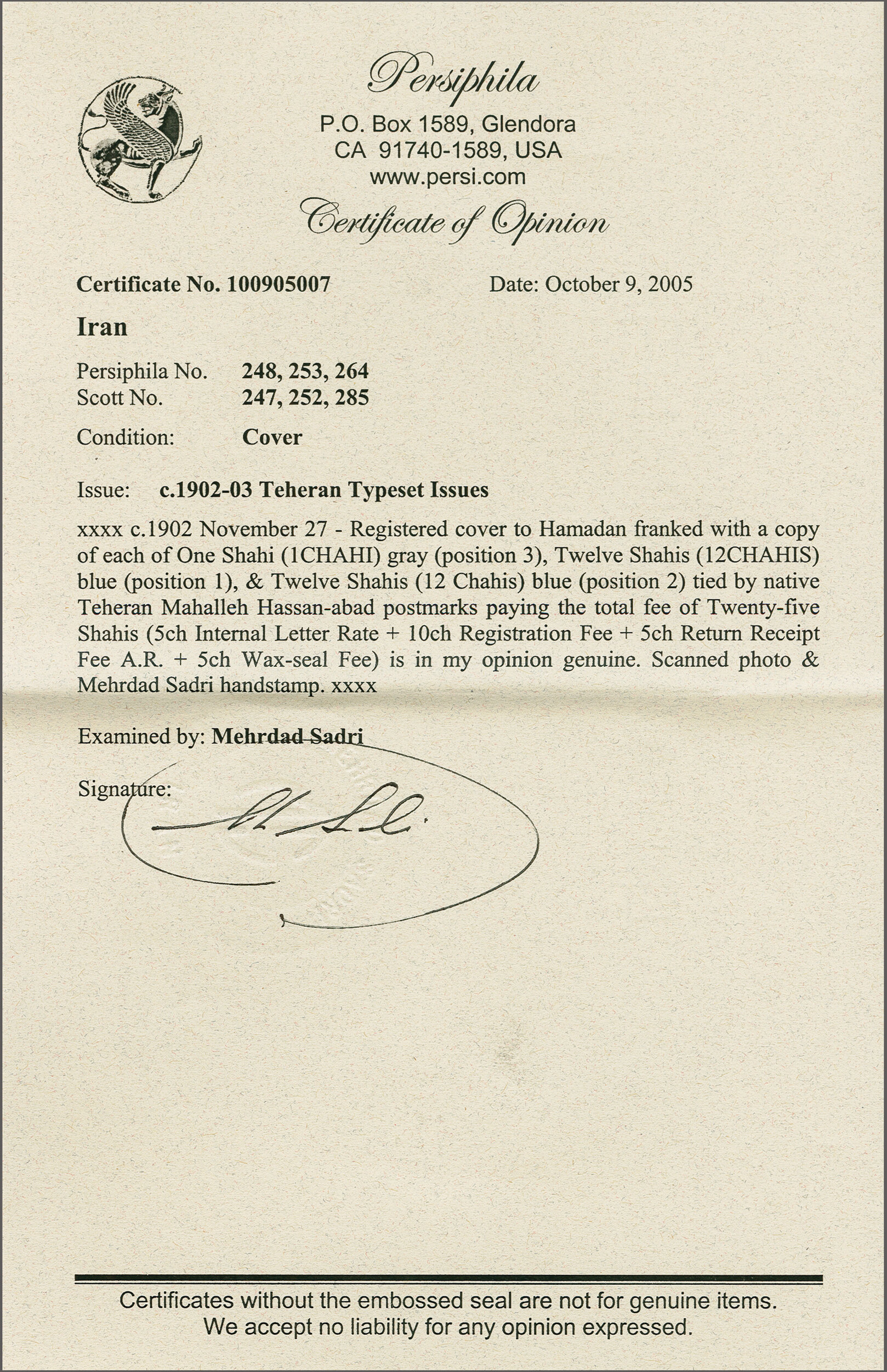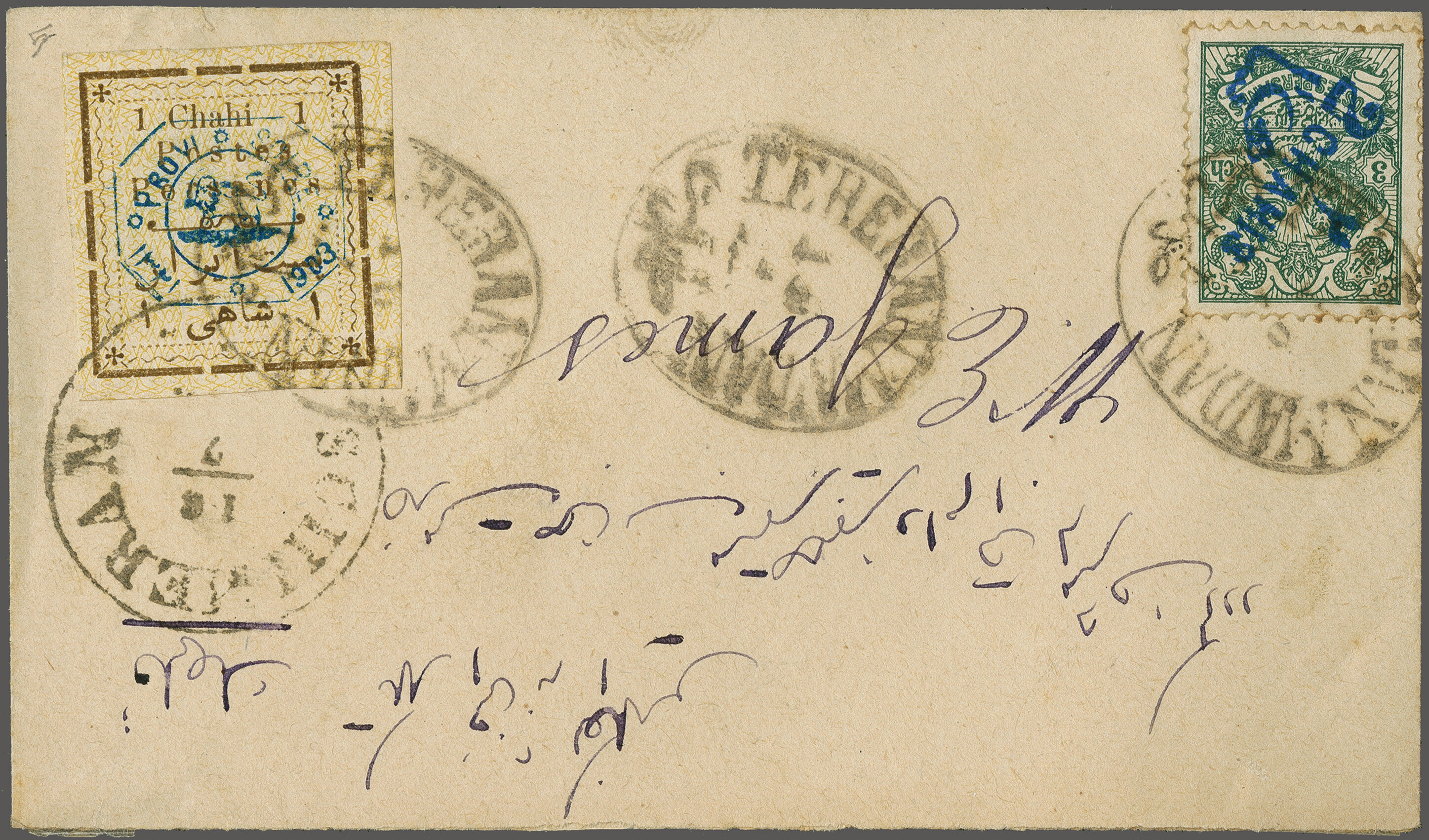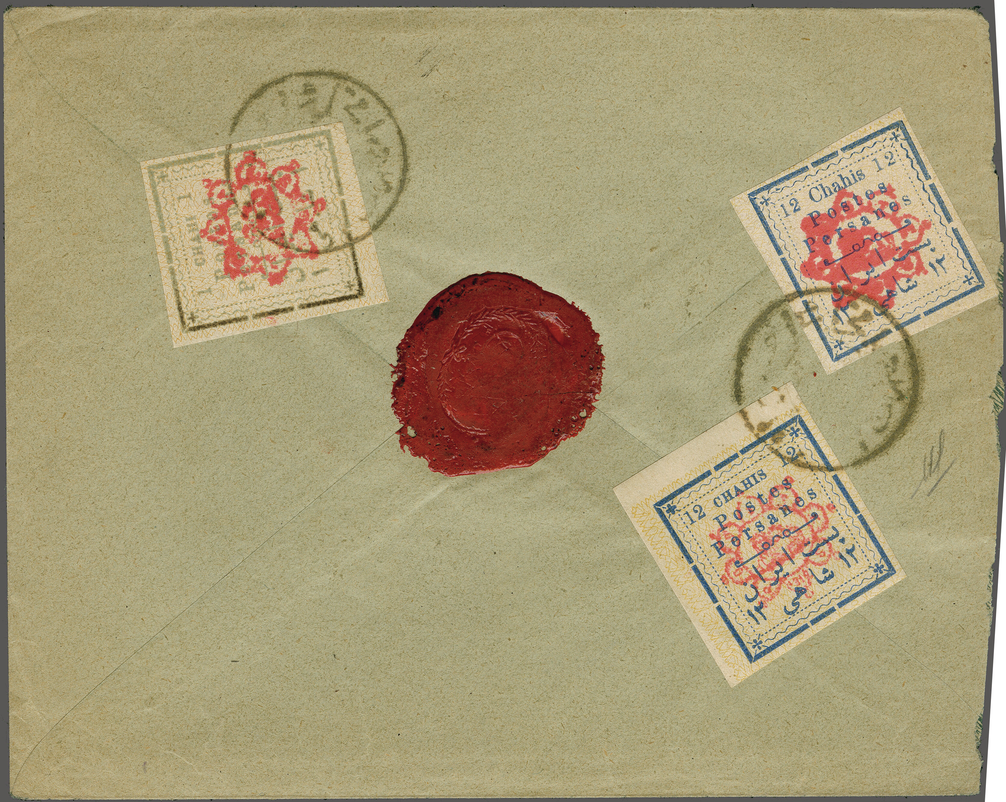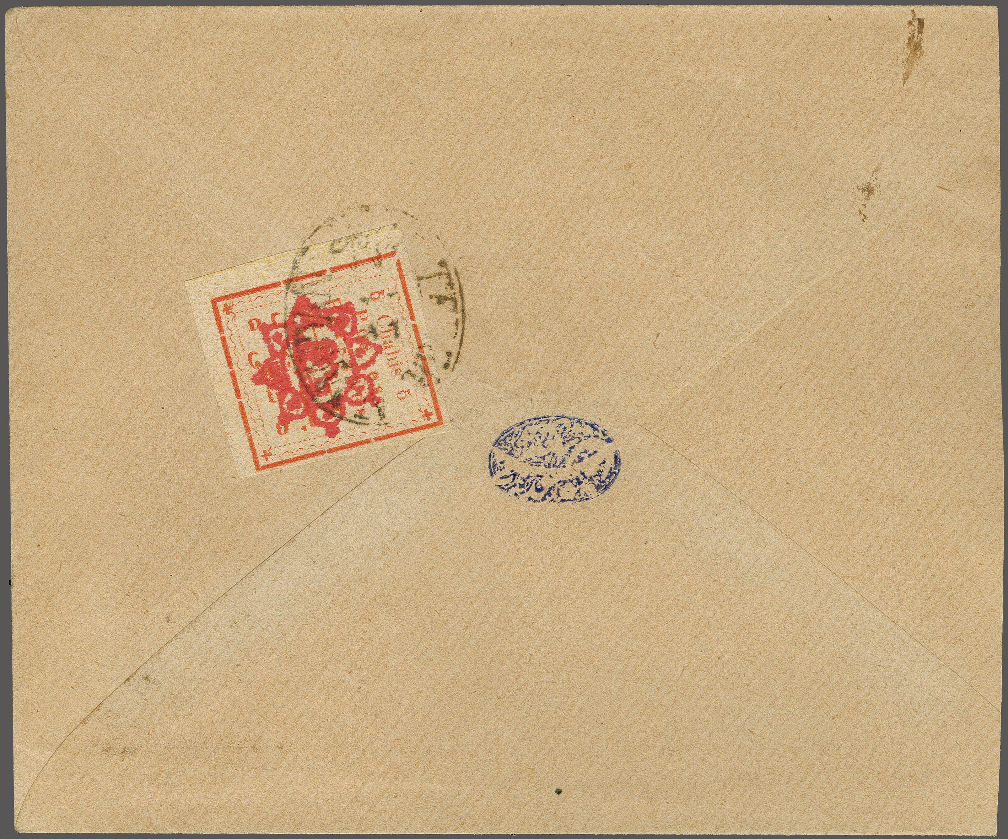 532 cover image1902 (Sept): Typeset 12 ch. blue & yellow with red control handstamp, imperforate, the rare Type II (small Chahis), a single example (position 1) with ample margins all round, used with 1 ch. grey & buff and 12 ch. ultramarine & buff (both Type I) on reverse of 1902 cover to Hamadan tied by TEHERAN MAHALLEH AMIN HOZOUR DESPATCH. registration label on obverse of a fine cover, the sole recorded usage of both types of the 12 chahi on letter. Cert. Sadri (2005). (Image 1) (Image 2) (Image 3)