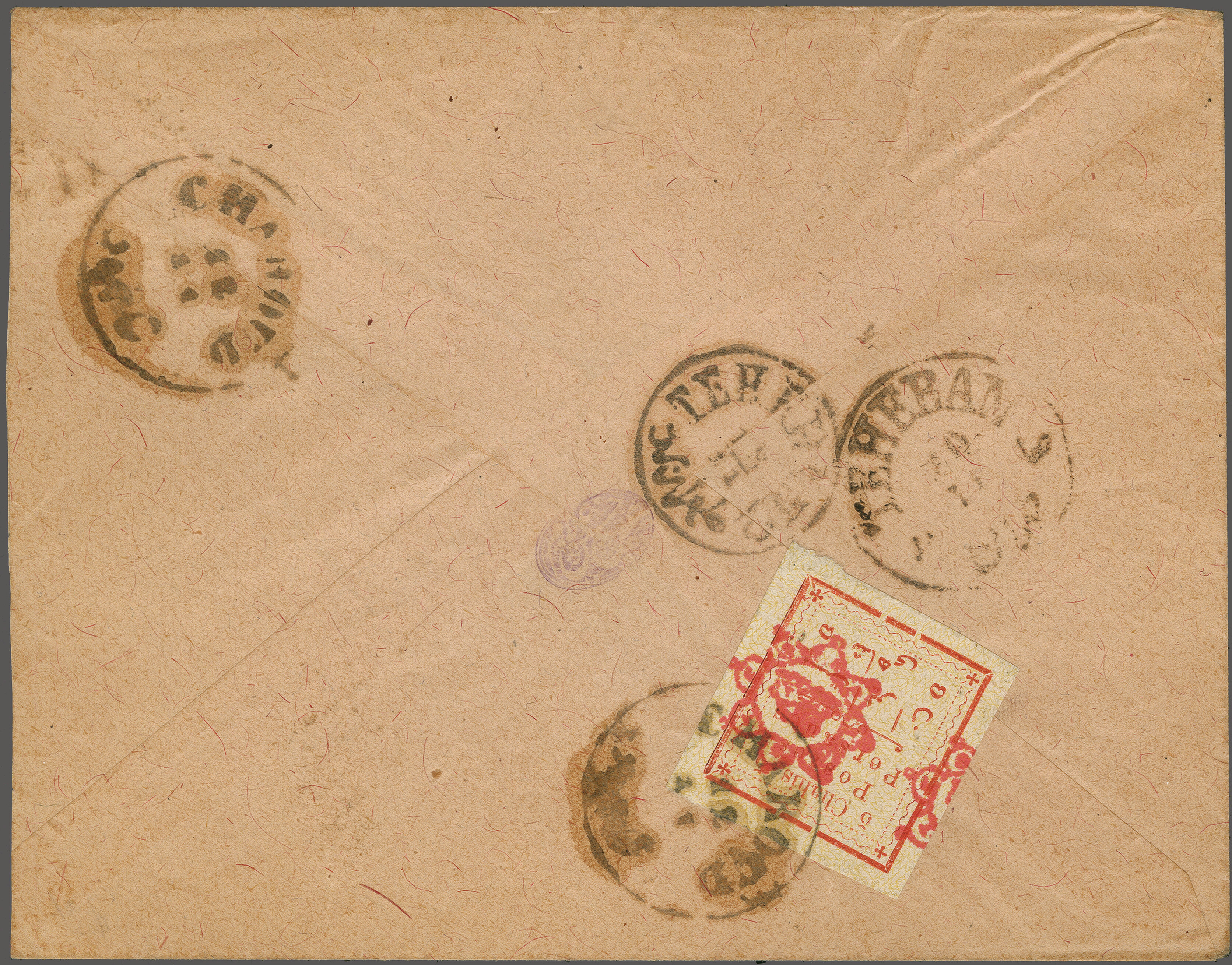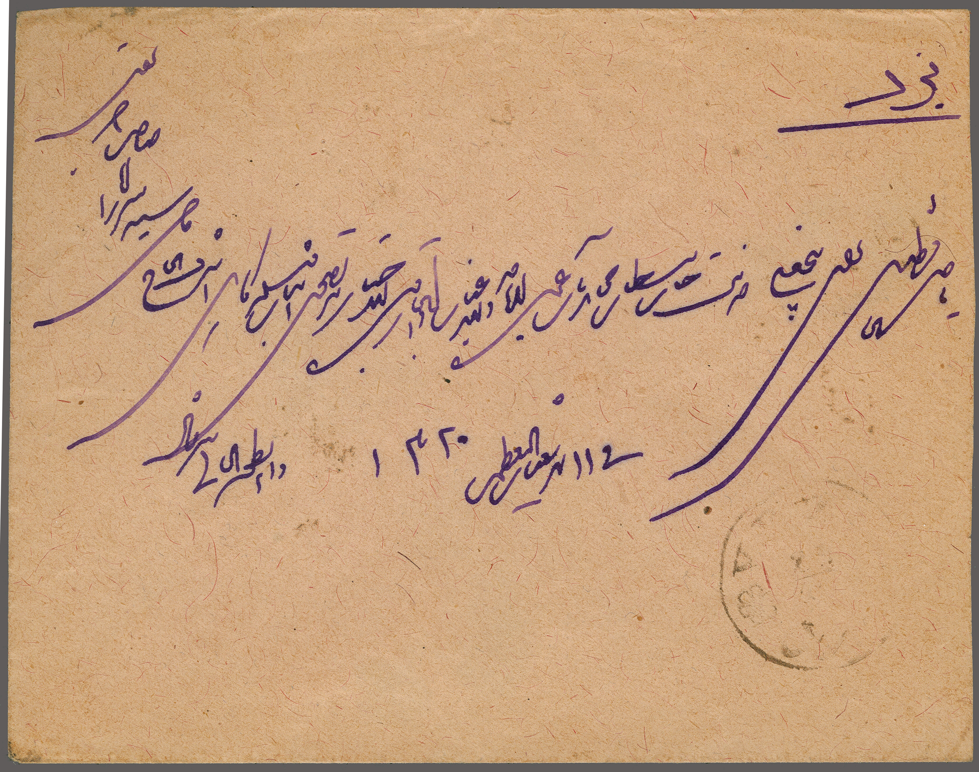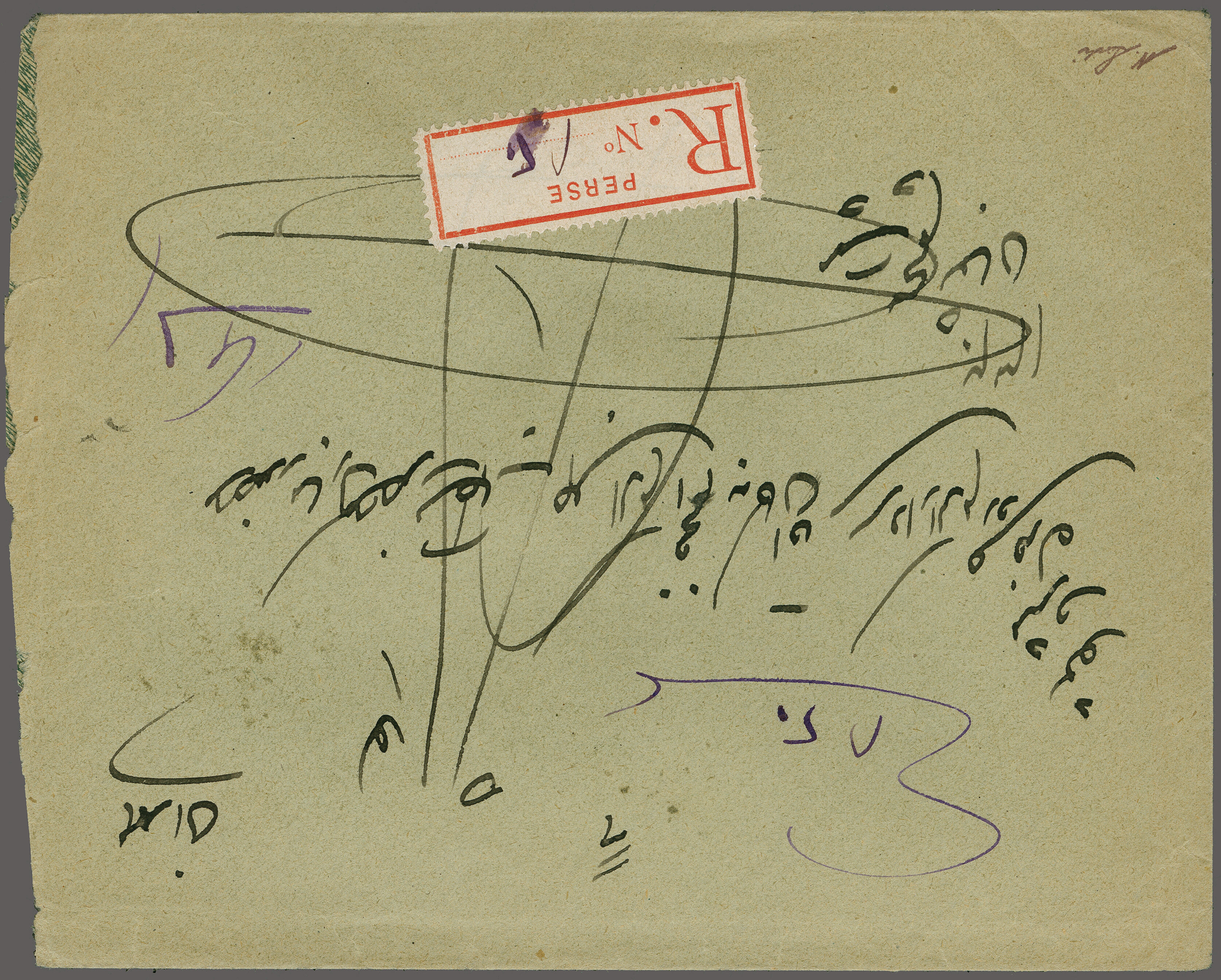 532 cover image1902 (Sept): Typeset 12 ch. blue & yellow with red control handstamp, imperforate, the rare Type II (small Chahis), a single example (position 1) with ample margins all round, used with 1 ch. grey & buff and 12 ch. ultramarine & buff (both Type I) on reverse of 1902 cover to Hamadan tied by TEHERAN MAHALLEH AMIN HOZOUR DESPATCH. registration label on obverse of a fine cover, the sole recorded usage of both types of the 12 chahi on letter. Cert. Sadri (2005). (Image 1) (Image 2) (Image 3)