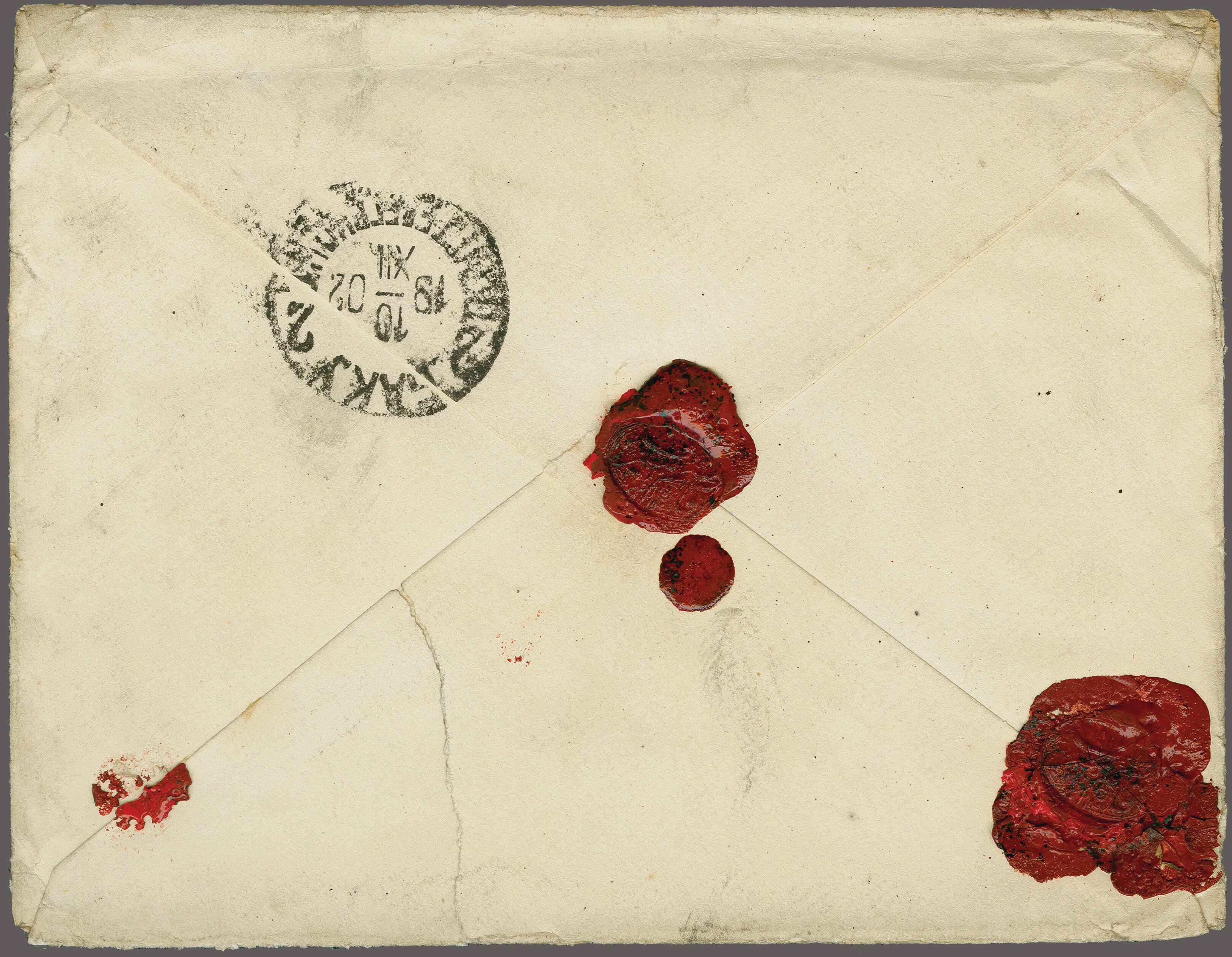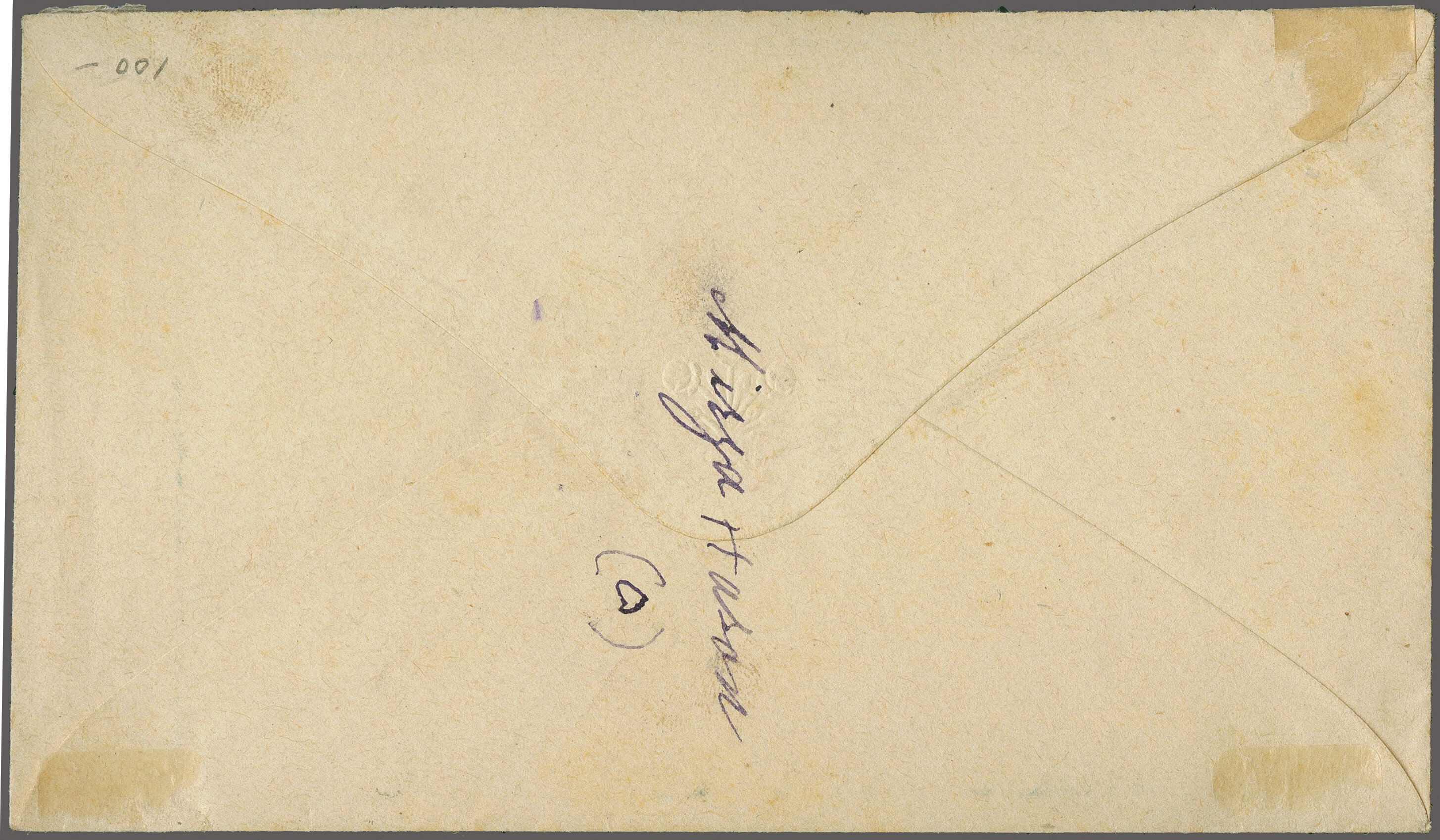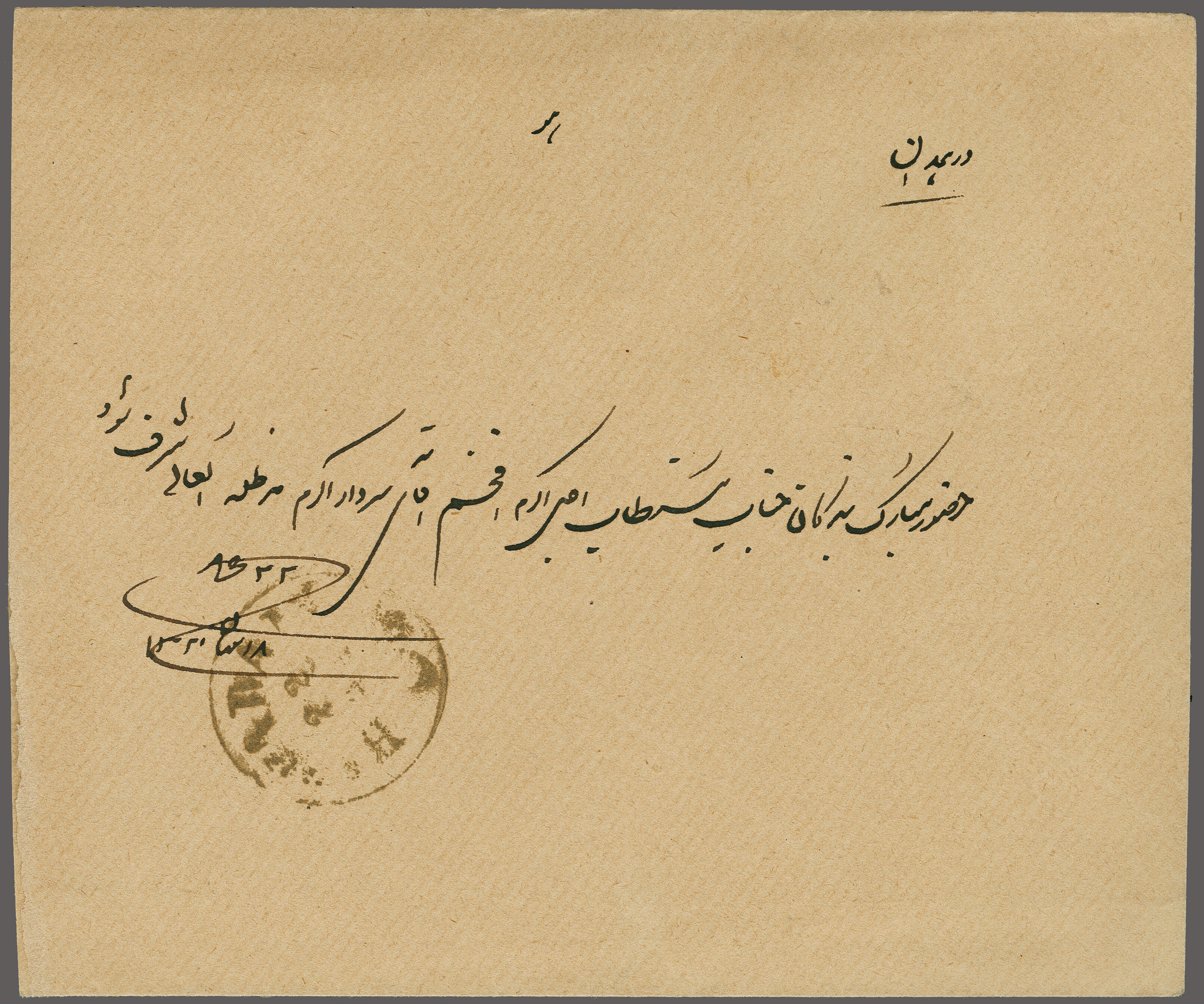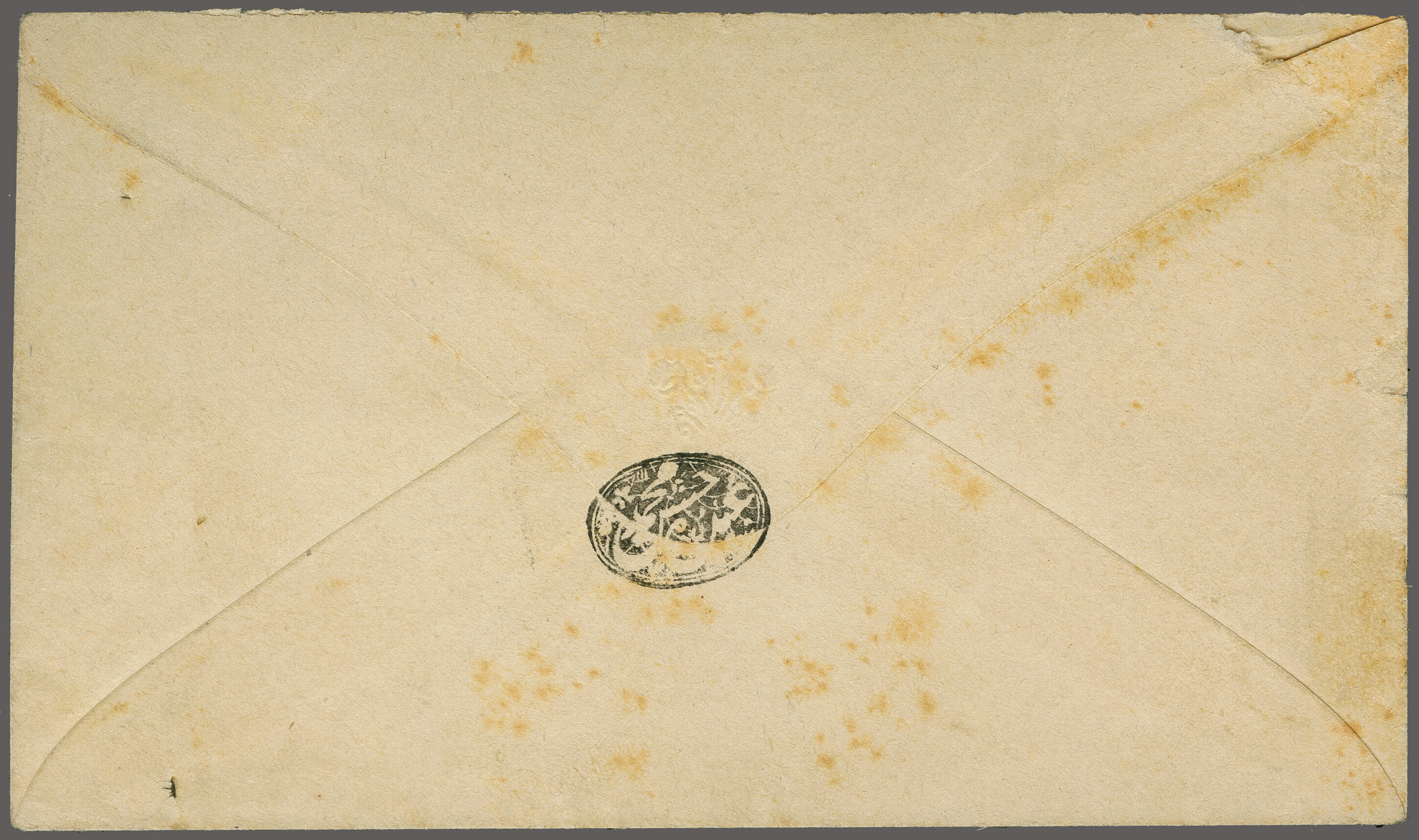 532 cover image1902 (Sept): Typeset 12 ch. blue & yellow with red control handstamp, imperforate, the rare Type II (small Chahis), a single example (position 1) with ample margins all round, used with 1 ch. grey & buff and 12 ch. ultramarine & buff (both Type I) on reverse of 1902 cover to Hamadan tied by TEHERAN MAHALLEH AMIN HOZOUR DESPATCH. registration label on obverse of a fine cover, the sole recorded usage of both types of the 12 chahi on letter. Cert. Sadri (2005). (Image 1) (Image 2) (Image 3)