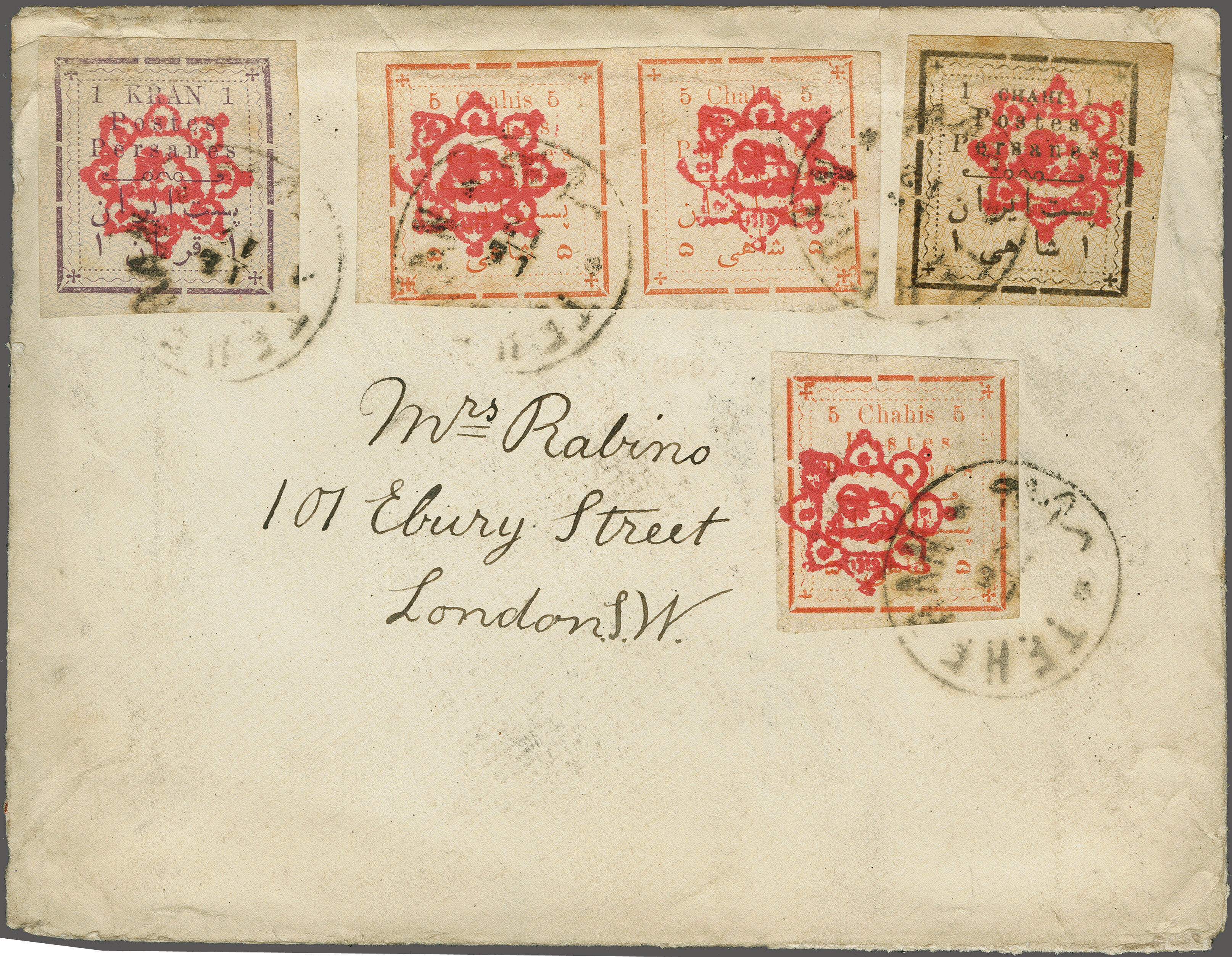 528 cover image1902 (Sept): Typeset 5 ch. red & yellow with red control handstamp, imperforate, the scarce Type II (small Chahis), a fine single example (position 3) and a horizontal pair (pos. 1-2) all with clear to good margins, used with 1 ch. deep grey & buff (pos. 9) and 1 kr. violet & blue (pos. 6), both Type I; all used on 1902 cover to London tied by TEHERAN circular datestamps (Dec 18). Closed flap tear on reverse alongside side Baku transit css (Dec 10j). Slightly soiled but a scarce cover. (Image 1) (Image 2)
