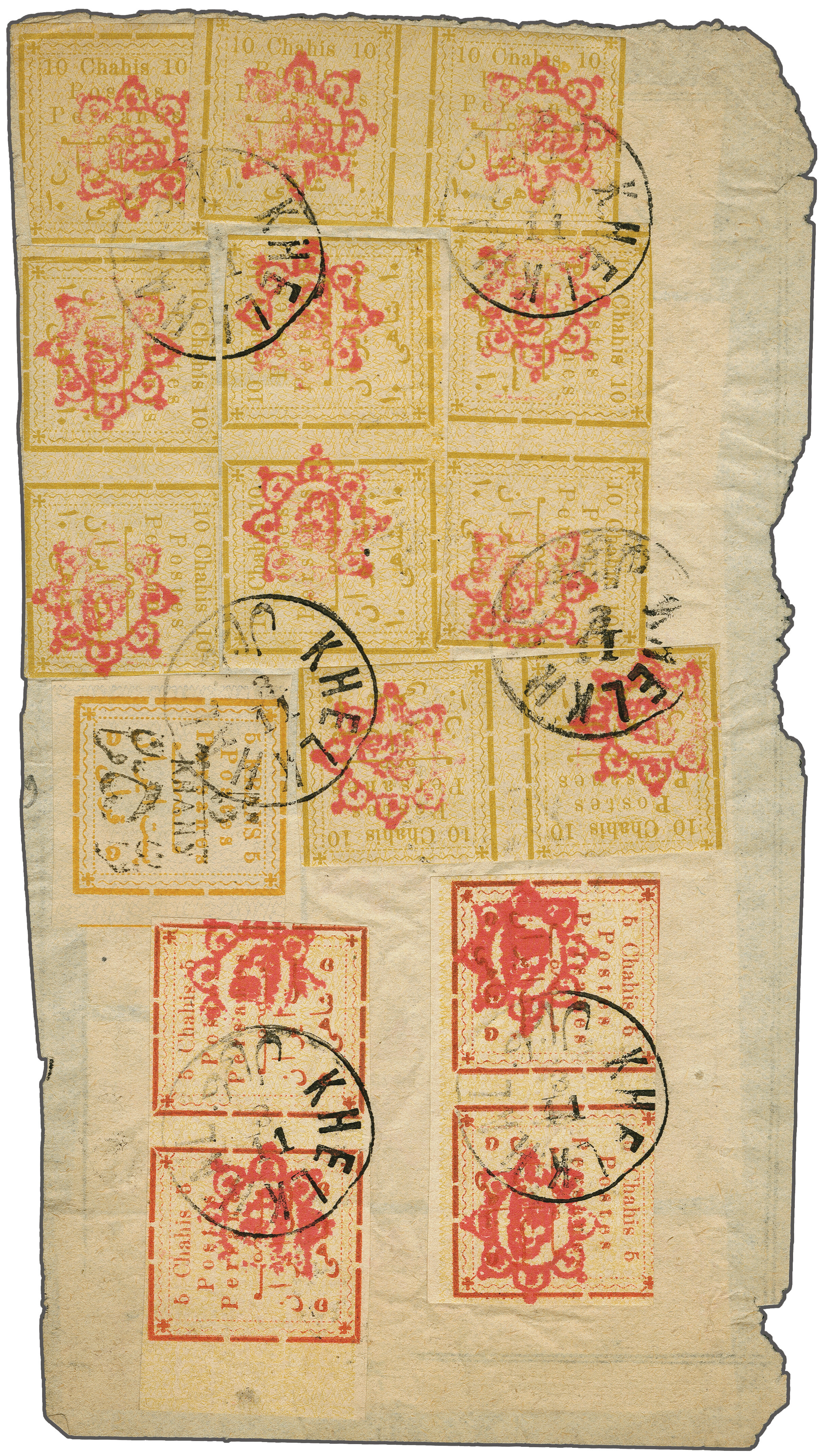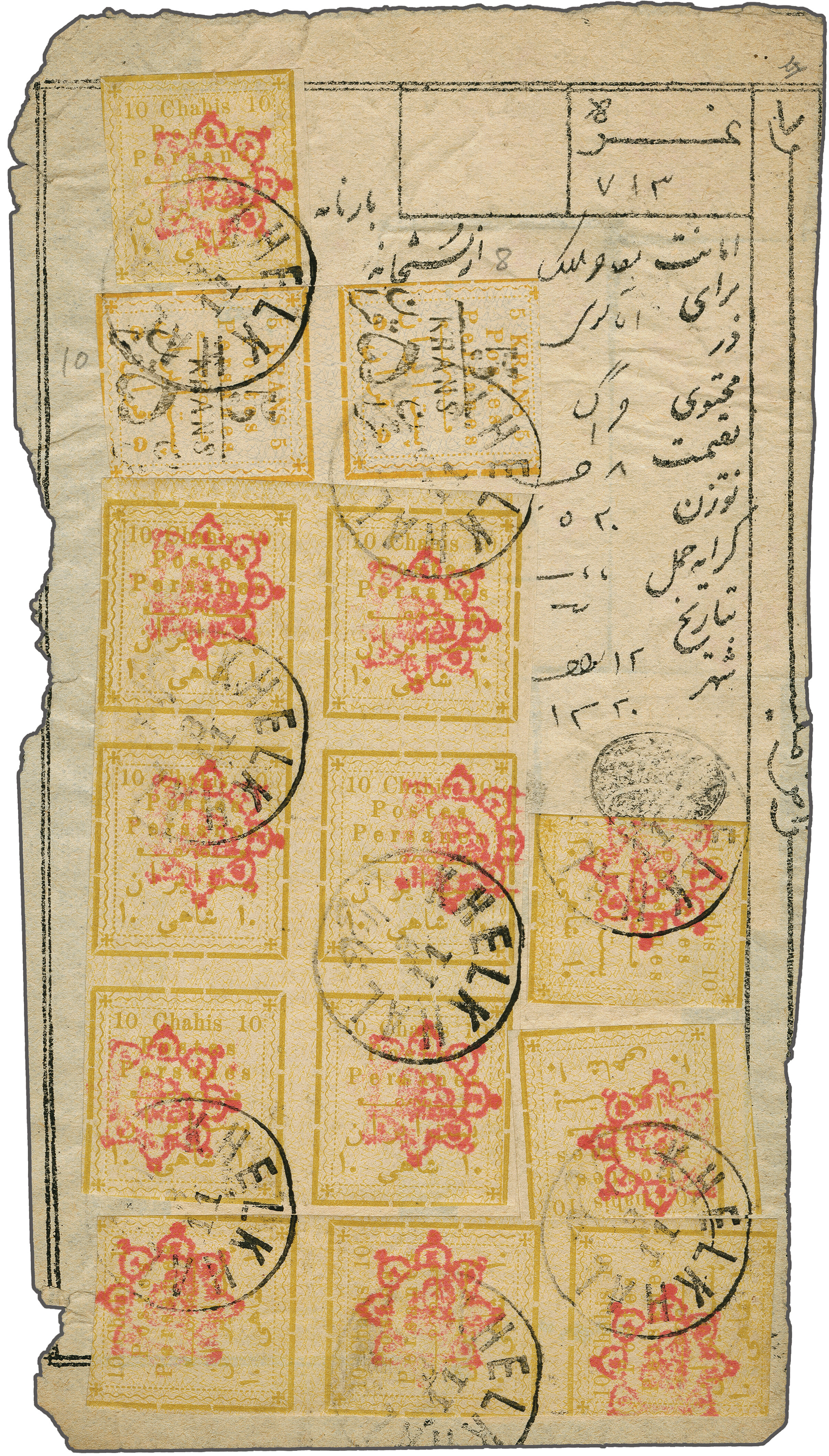 530 cover image1902 (Sept): Typeset 10 ch. olive-yellow & yellow with red control handstamp, imperforate, the scarce Type II (small Chahis), the remarkable usage of 27 examples in combination with provisional February 1902 5 kr. on 5 kr. ochre & blue single and pair (pos. 8/10 and 9), used on both sides of 1902 Parcel Post waybill, all tied by fourteen strikes of the KHEKKHAL circular datestamp (Nov 8) in black. A wonderful franking utilising a full sheet of the 10 ch. excluding position 12 of the right pane. The largest recorded usage of the 10 chahi Type II on any cover or Postal document and a rare usage of the 5 kr. provisional. An outstanding usage and most attractive. (Image 1) (Image 2)