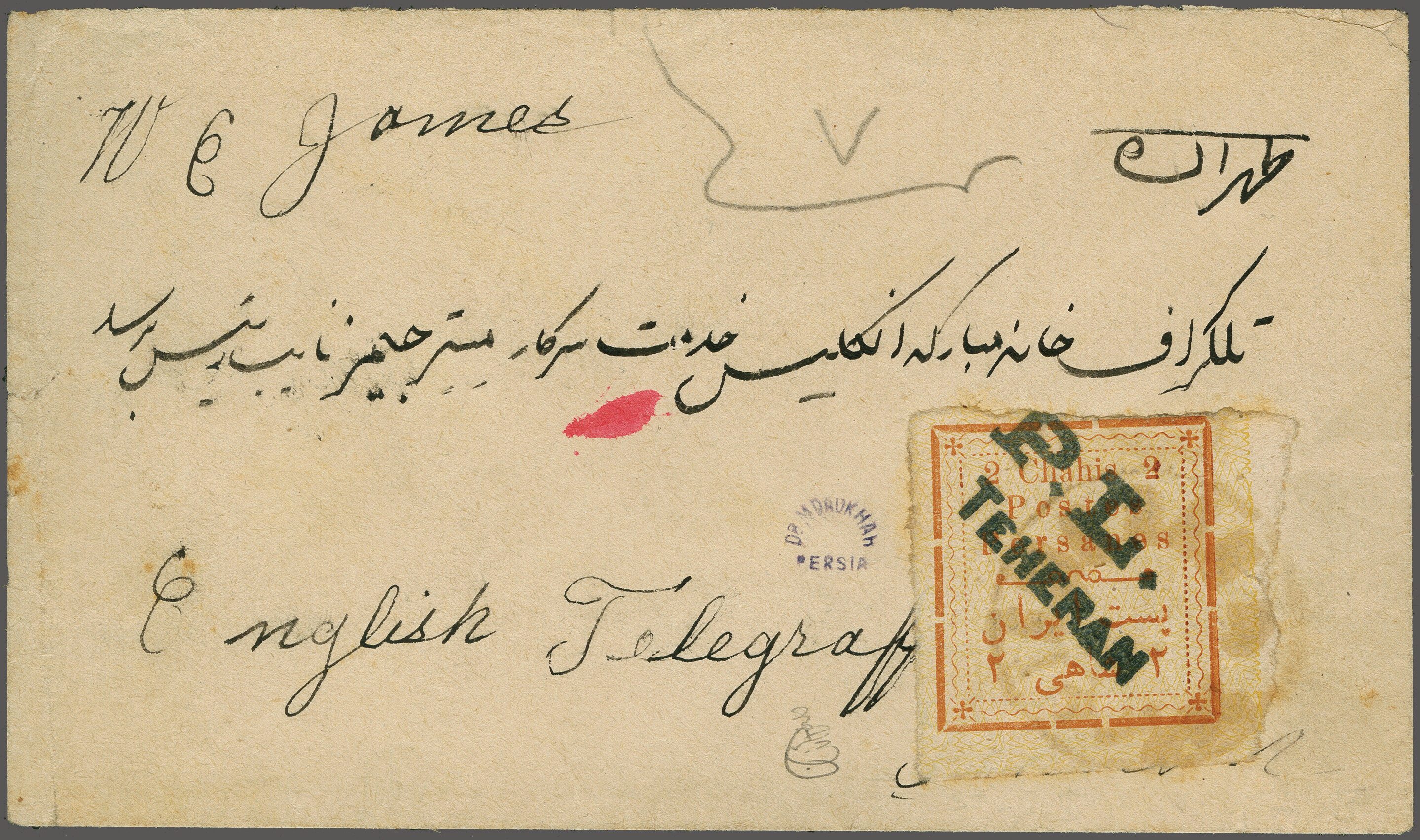543 cover image1903 (March): Octagonal "Stahl" overprints in blue on Typeset issue; 1 ch. grey & yellow imperforate, Type II, a used example (position 4), large margins all round in combination with 1903 provisional 2 ch. in blue on 3 ch. green on 1903 cover to W.E. James of the British Telegraph Company in Teheran at local rate, tied by oval TEHERAN MAIDAN datestamps (July 10) in black with information strike and SCHIMERAN suburb arrival datestamp of the same day. Just three Local rate covers are recorded bearing this issue. Rare. (Image 1) (Image 2)