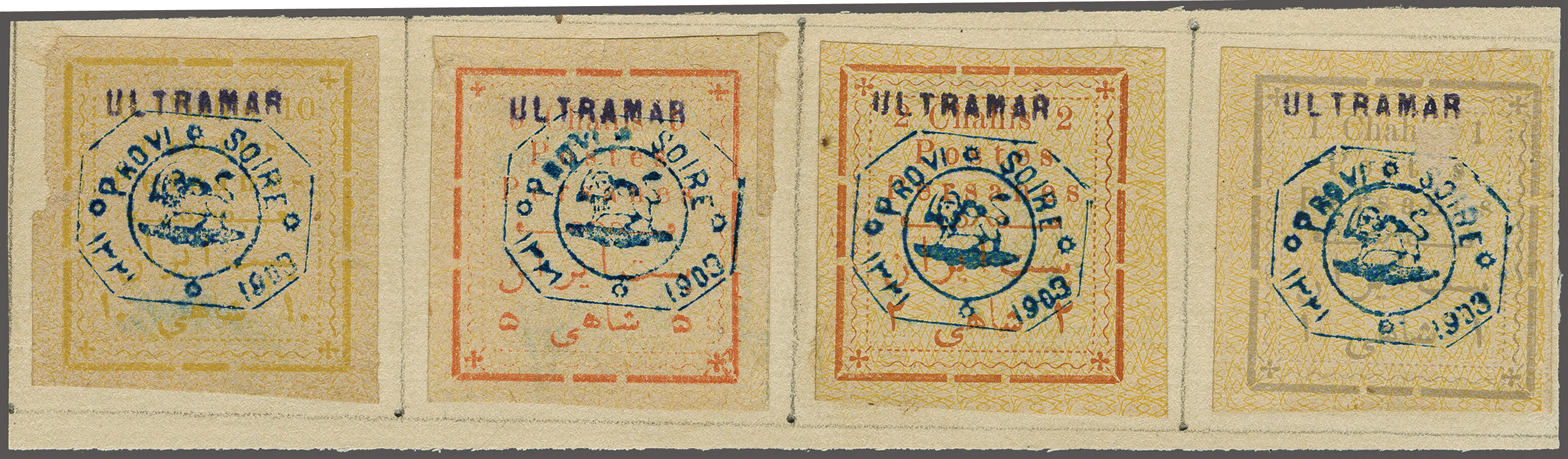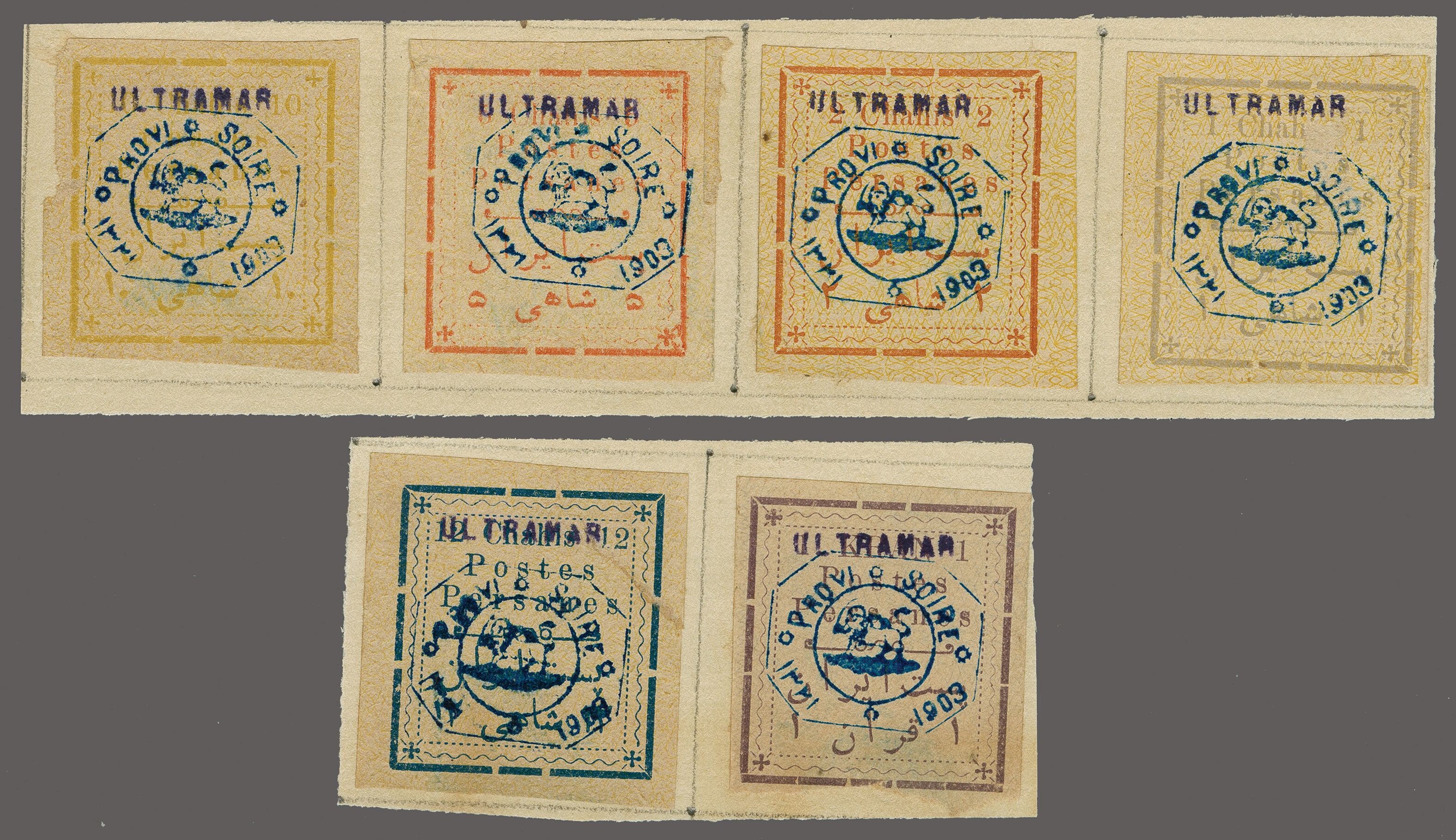 539 (*) image1903 (March): Octagonal "Stahl" overprints in blue on Typeset issue; the unused set of six regularly issued adhesives, 1 kr. violet & blue, Type I; and five Type II values 1 ch. grey & yellow, 2 ch. red-brown on yellow, 5 ch. red & yellow, 10 ch. olive-yellow & yellow and 12 ch. blue & yellow; overprinted "ULTRAMAR" in black by the Portuguese receiving authority upon receipt from the UPU and thereafter distriubuted to a Portuguese Colony, all applied to card for reference; good margins all round and of fresh colour, the 12 ch. and 1 kr. values with contemporary faults, nevertheless unique. (Image 1) (Image 2)