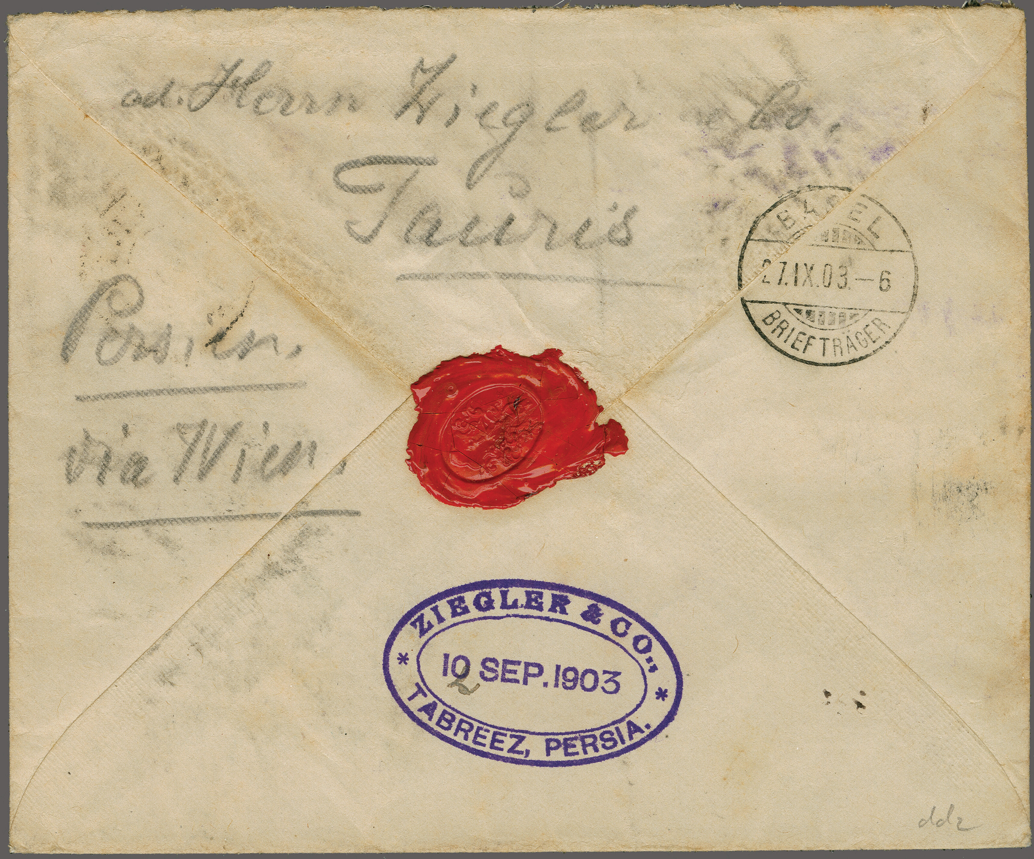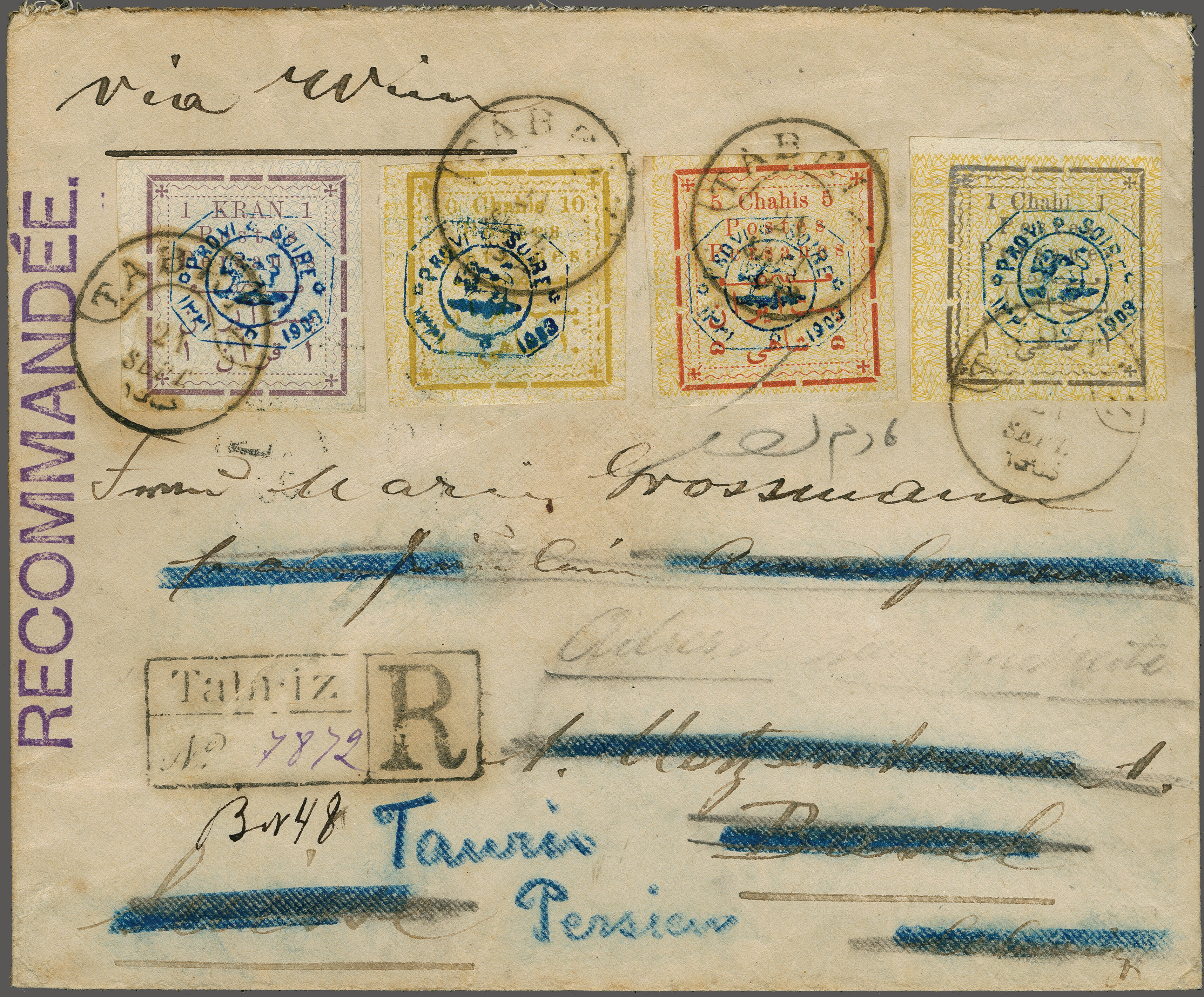 542 cover image1903 (March): Octagonal "Stahl" overprints in blue on Typeset issue; 1 kr. violet & blue imperforate, Type I, a used example (position 10) in combination with 1 ch. grey & yellow (pos. 1), 5 ch. red & yellow (pos. 11) and 10 ch. olive-yellow & yellow (pos. 5) all Type II with good margins all round, on Ziegler registered 1903 cover to Basel, Switzerland endorsed "via Wien", tied by TABRIZ circular datestamps (Sept 12) in black. Registration cachet at base and reverse witth Basel cds (Sept 27) - the cover returned to sender. Carried at 12 ch. foreign rate + 12 ch. registration + 12 ch registration receipt fee; a scarce and colourful franking. (Image 1) (Image 2)