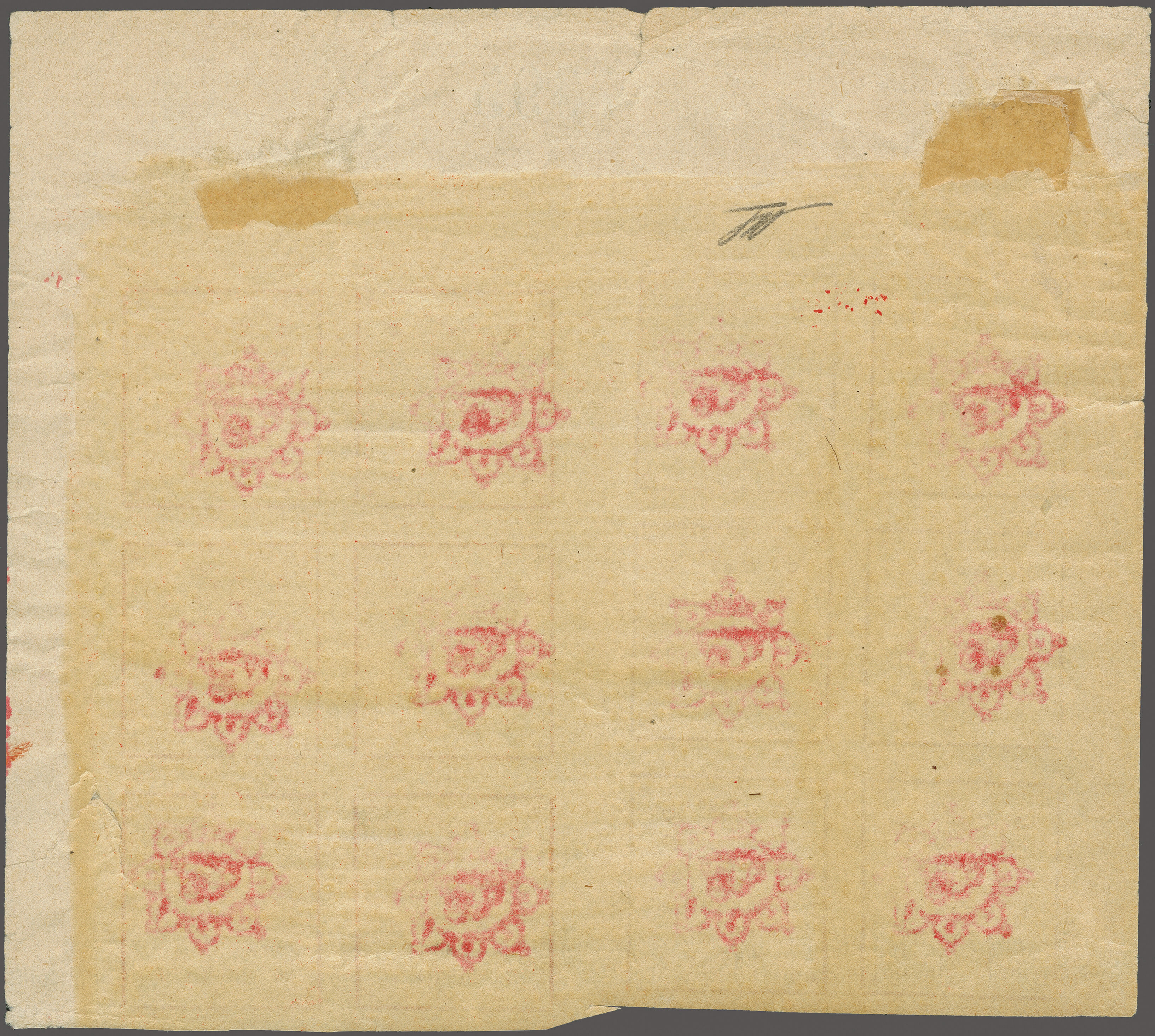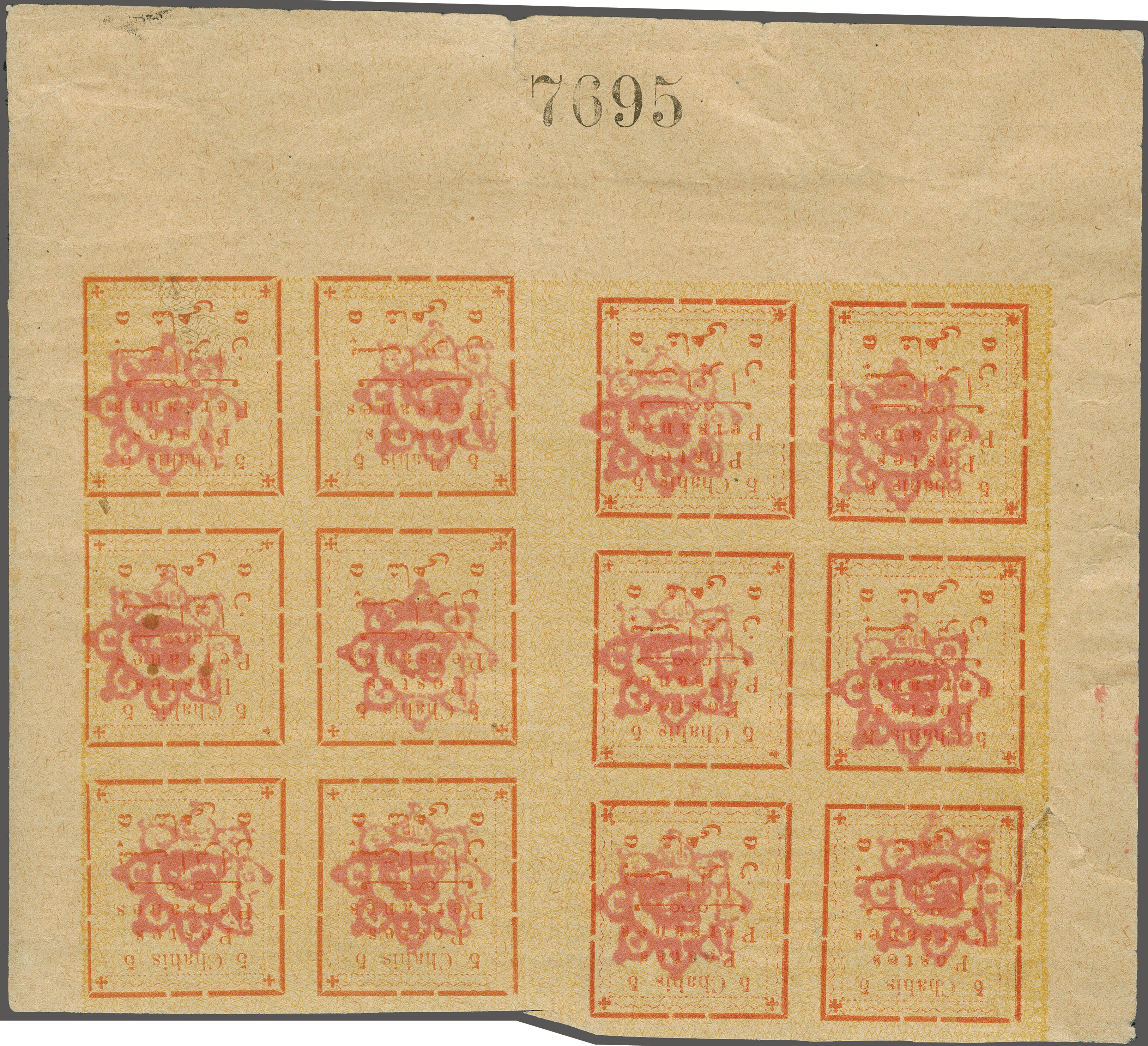 525 bof/(*) image1902: Handstamped Lion in Octagon surcharge in bright red, 5 c. red & yellow, Type II, the imperforate block of twelve subjects, marginal from base of sheet with sheet requisition number 7695 inverted in margin, unused without gum. A rare stamp in a multiple. Signed Sadri Scott = $ 600+. (Image 1) (Image 2)