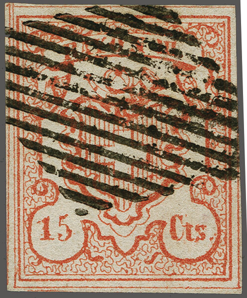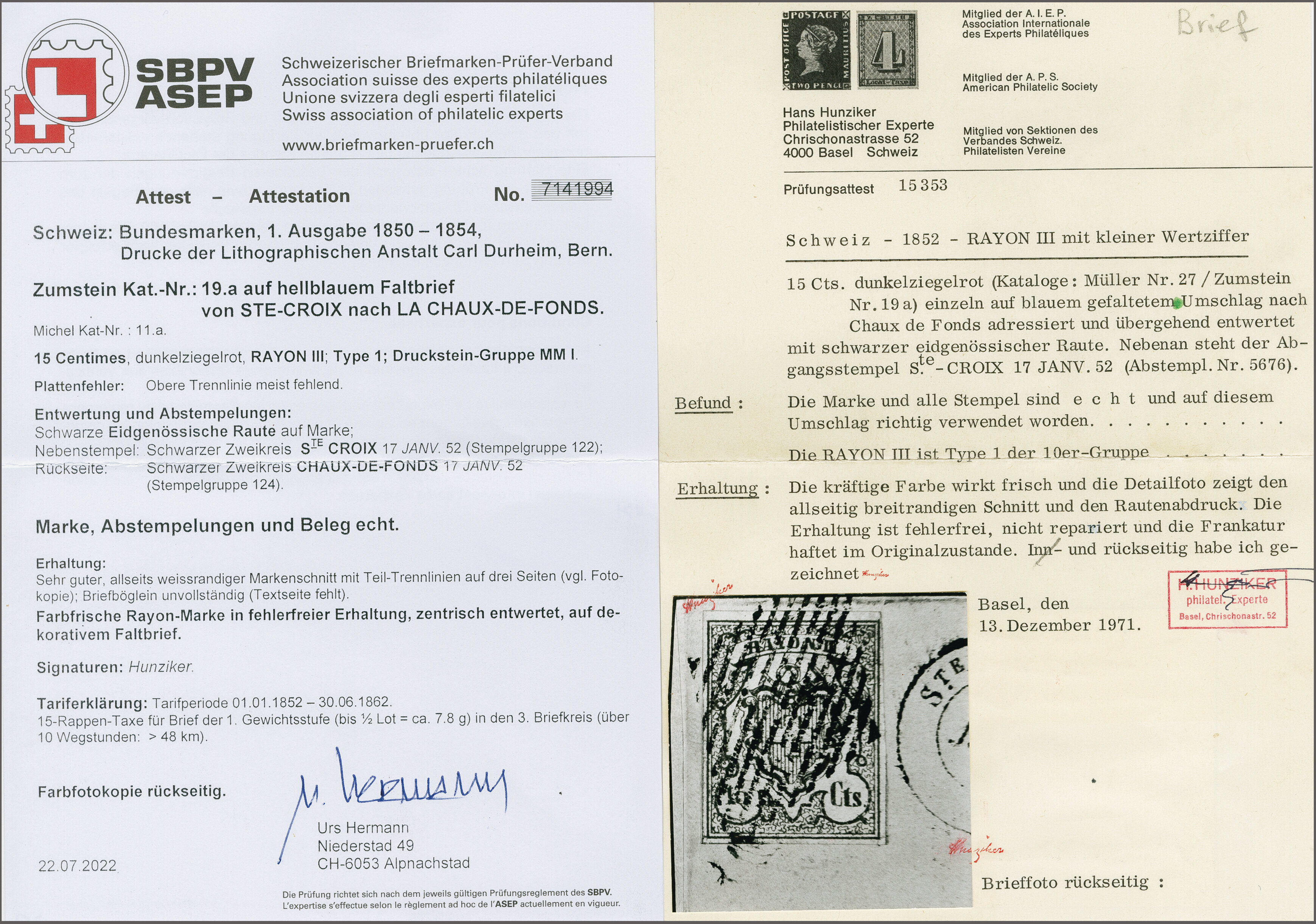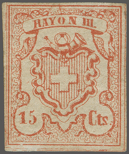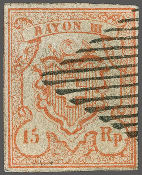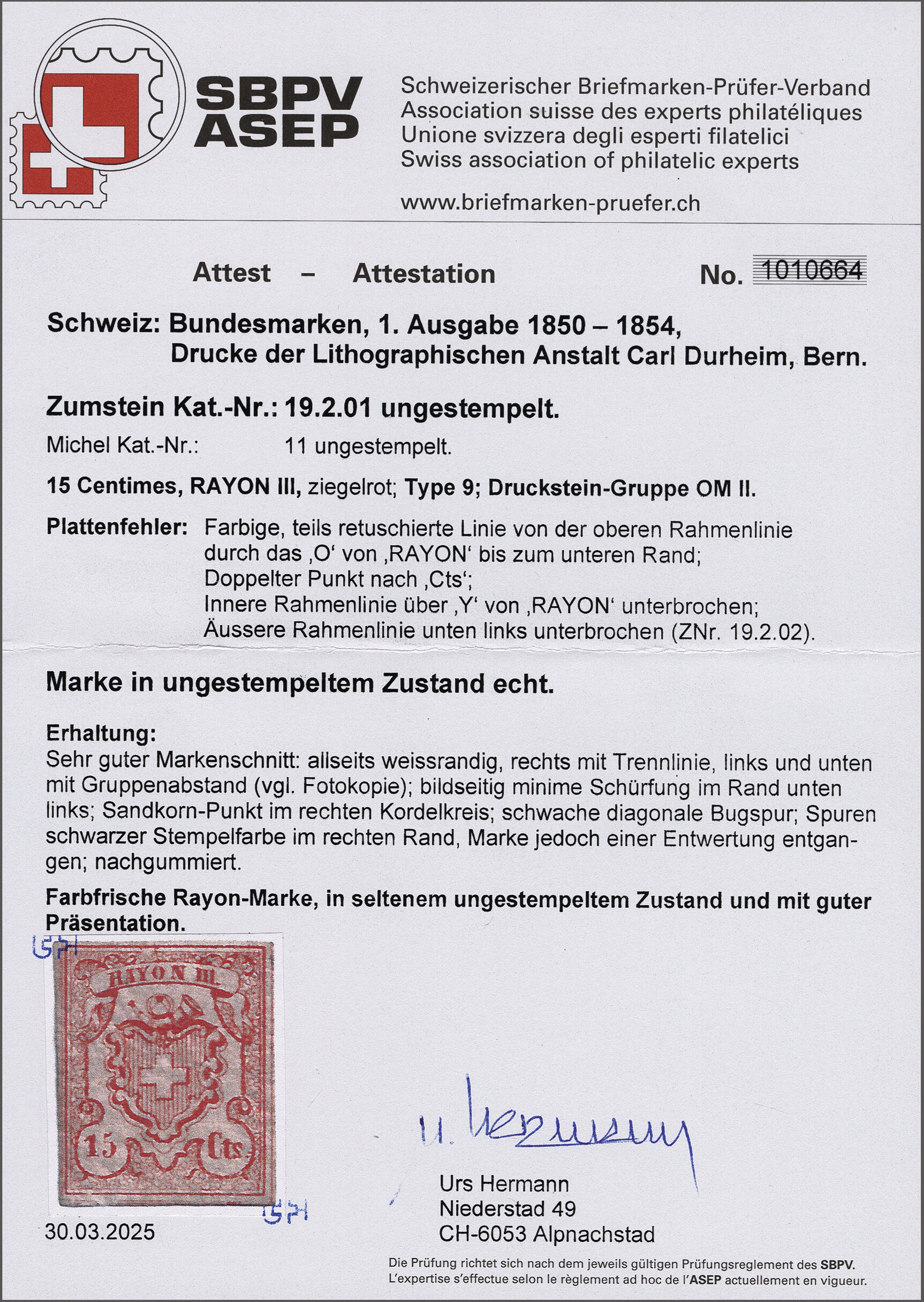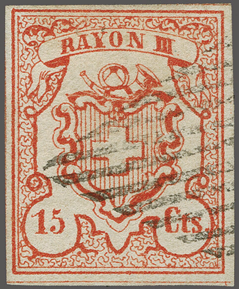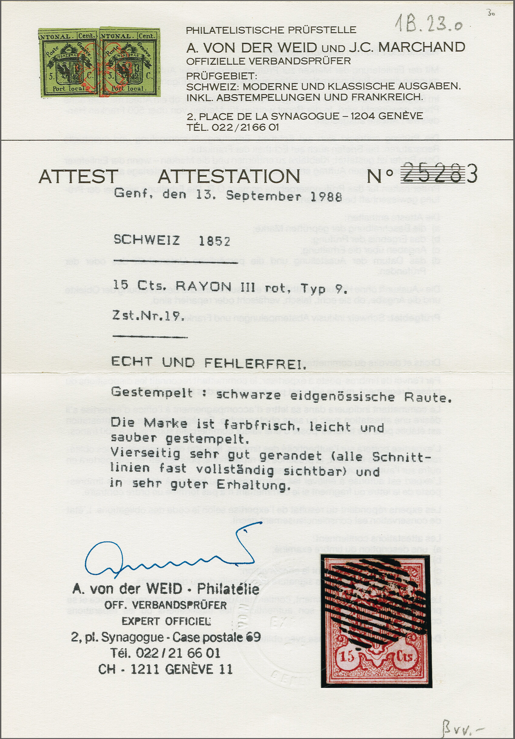 Centimes: Type 9, farbfr. und breit- bis überrandig mit vollständiger Trennline der linken Nebengruppe, klar entw. mit schwarzer eidg. Raute. Attest von der Weid (1988). SBK=CHF 1'500. (Image 1)