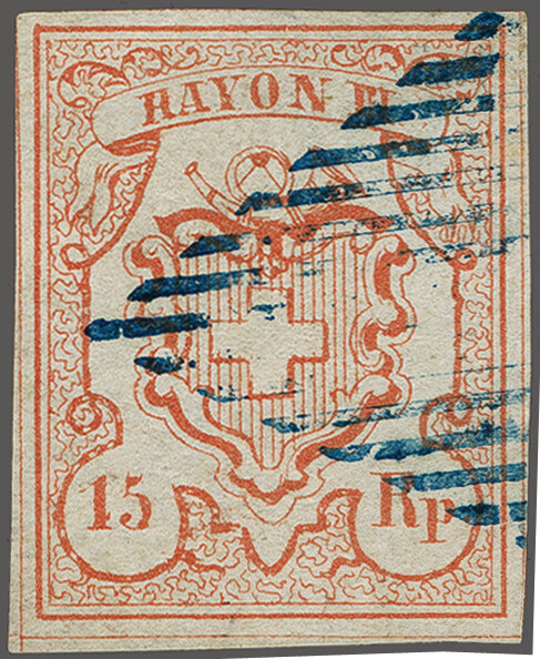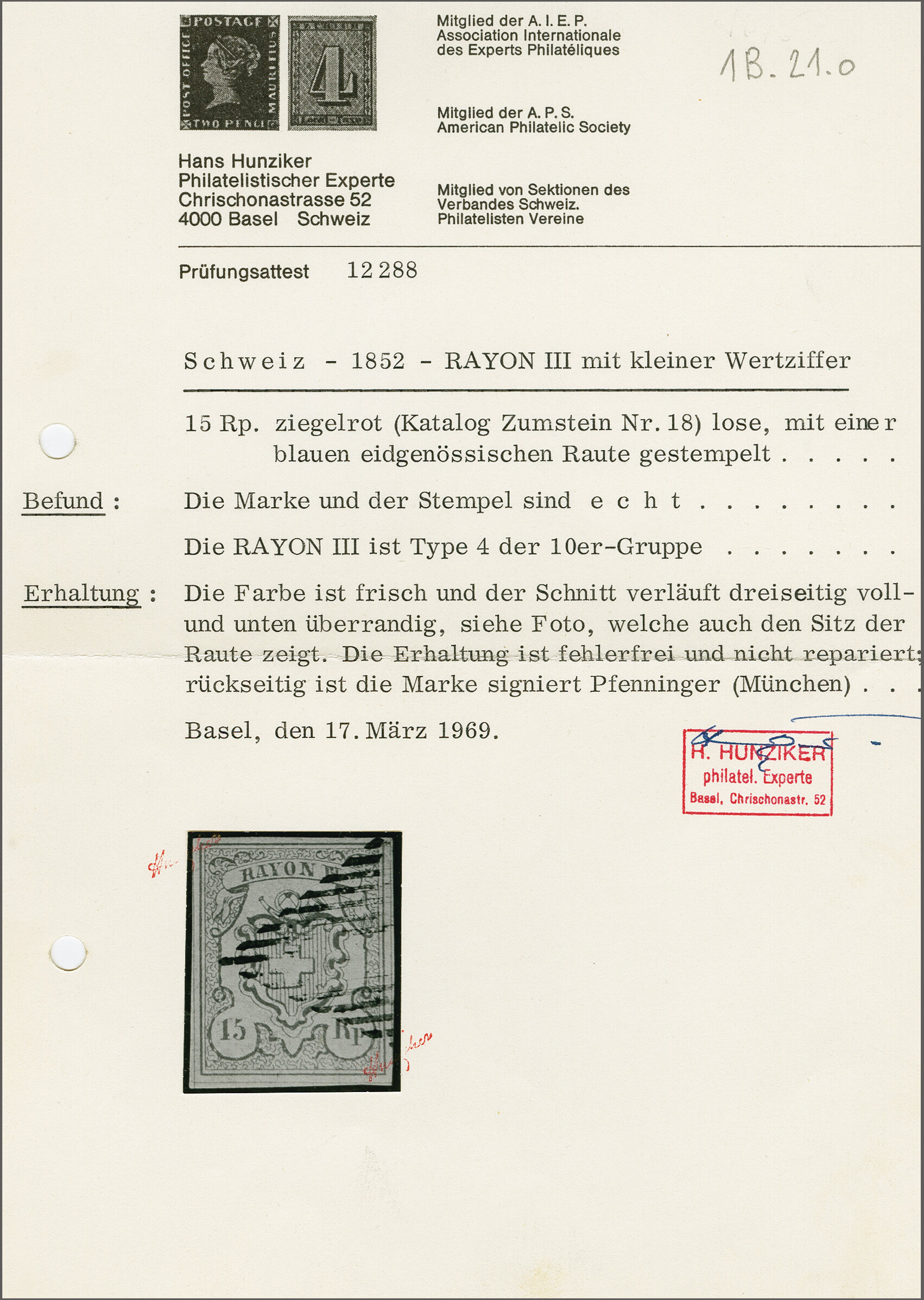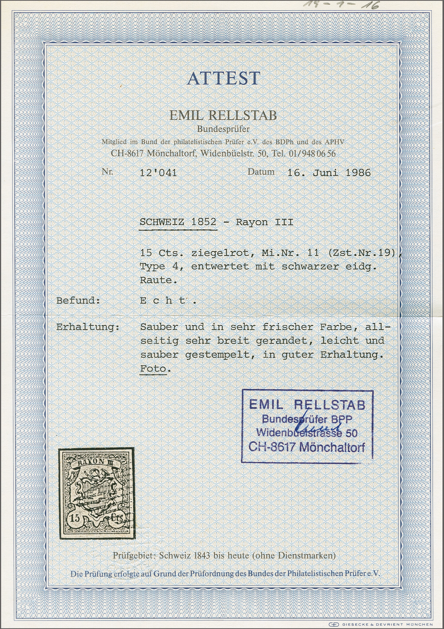 Kl. Wertziffer: Type 4, farbfr. und breit- bis überrandig, schön klar entw. mit halb aufgesetzter blauer eidg. Raute. Signiert Pfenninger, Attest Hunziker (1969). SBK=CHF 1'000. (Image 1)