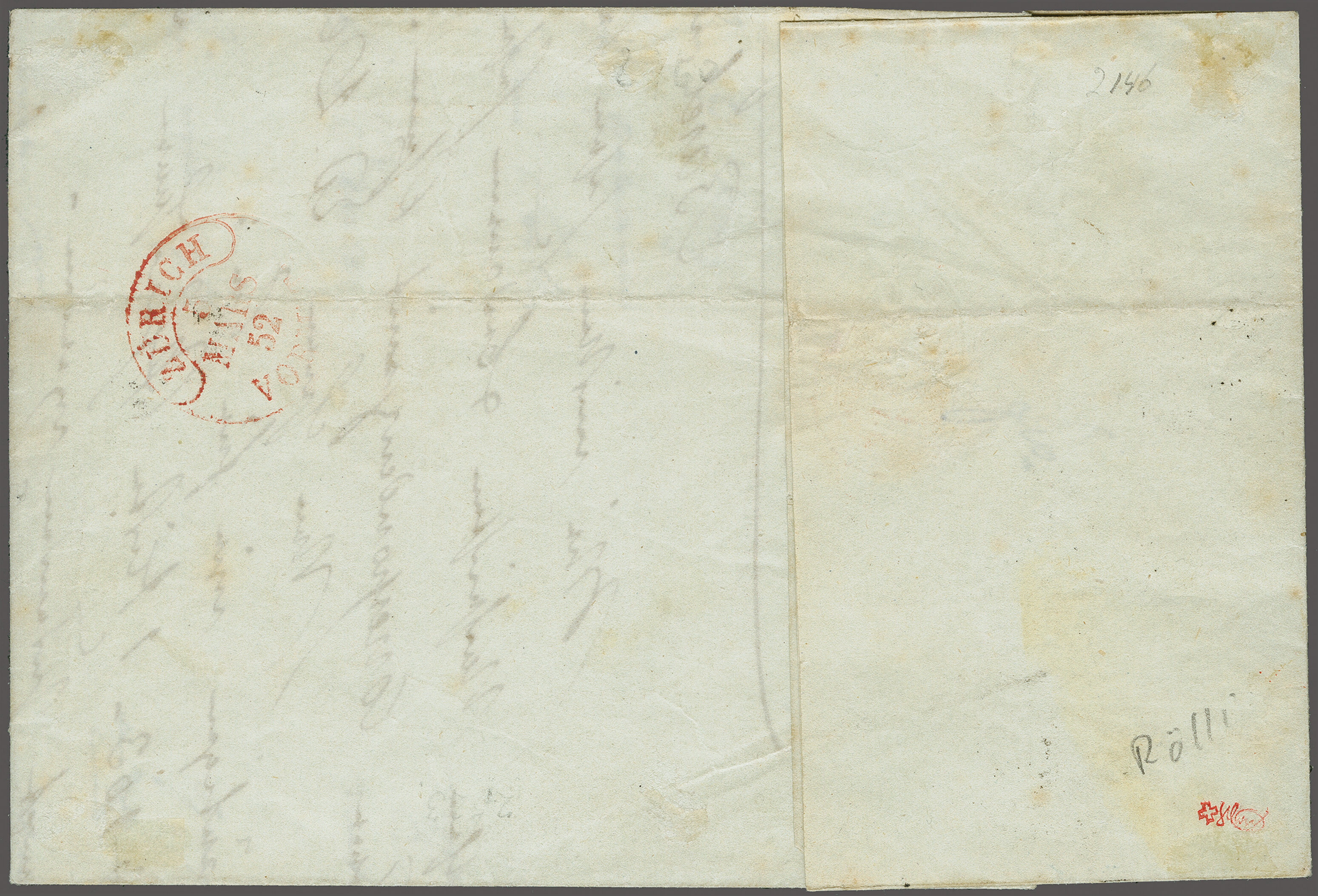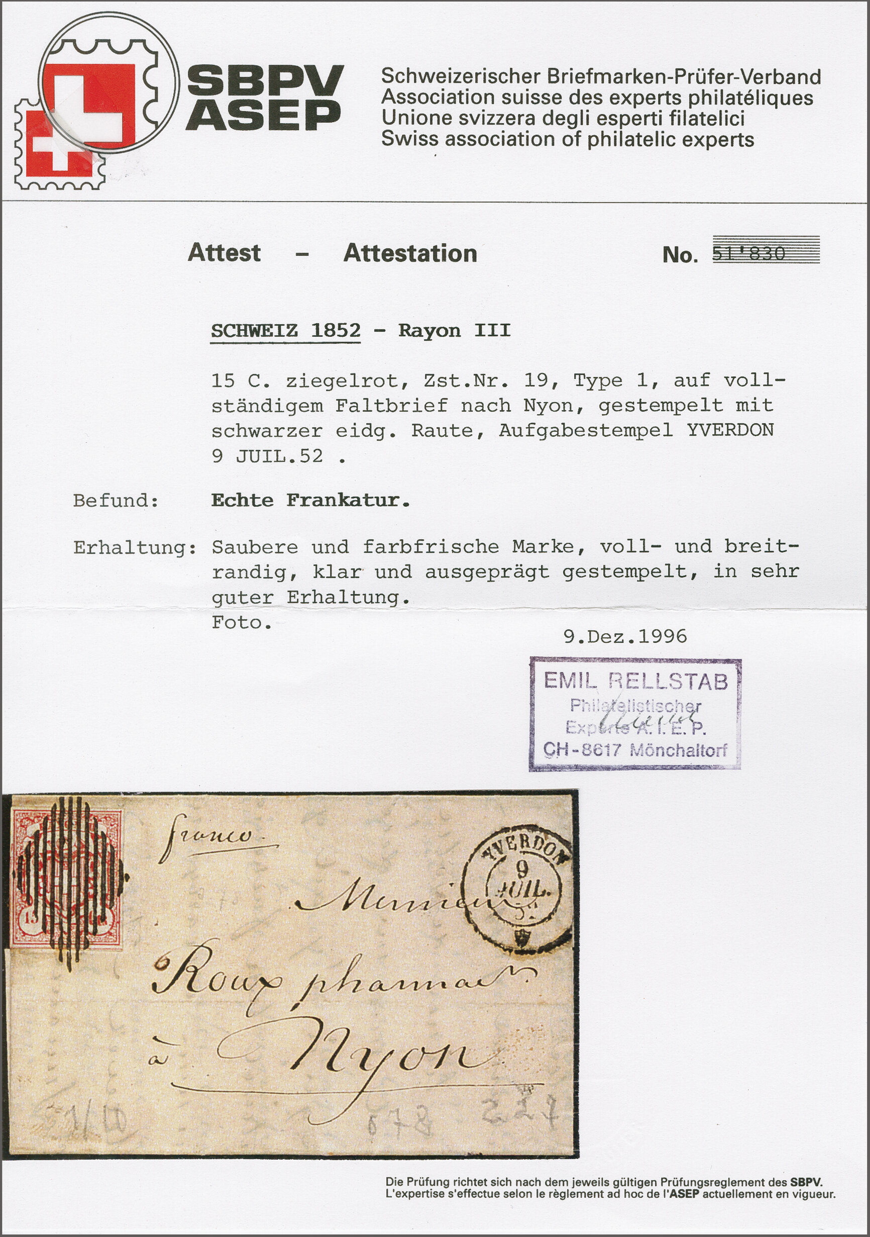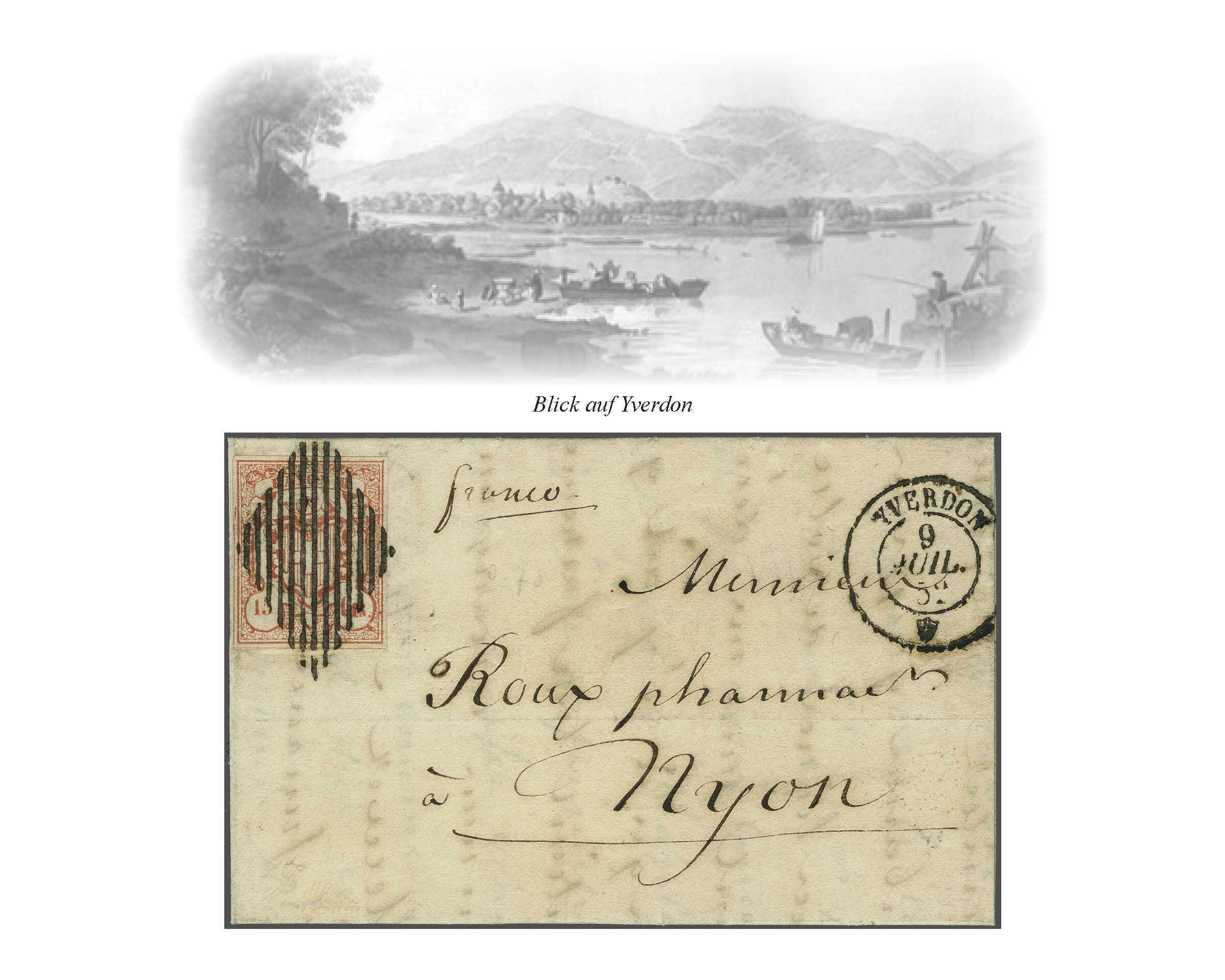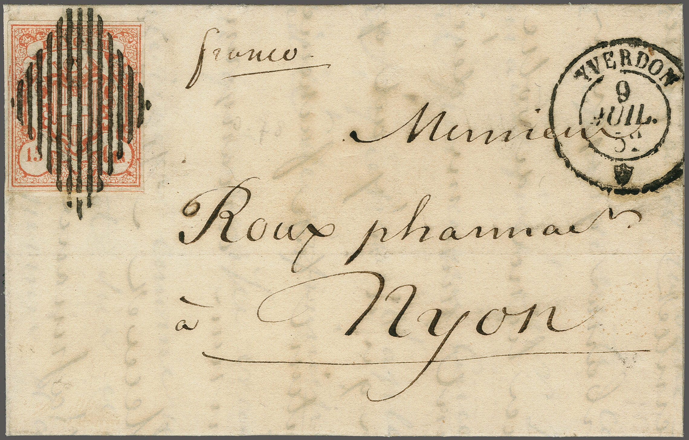 Farbe auf archivfrischem, dreiseitigem Faltbrieflein an den Apotheker Roux in Nyon. Rücks. Ankunftsstp. vom selben Tag. Ein auserlesenes Brieflein von kräftiger und ausgewogener Ästhetik; Attest Rellstab (1996). SBK=CHF 3'000. Provenienz: Sammlung