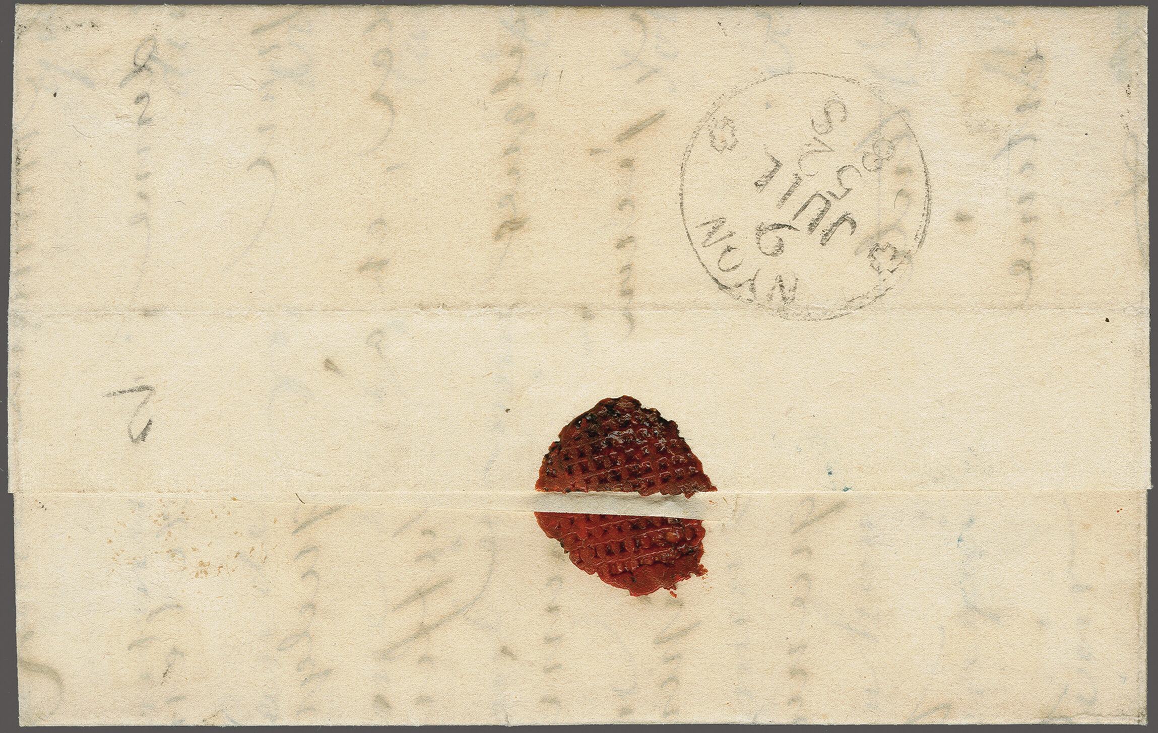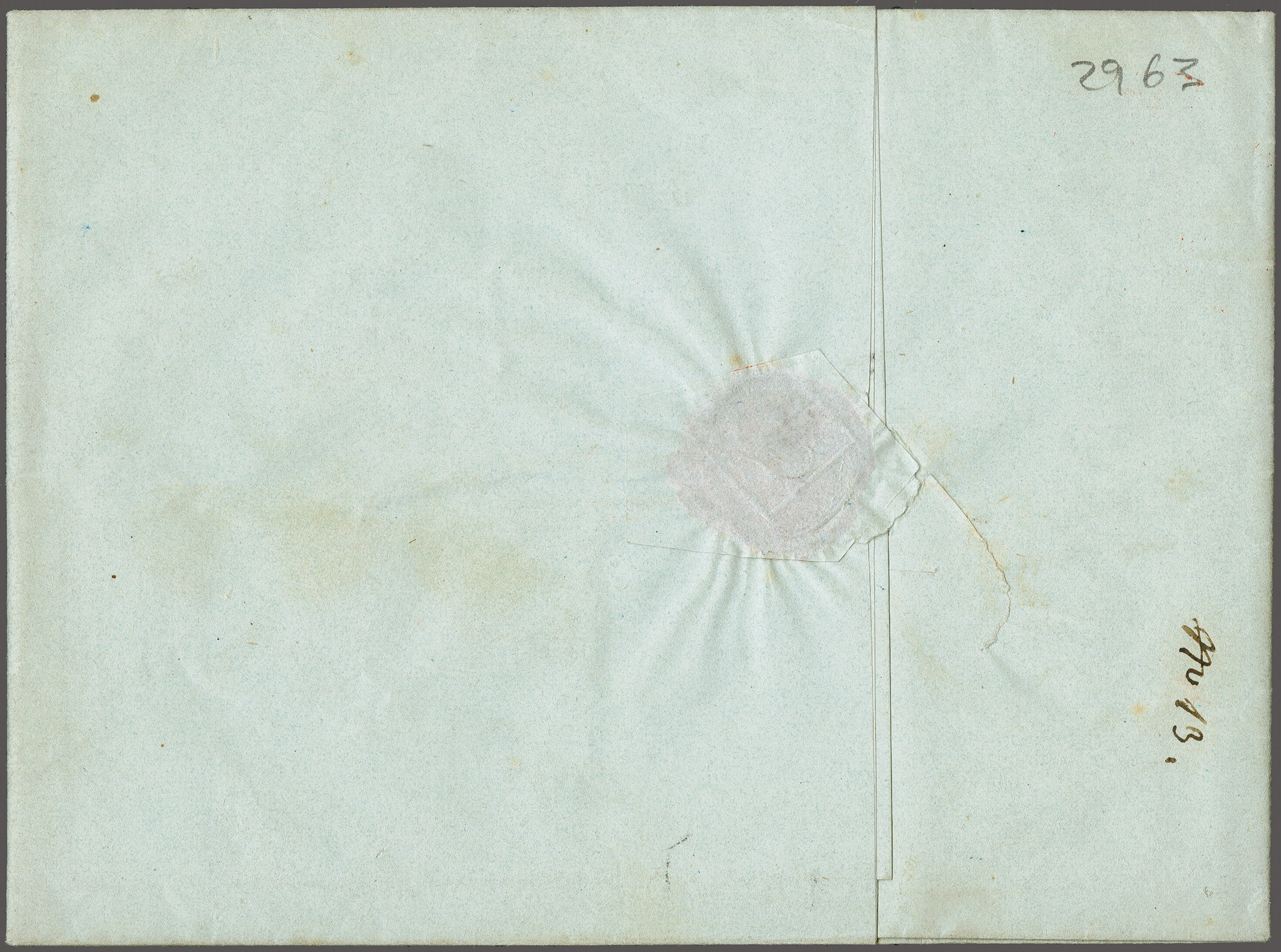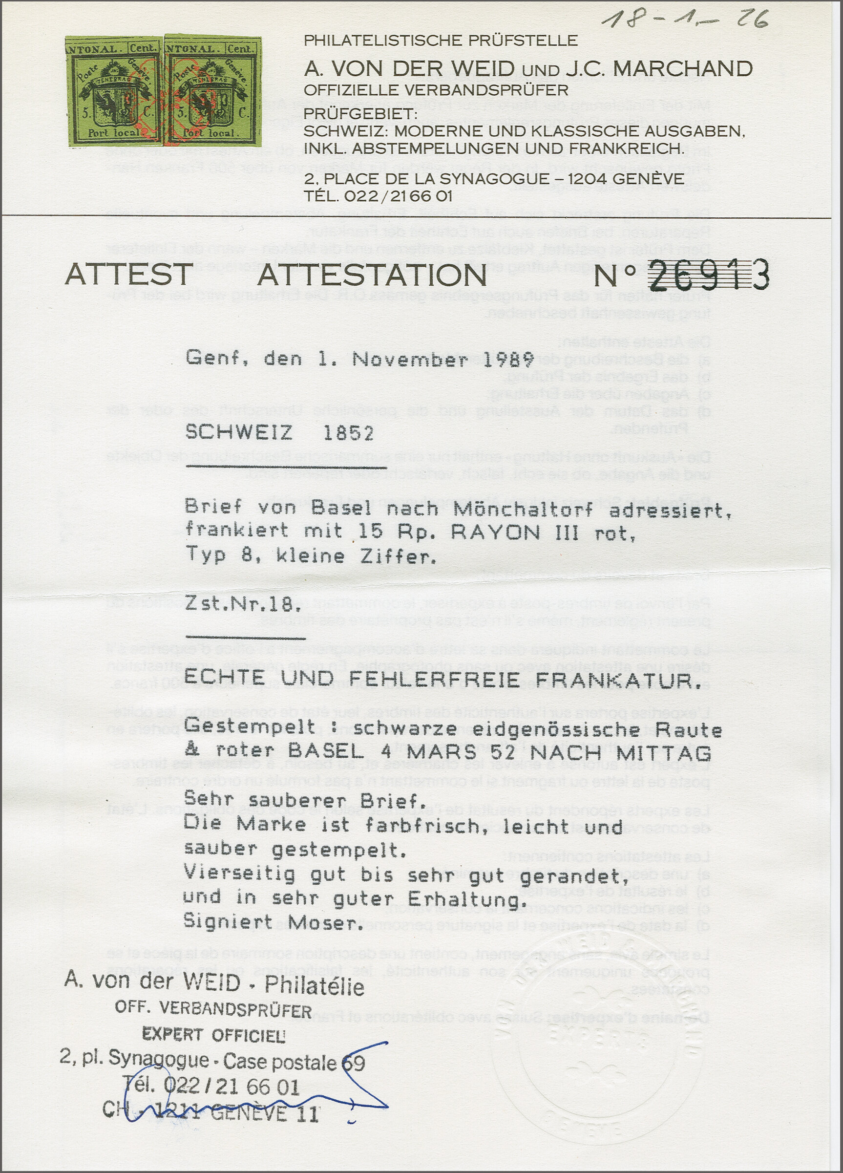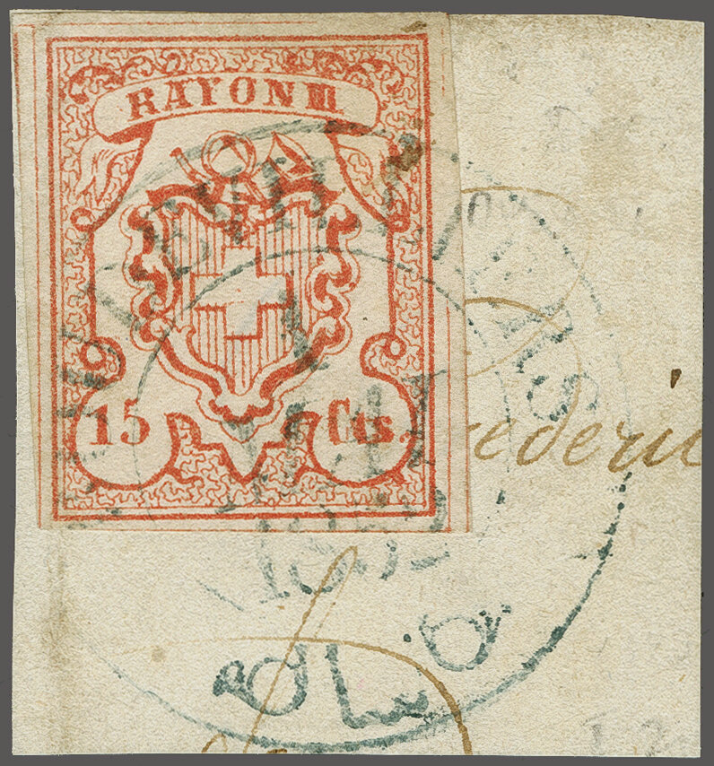Farbe auf archivfrischem, dreiseitigem Faltbrieflein an den Apotheker Roux in Nyon. Rücks. Ankunftsstp. vom selben Tag. Ein auserlesenes Brieflein von kräftiger und ausgewogener Ästhetik; Attest Rellstab (1996). SBK=CHF 3'000. Provenienz: Sammlung