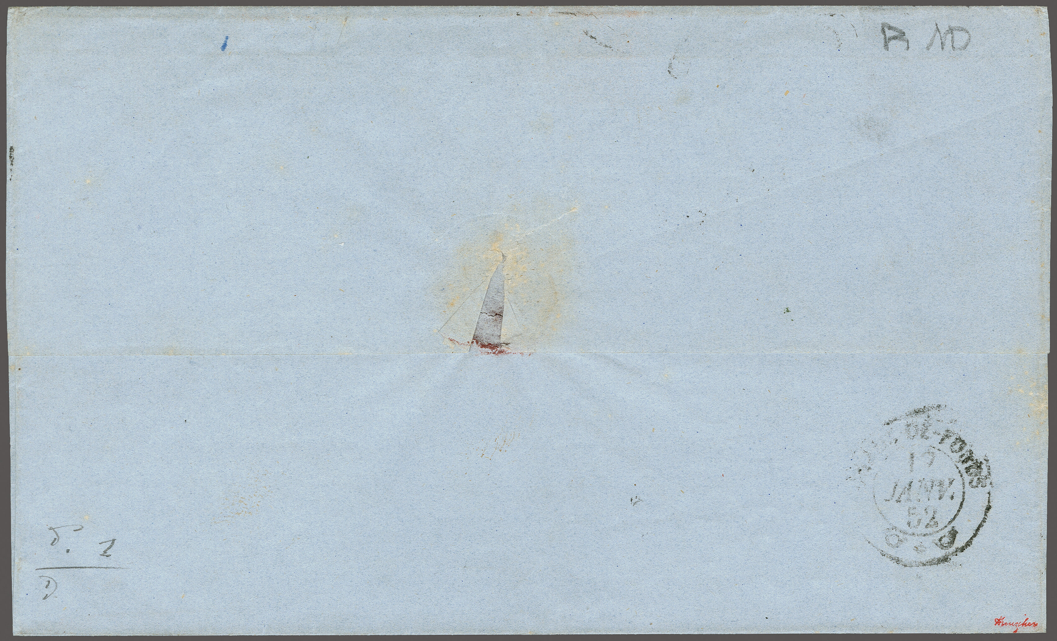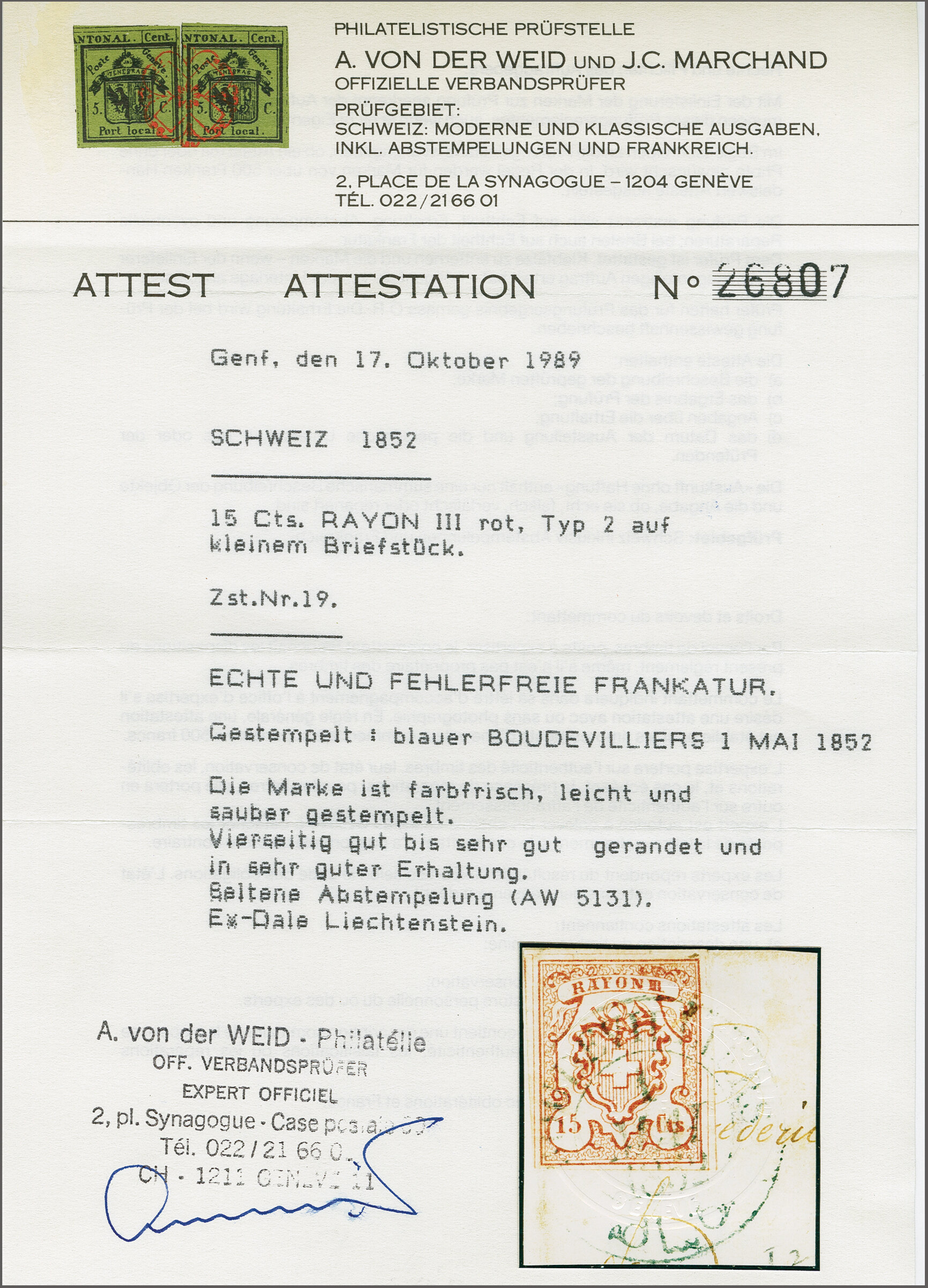Centimes: Type 2, farbfr. und breit- bis meist überrandig mit vierseitig sichtbaren Trennlinien und Teilen der linken Nebenmarke, zart und übergehend entw. mit gr. Zierkreisstempel "BOUDEVILLIERS 1 MAI 1852" (AW Gr. 120) auf
