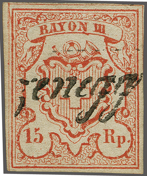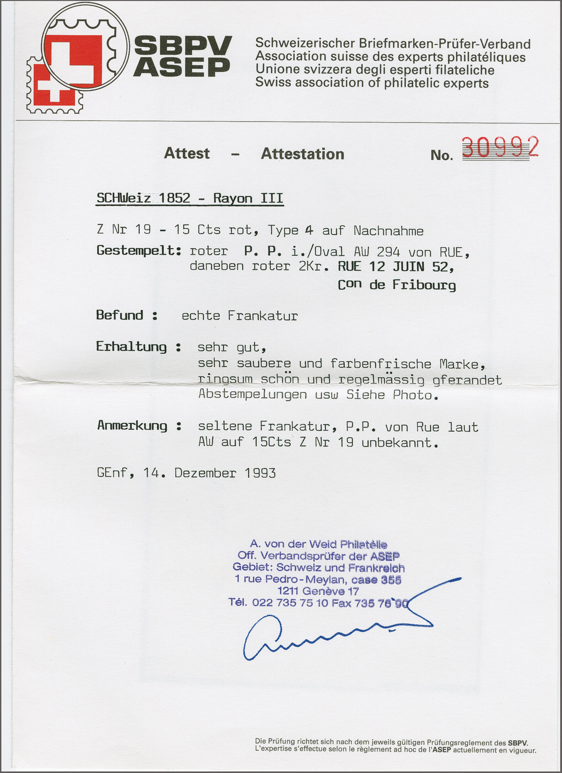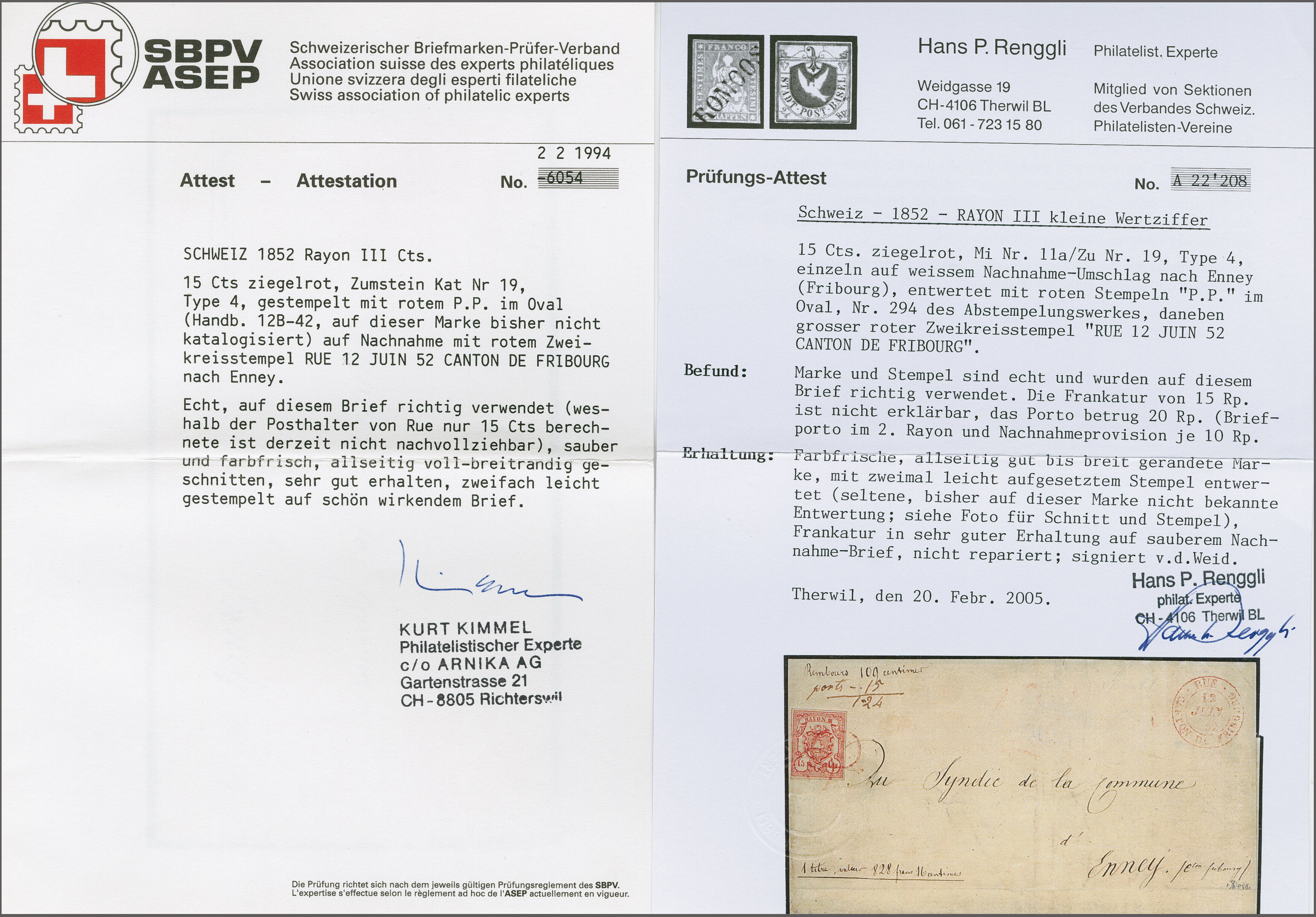 korrekterweise 20 Rp. betragen; vermutlich hatte der Posthalter von Rue diese Änderung aber gerade nicht mehr präsent, weshalb er dem Absender lediglich 15 Rp. verrechnete. Eine seltene, im Abstemplungswerk auf Rayon III nicht gelistete Entwertung;