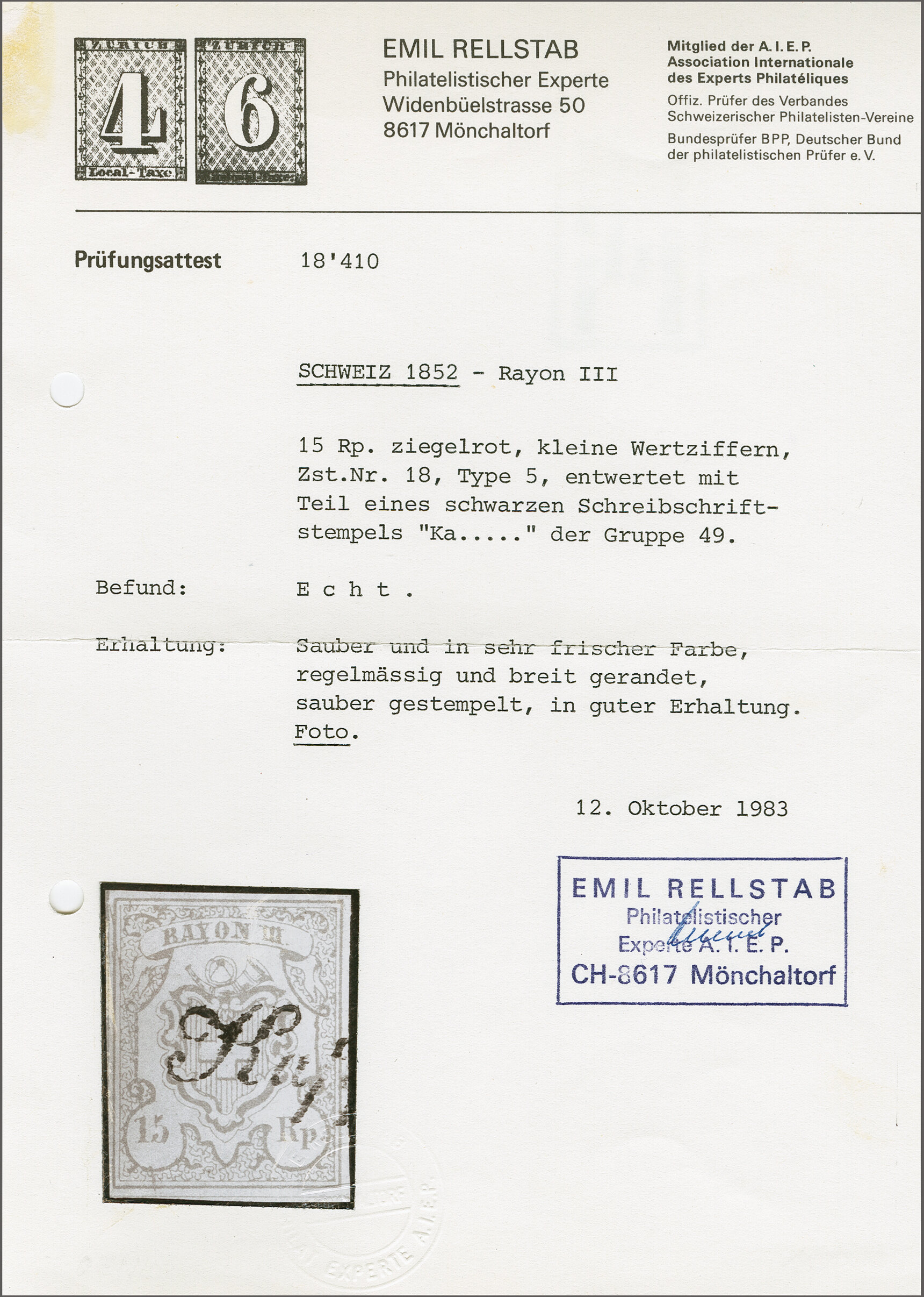 Centimes: Type 4, sehr farbfrisch und gleichmässig breitrandig, zartklar und sauber entw. mit der Spitze einer eidg. Raute in schwarz. Signiert Zumstein, Attest Rellstab (1986). SBK=CHF 1'500. (Image 1)
