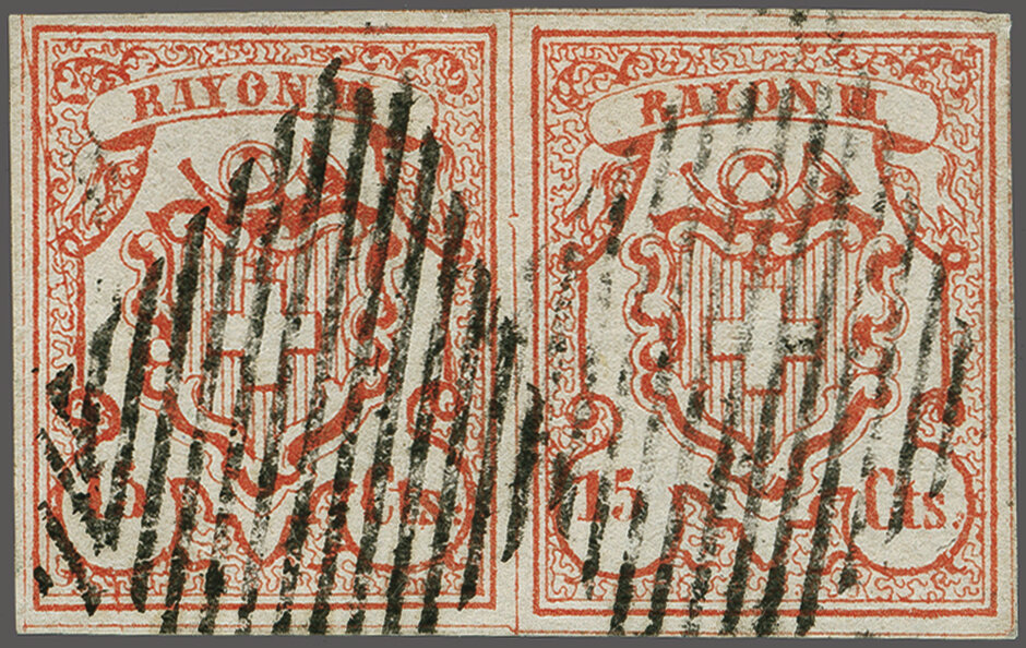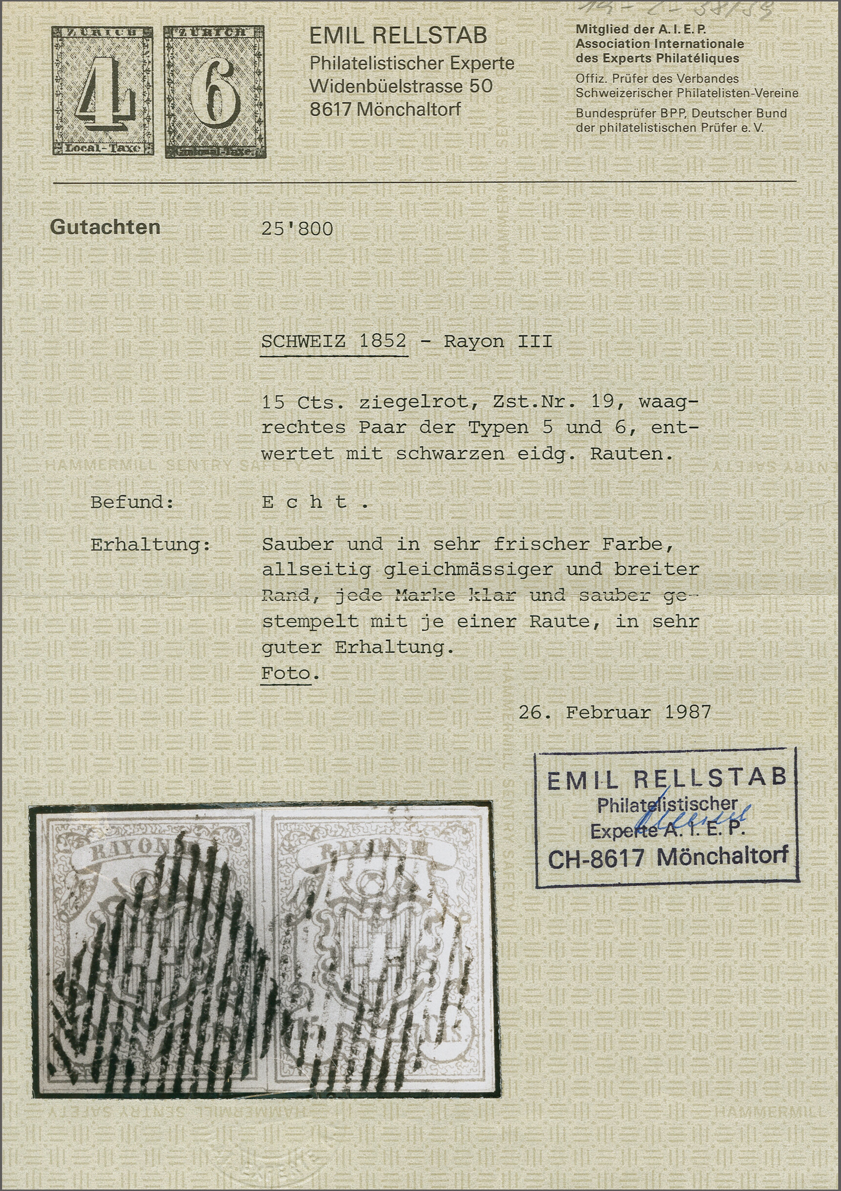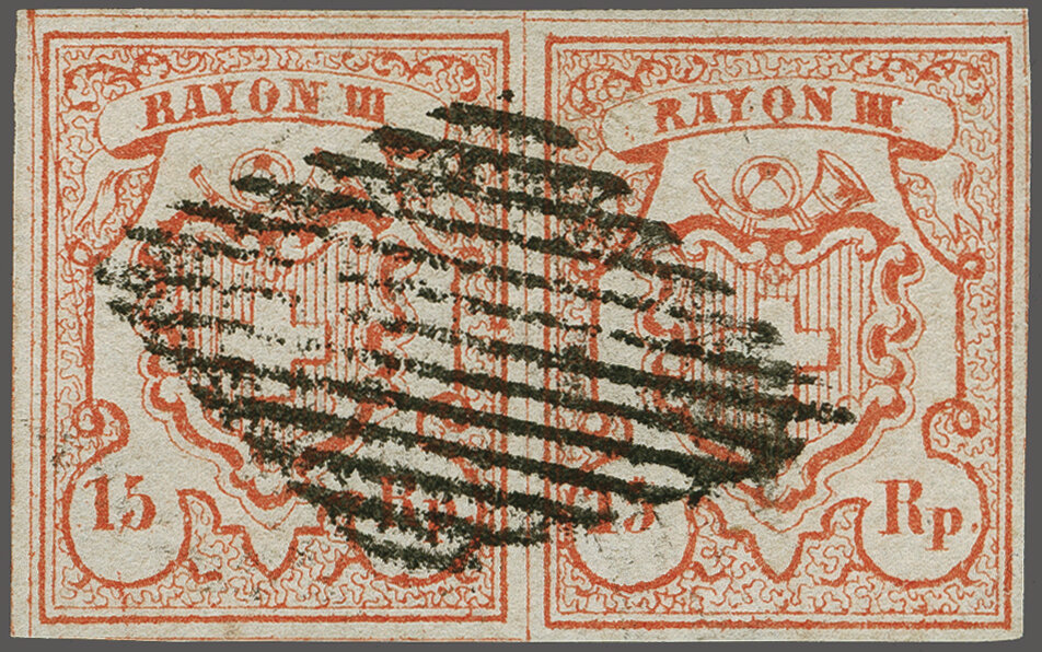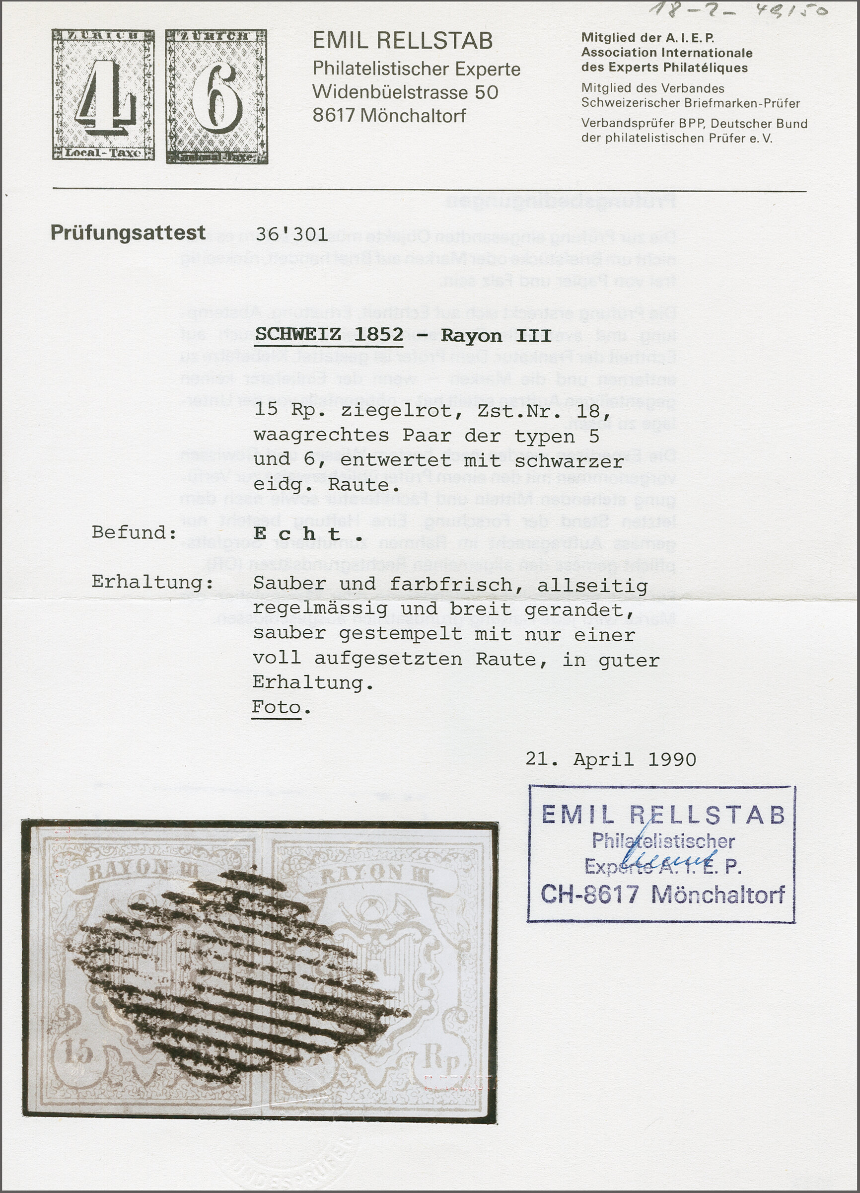 Centimes: Typen 5+6 im waagr. Paar, farbfr. und breitrandig mit vierseitig fast kompletten Trennlinien (unbed. Papierverletzung im Überrand rechts oben), jede Marke zartklar entw. mit schwarzer eidg. Raute. Attest Rellstab