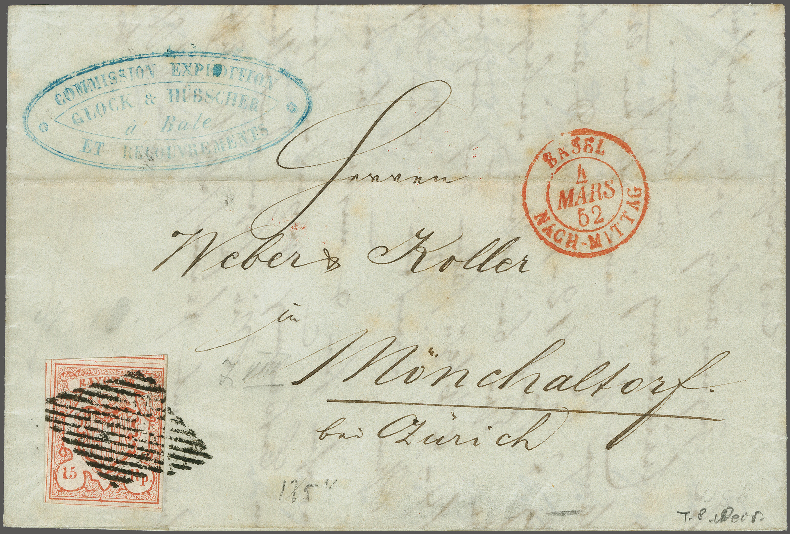 Firmenstempel "COMMISSION EXPEDITION / ET RECOUVREMENTS / GLOCK & HÜBSCHER / à Bale" auf vollständigem Faltbrief nach Mönchaltorf (ZH). Rücks. Transitstp. ZÜRICH 5. MARS. 52 VORMIT:". Eine besonders grosszügig geschnittene Marke; signiert Moser,