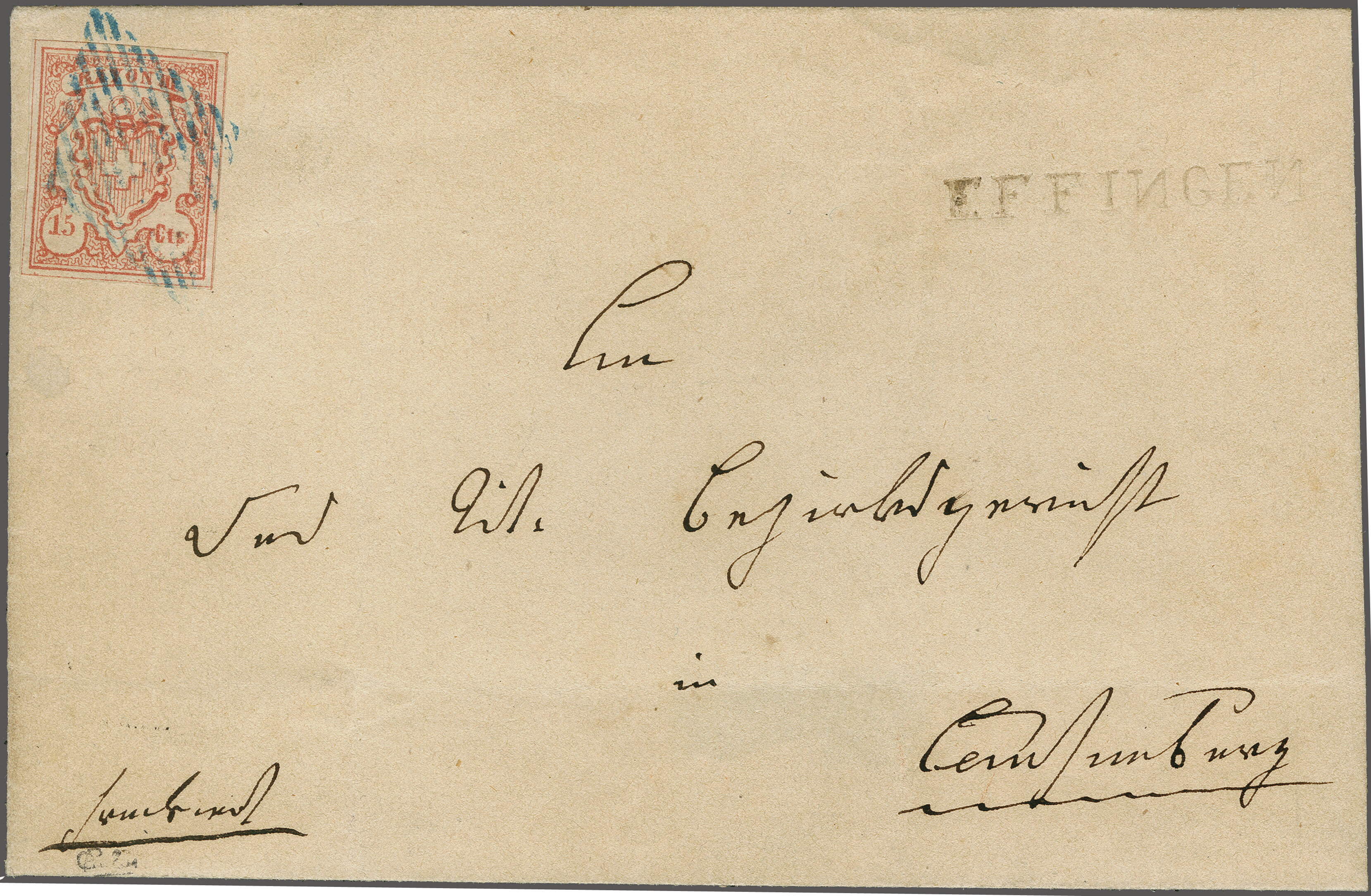 Centimes: Type 7, farbfr. und gleichmässig breitrandig mit vierseitig fast kompletten Trennlinien, zartklar und übergehend entw. mit blauer eidg. Raute mit nebenges. Stabstp. "EFFINGEN" mit spiegelverkehrten "N" (AW 1176) in
