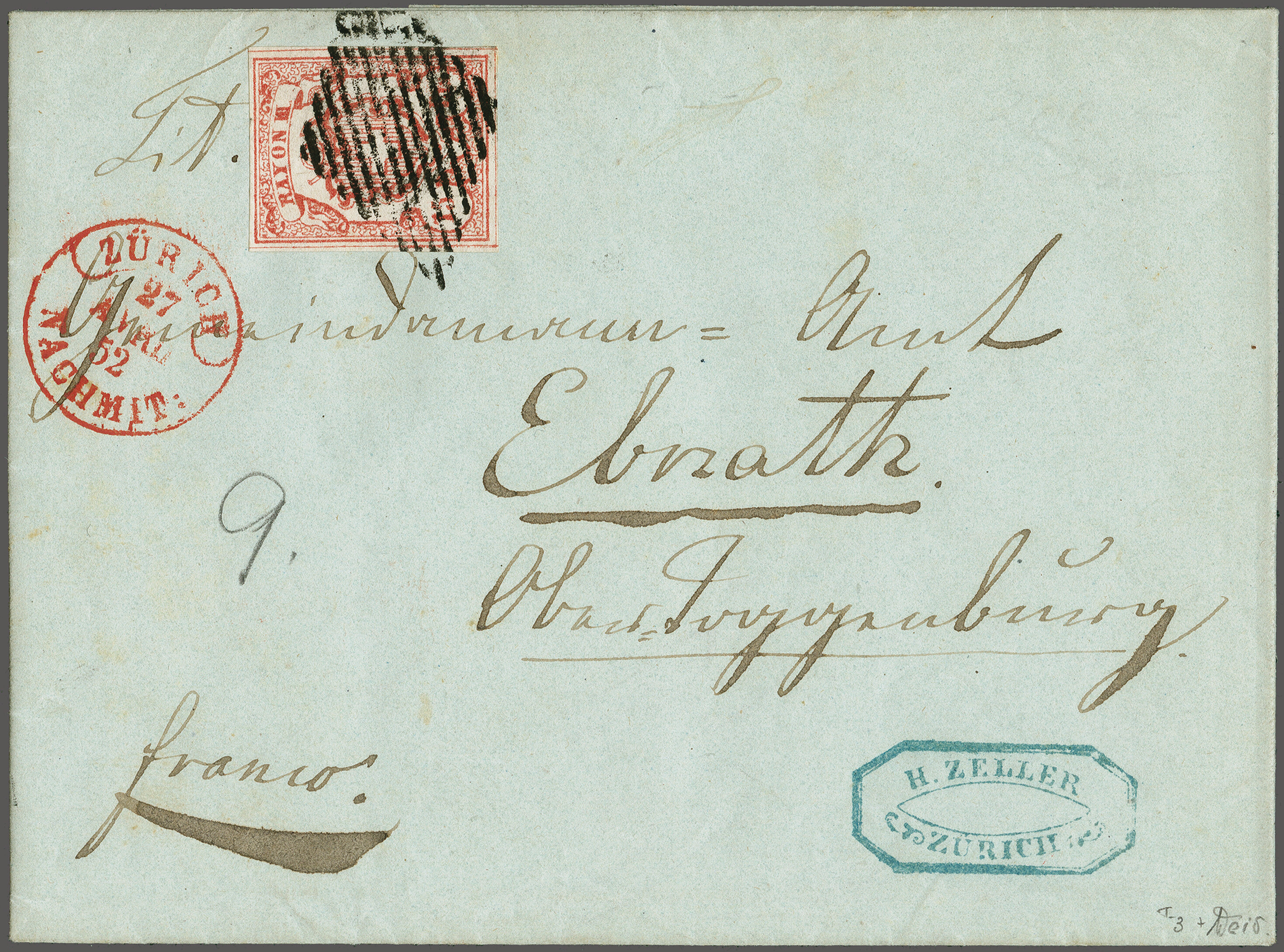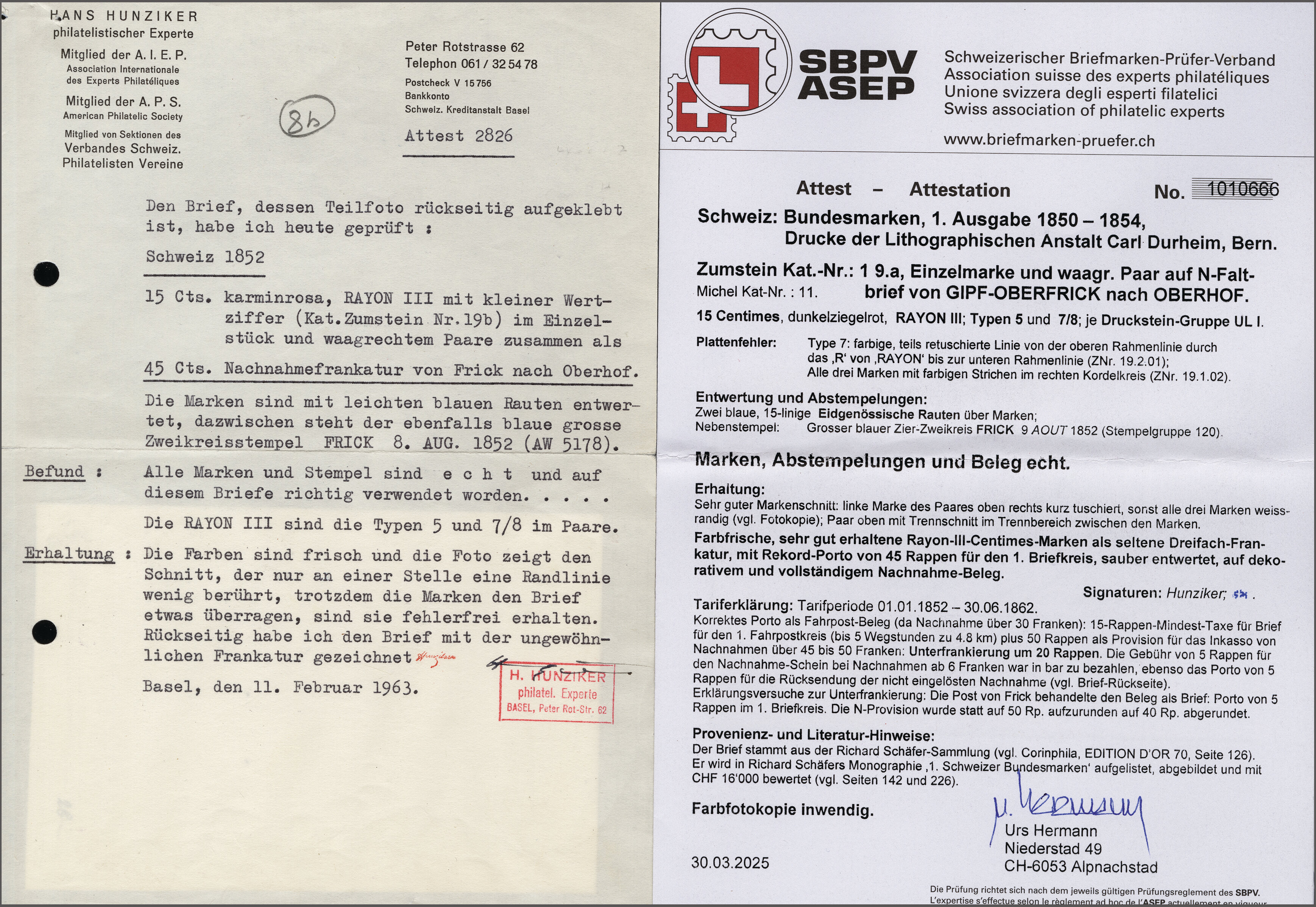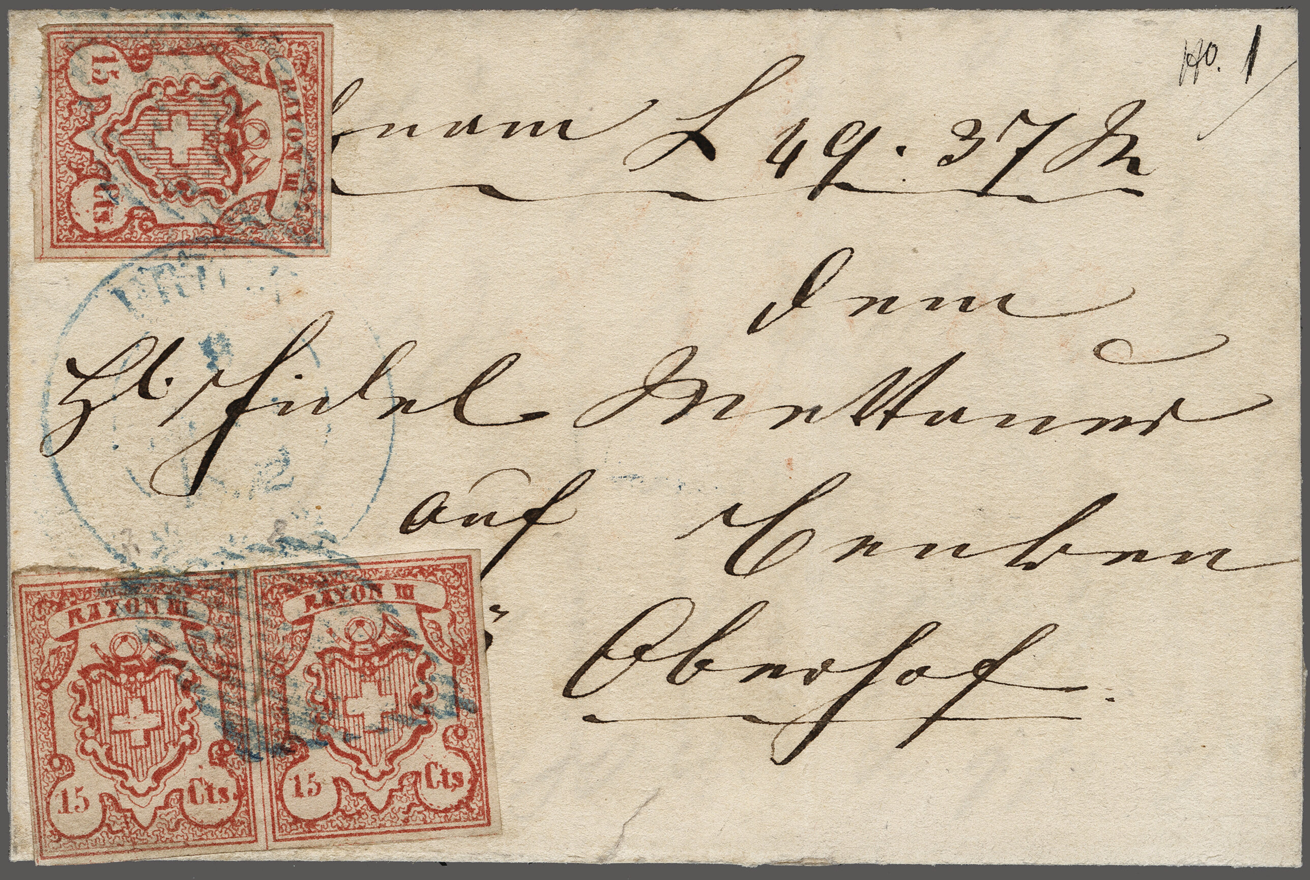 Briefkreis, die höchstbekannte Frankatur in diesem Rayon, Atteste Hunziker (1963), Marchand (1996), Hermann (2025) SBK = CHF 18'000 für einen Dreierstreifen / Schäfer Bundesmarken = CHF 16'000. Bemerkung: Der Brief scheint weder bei einem Versand