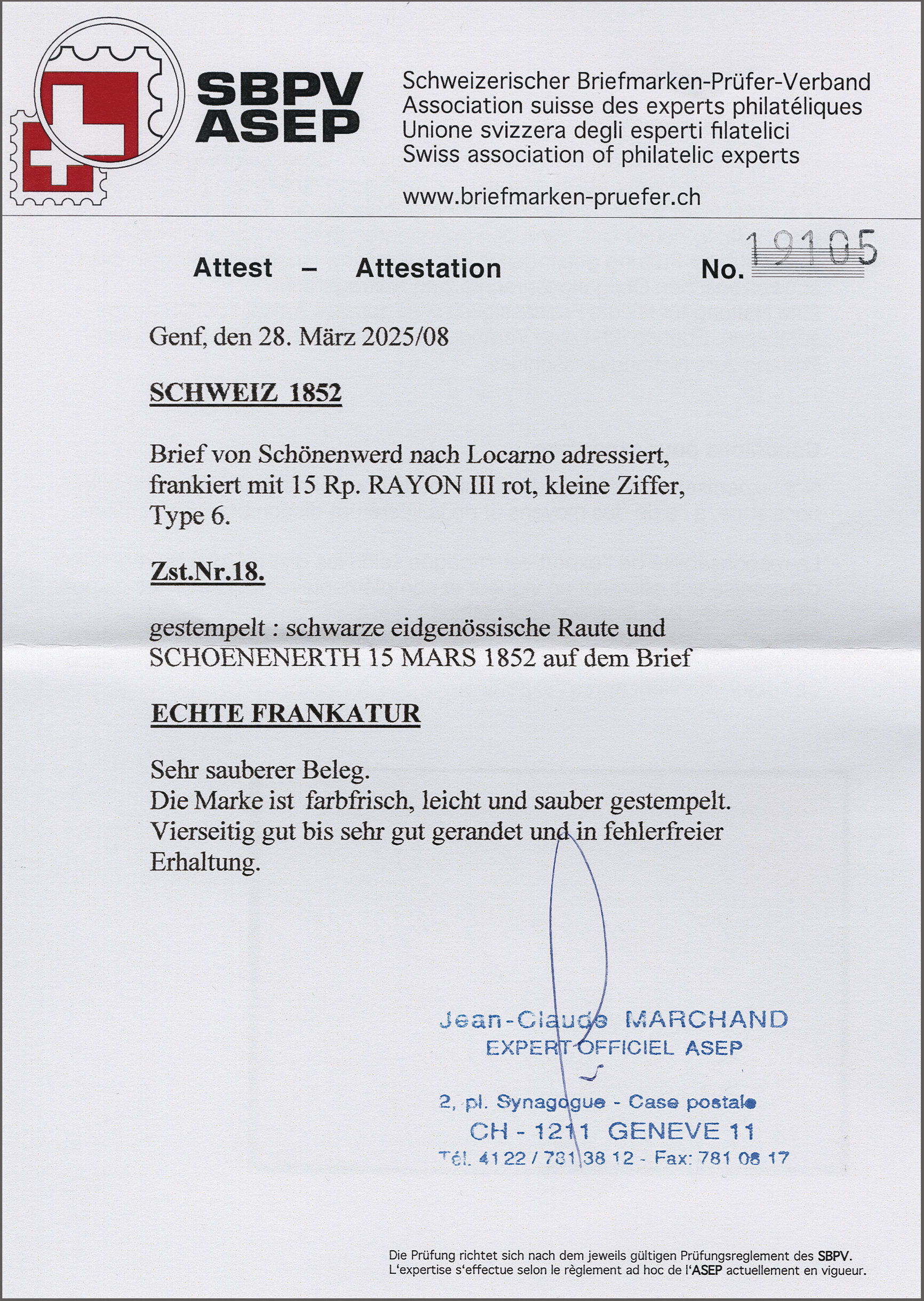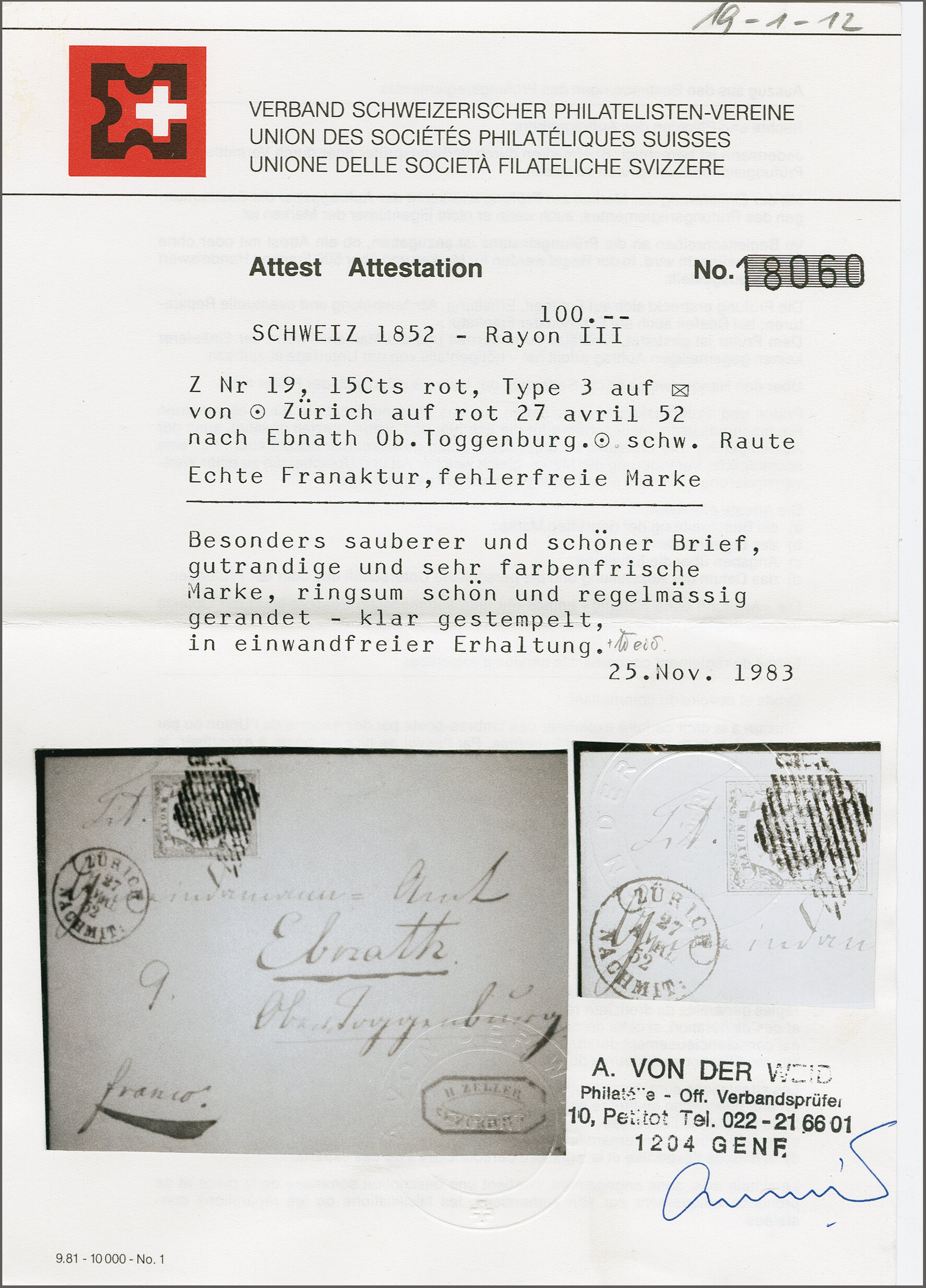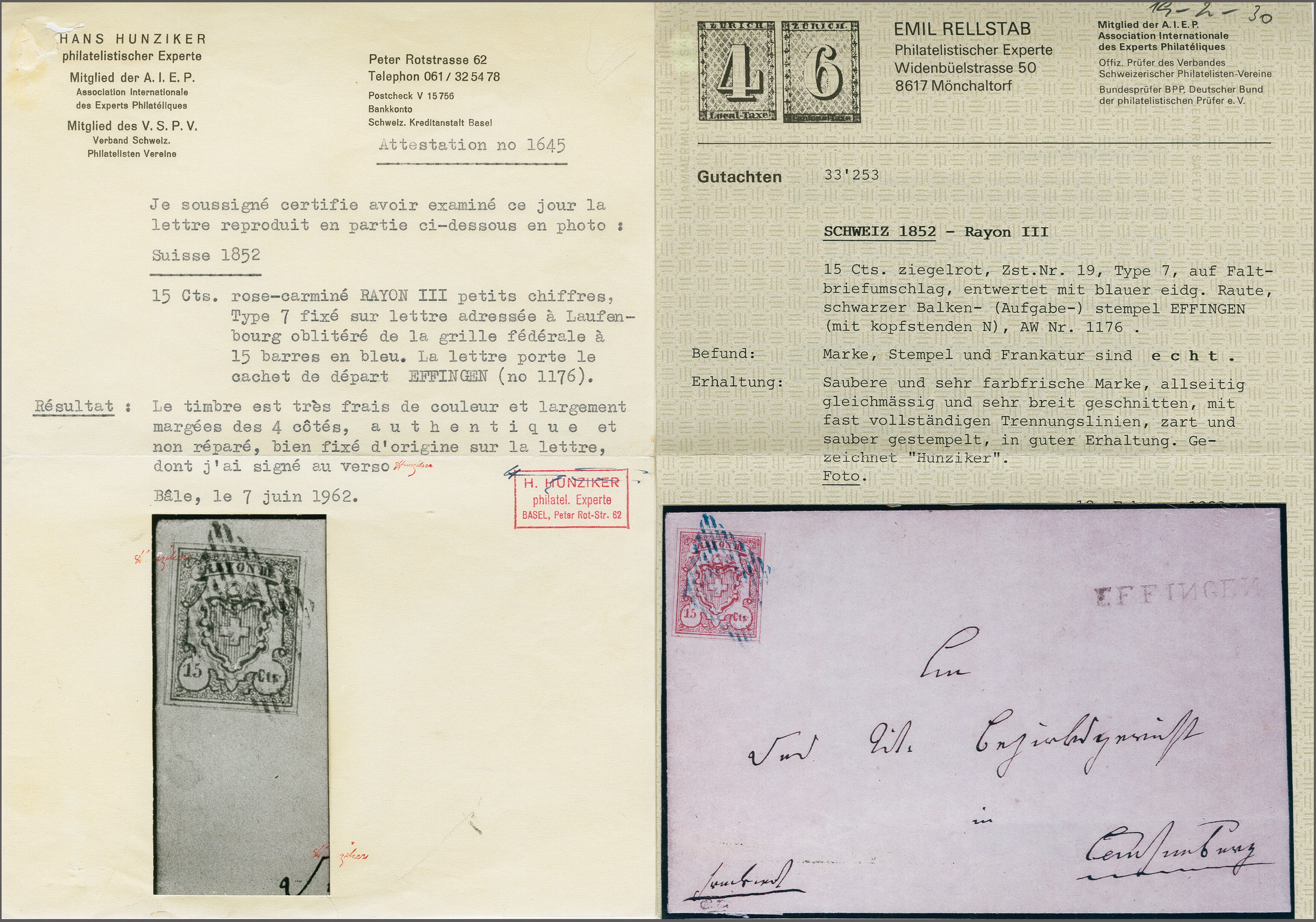 Briefkreis, die höchstbekannte Frankatur in diesem Rayon, Atteste Hunziker (1963), Marchand (1996), Hermann (2025) SBK = CHF 18'000 für einen Dreierstreifen / Schäfer Bundesmarken = CHF 16'000. Bemerkung: Der Brief scheint weder bei einem Versand