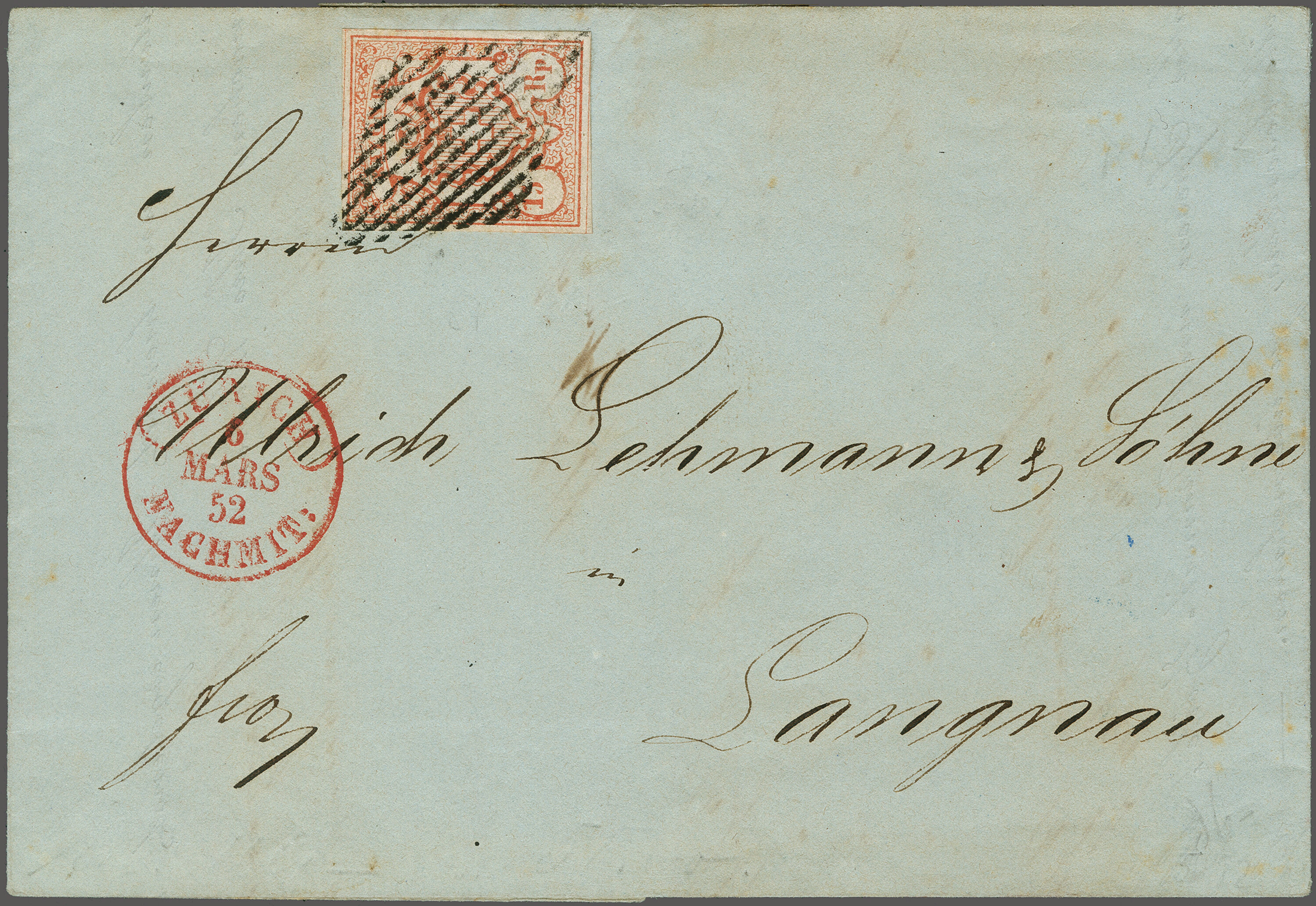 Kl. Wertziffer: Type 6, farbr. und breit- bis überrandig, klar und übergehend entw. mit schwarzer eidg. Raute mit nebenges. Zierlinienstempel "ZÜRICH 6 MARS 52 NACHMIT:" in rot auf frischem Forwarded-Faltbrief datiert