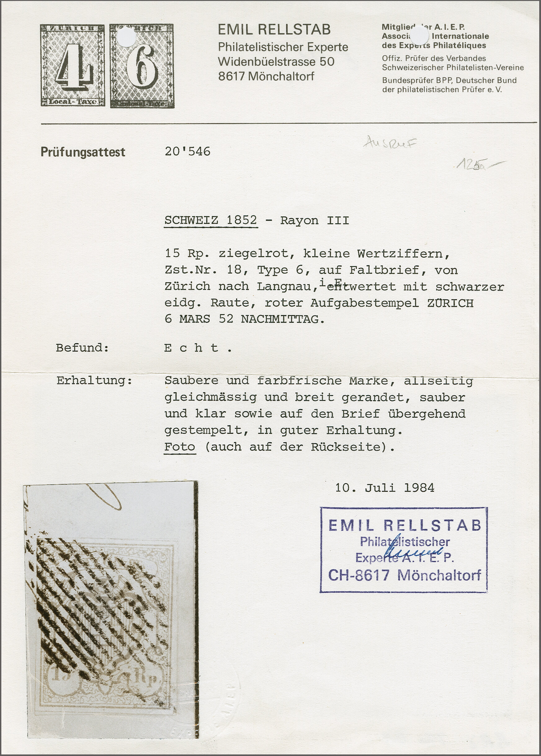 aufgesetzt entw. mit einem einzigen Abschlag der schwarzen eidg. Raute. Attest Rellstab (1990). SBK=CHF 2'400. (Image 1)