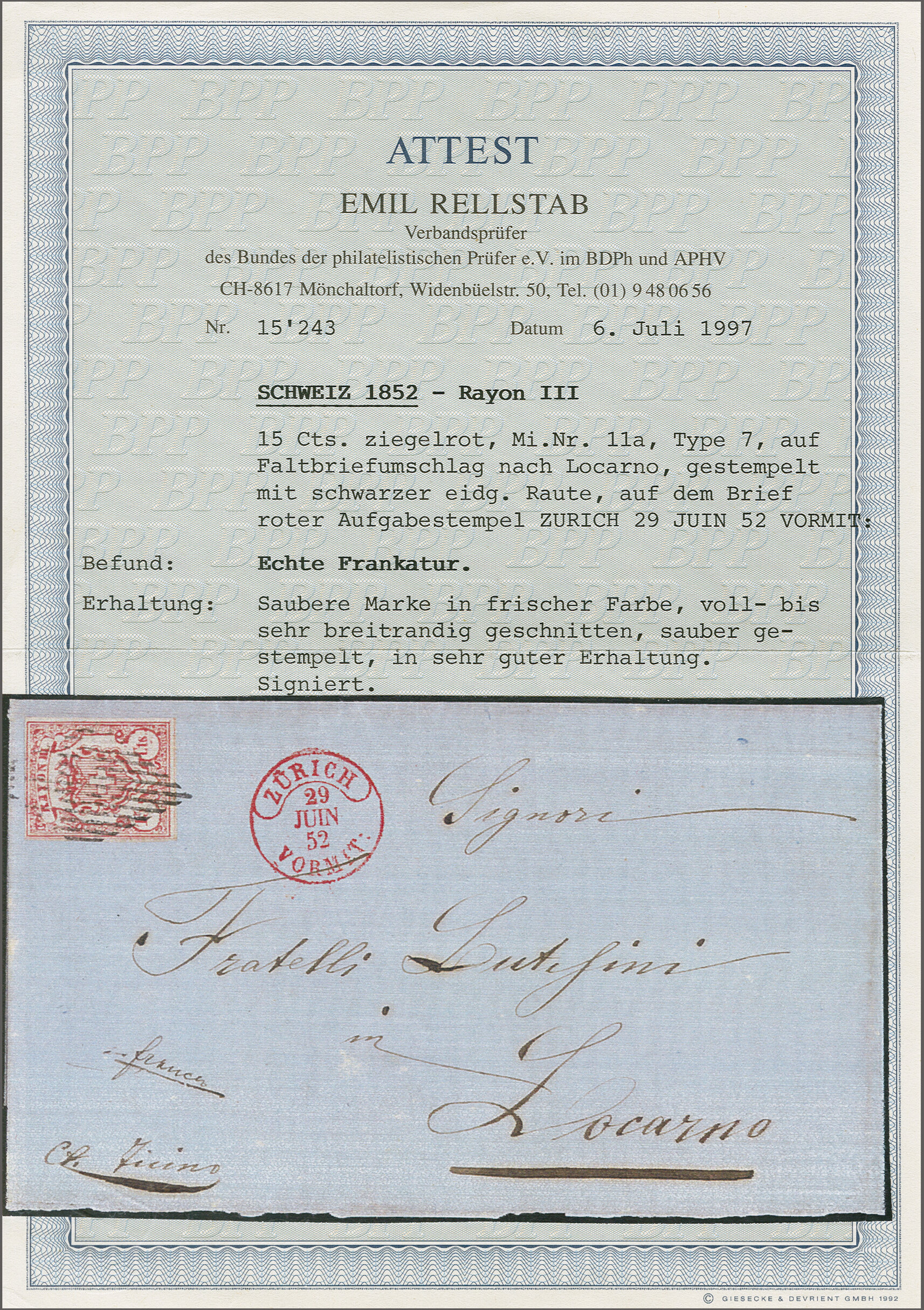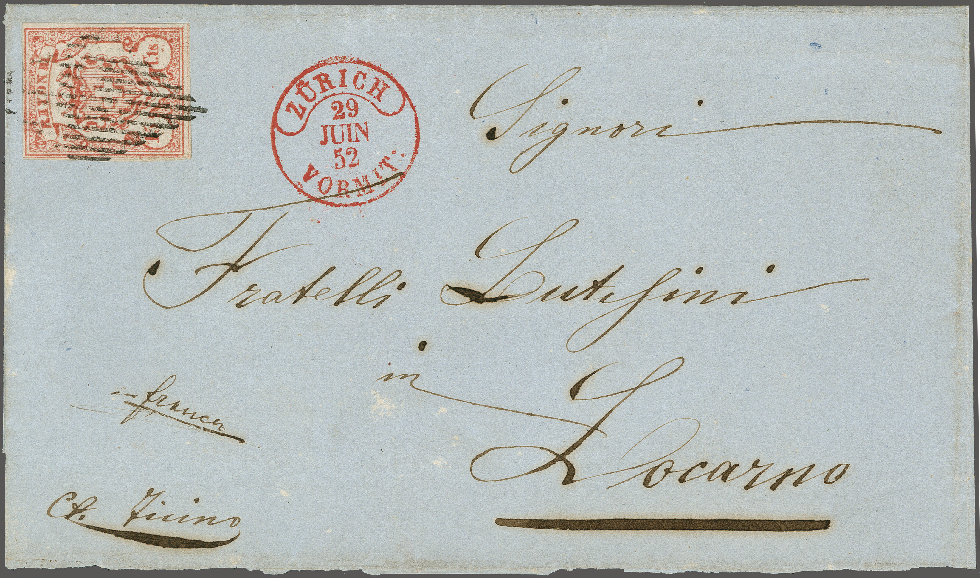 Centimes: Type 7. farbfr. und breit- bis überrandig, klar und übergehend entw. mit schwarzer eidg. Raute mit beigefügtem Zierlinienstempel "ZÜRICH 29 JUIN 52 VORMIT:" in rot auf Faltbriefhülle (unvollständig) nach Locarno