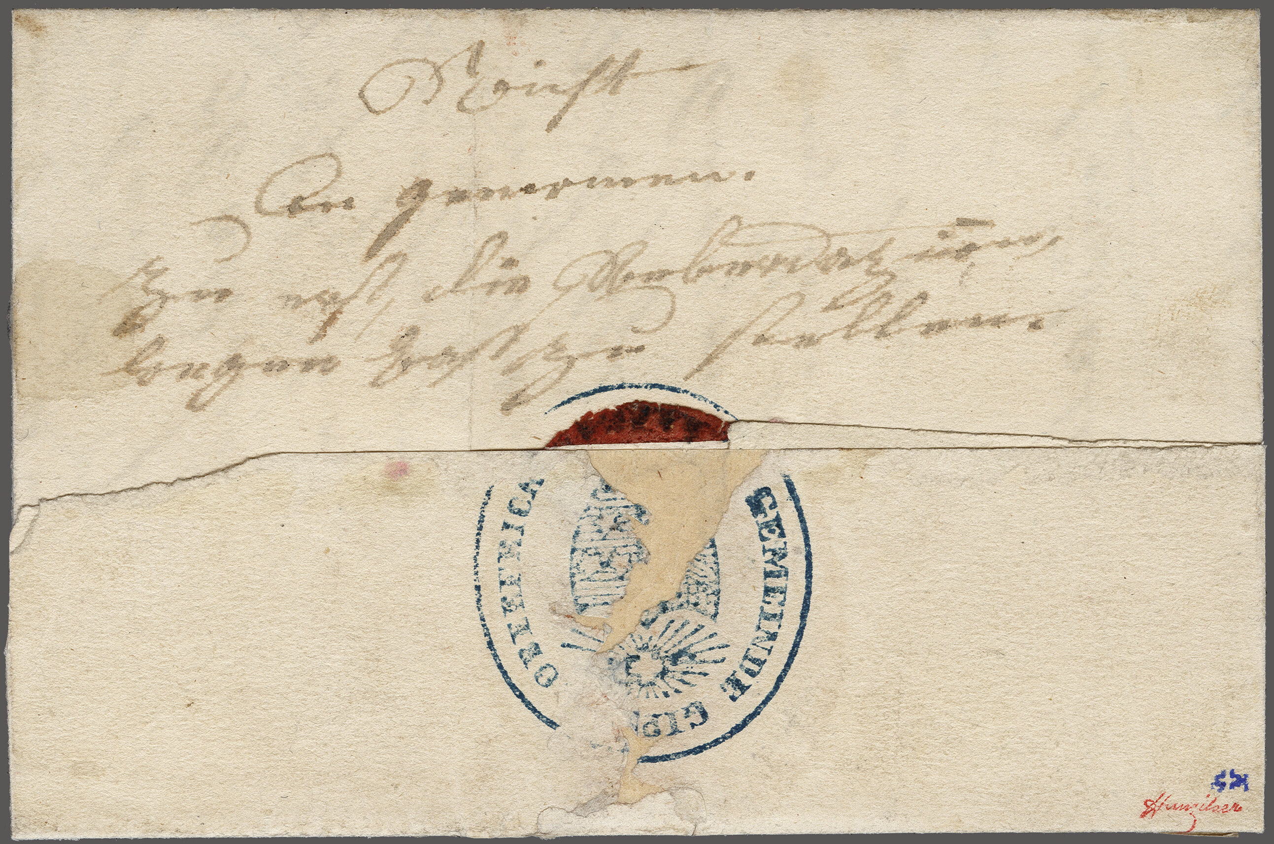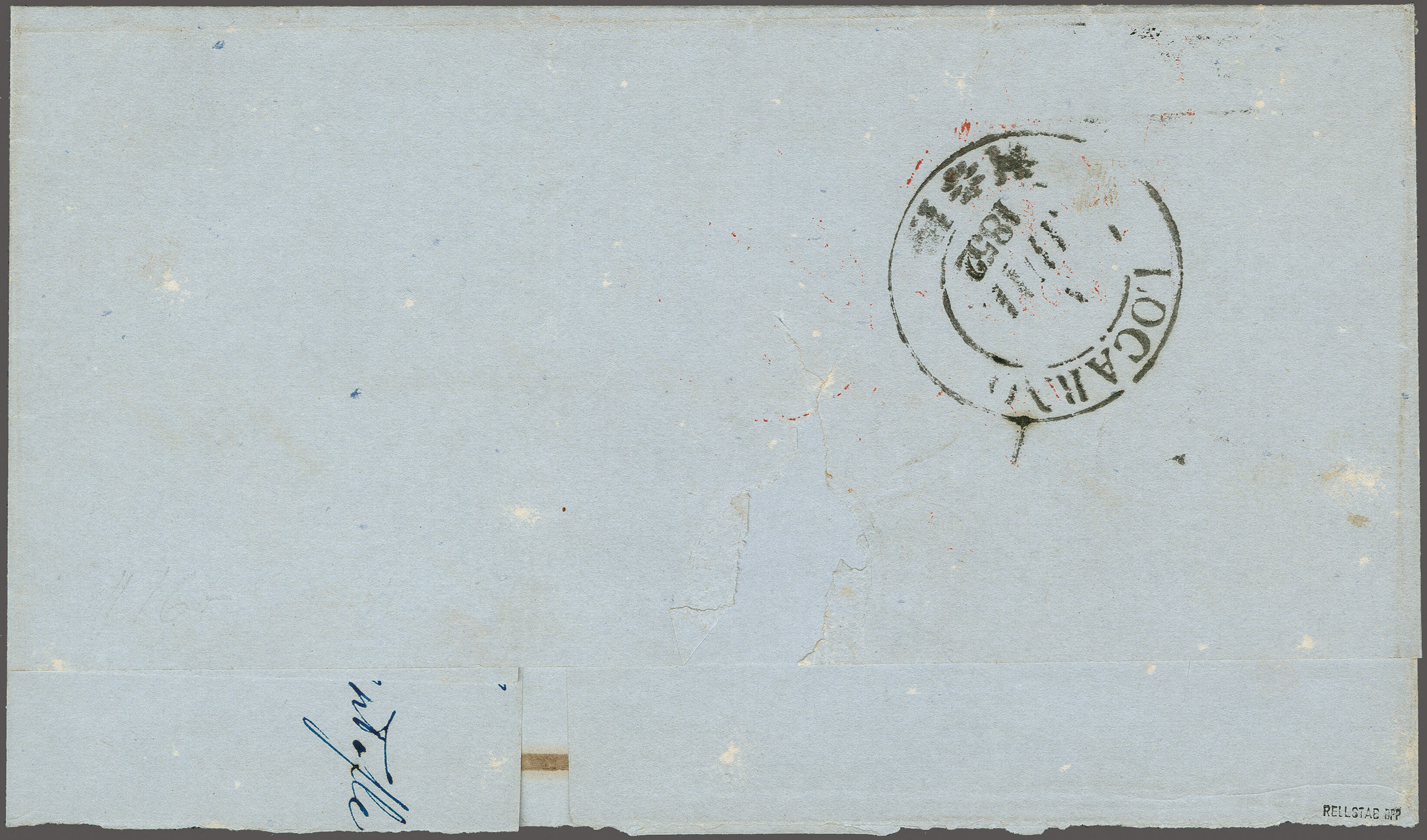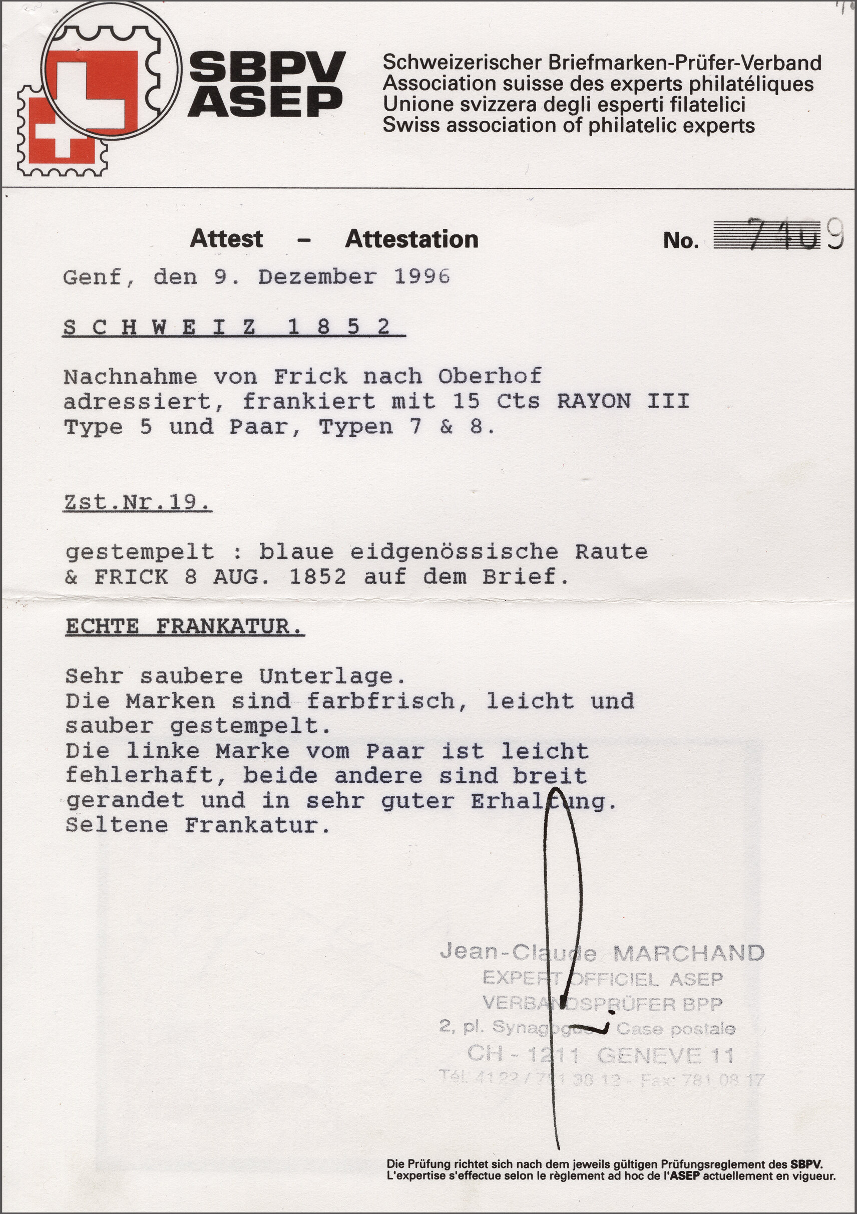 Raute und mit Teilabschlag des Zierzweikreisstp. "FRICK 9 AOUT 1852" auf vollständigem Nachnahme-Faltbrief der Gemeinde Gipf-Oberfrick nach Oberhof, rücks. Siegel der Gemeindeverwaltung, refüsiert. Ein aussergewöhnlicher Nachnahme-Brief im ersten