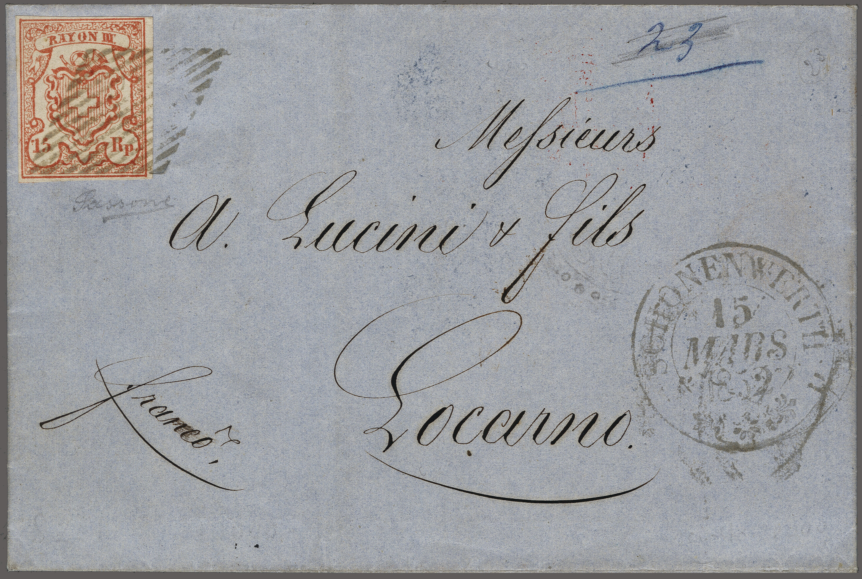 Kl. Wertziffer: Type 6, farbfr. und breit- bis überrandig mit Bogenrand rechts, zart und übergehend entw. mit schwarzer eidg. Raute mit nebenges. gr. Zierkreisstp. "SCHÖNENWERTH 15 MARS 1853" auf vollständigem Faltbrief mit