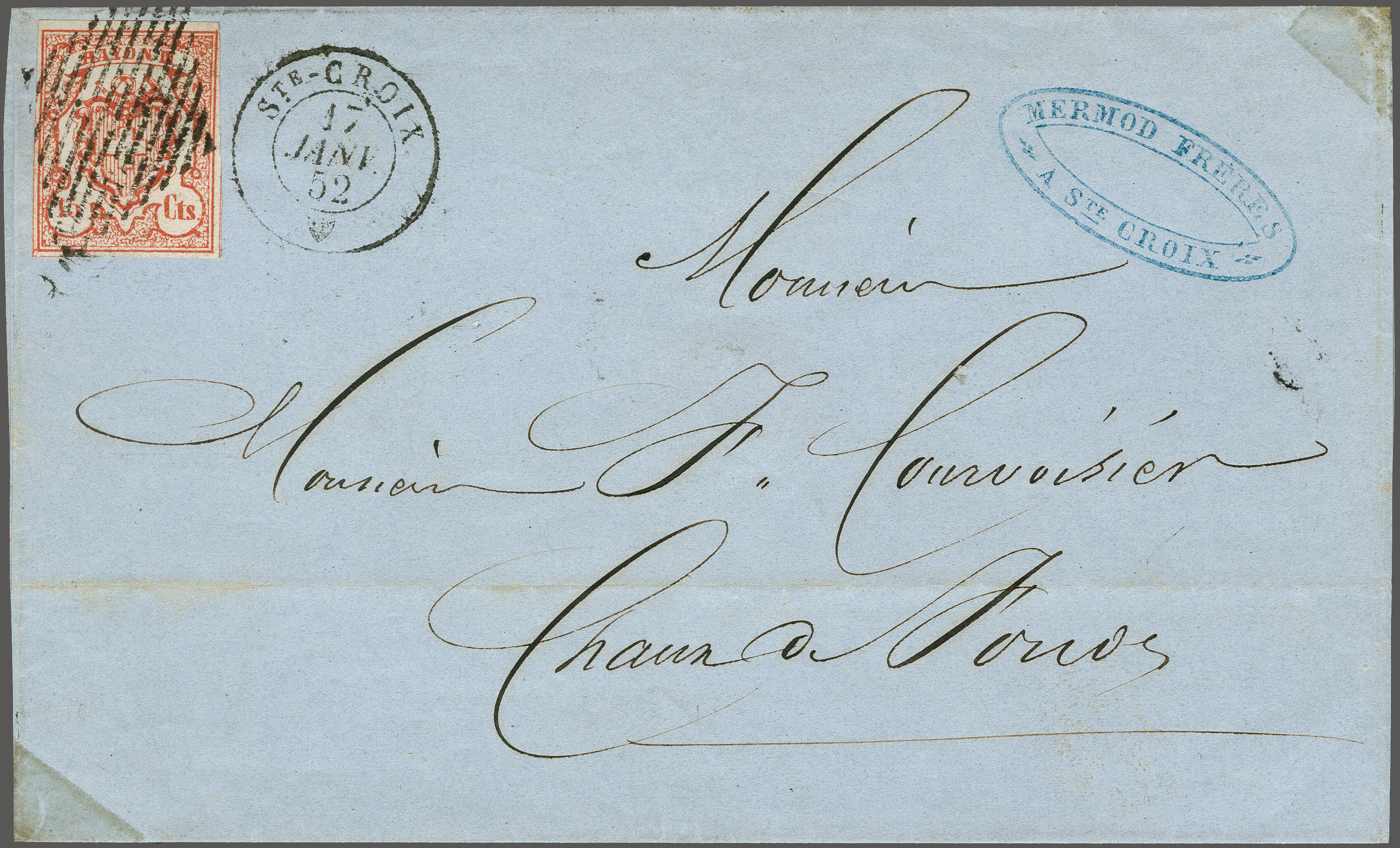 kl. Zweikreisstp. "STE. CROIX 17 JANV. 52" (AW 5676) in derselben Farbe und blauem Firmenstp. "MERMOD FRÈRES / A STE. CROIX" auf Faltbriefhülle nach La Chaux-de-Fonds. Rücks. Ankunftsstp. vom Folgetag. Atteste Hunziker (1971) und Hermann (2022).