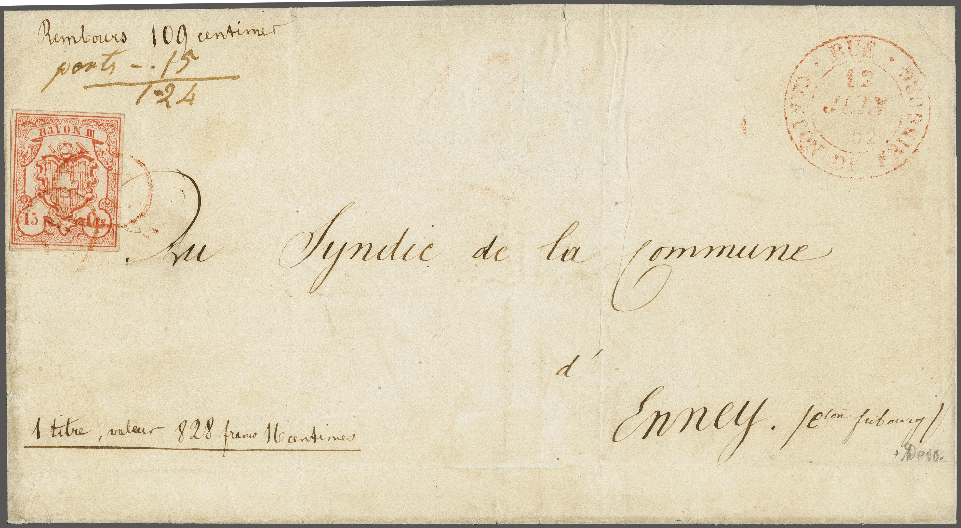 derselben Farbe auf Nachnahme-Faltbriefhülle über Fr. 1.24 im 2. Briefkreis nach Enney (FR). Nachdem die Nachnahme-Mindestprovision per 1. Januar 1852 von 5 auf 10 Rp. erhöht worden war, hätte das Porto für eine Nachnahme bis 10 Fr. im 2. Briefkreis