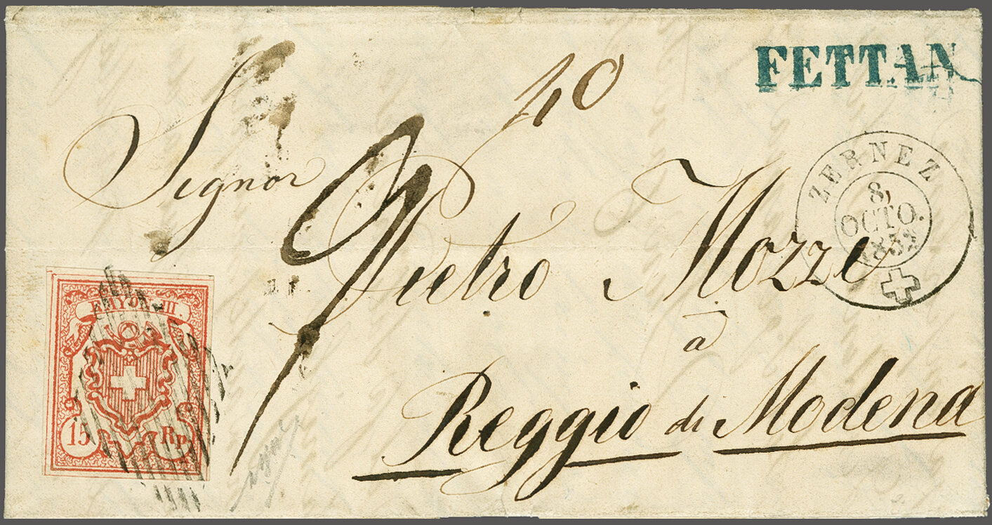 "ZERNEZ 8 OCTO. 1852" in schwarz auf vollständigem Faltbrief in romanischer Sprache nach Reggio di Modena (I). Rücks Ankunftsstp. "II. OTT. 52 / REGGIO" in schwarz. Mit 15 Rappen für den 3. Briefkreis bis zur Schweizer Ausgangsgrenze frankiert wurden