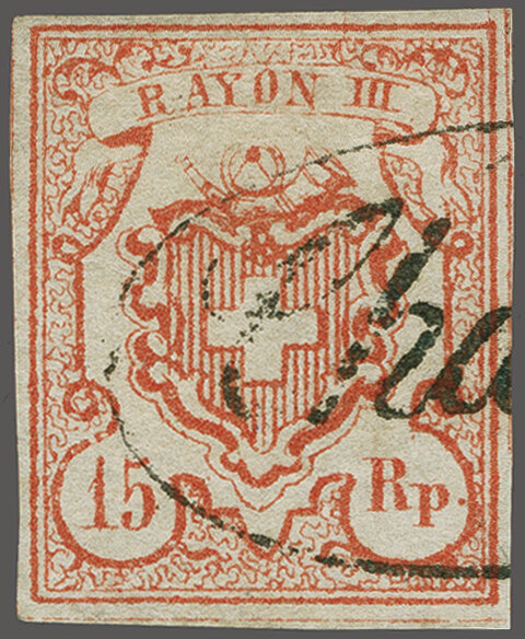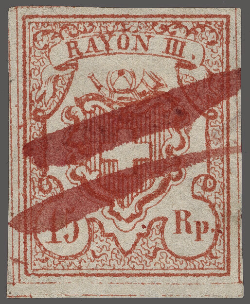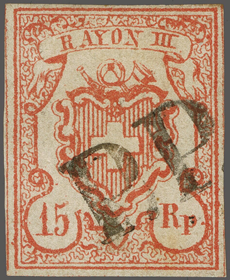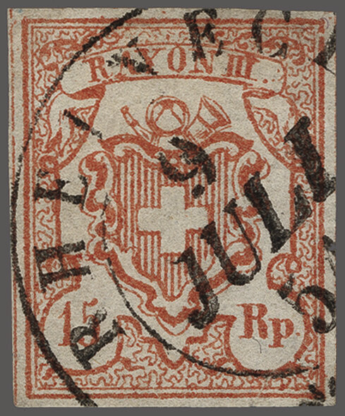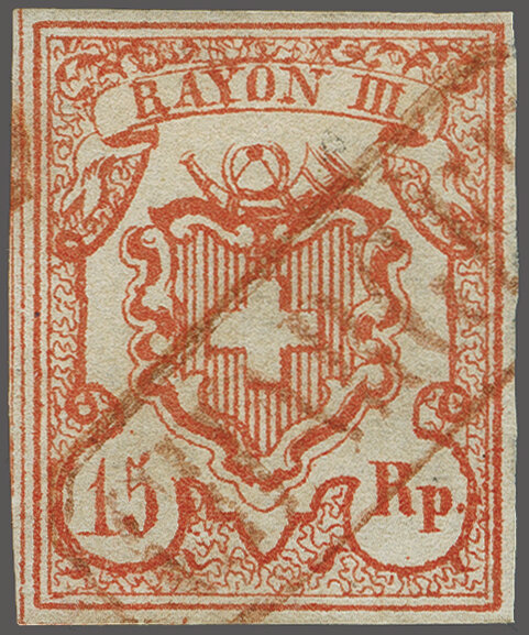 Gr. Wertziffer: Type 2 in der ziegelroten Nuance, farbfr. und gut- bis überrandig, zartklar und übergehend entwertet mit der sehr seltenen unterbrochenen (durchfeilten) eidgenössischen Raute von La Sagne (AW 92) in schwarz mit