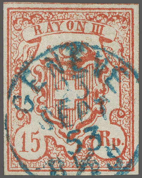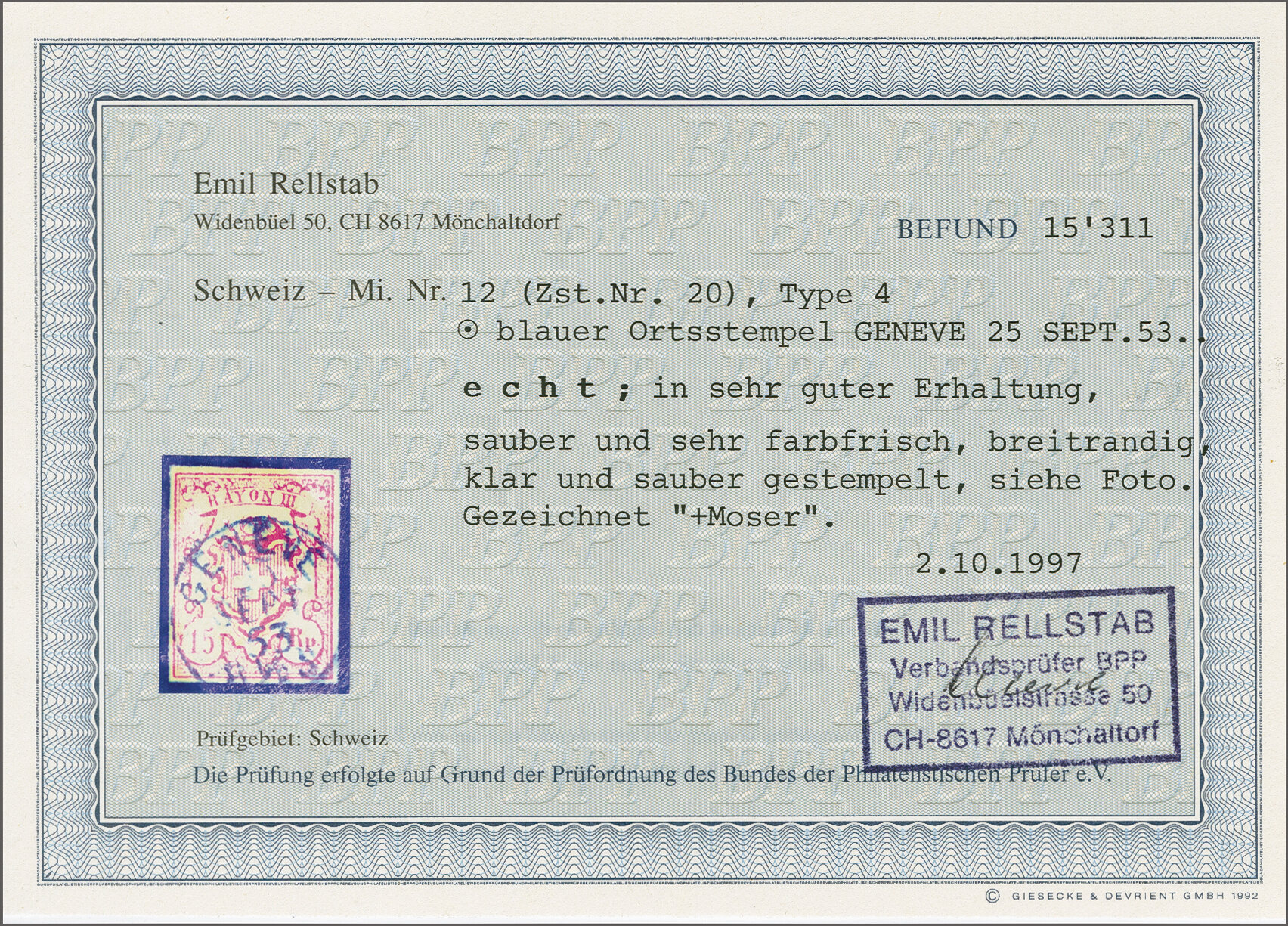 Gr. Wertziffer: Type 4, farbfr. und gleichmässig breitrandig, zartklar und ansprechend entw. mit seltenem blauem Einkreisstempel "GENÈVE 25 SEPT 53 8 1/2 S". Signiert Moser, Befund Rellstab (1997). (Image 1)