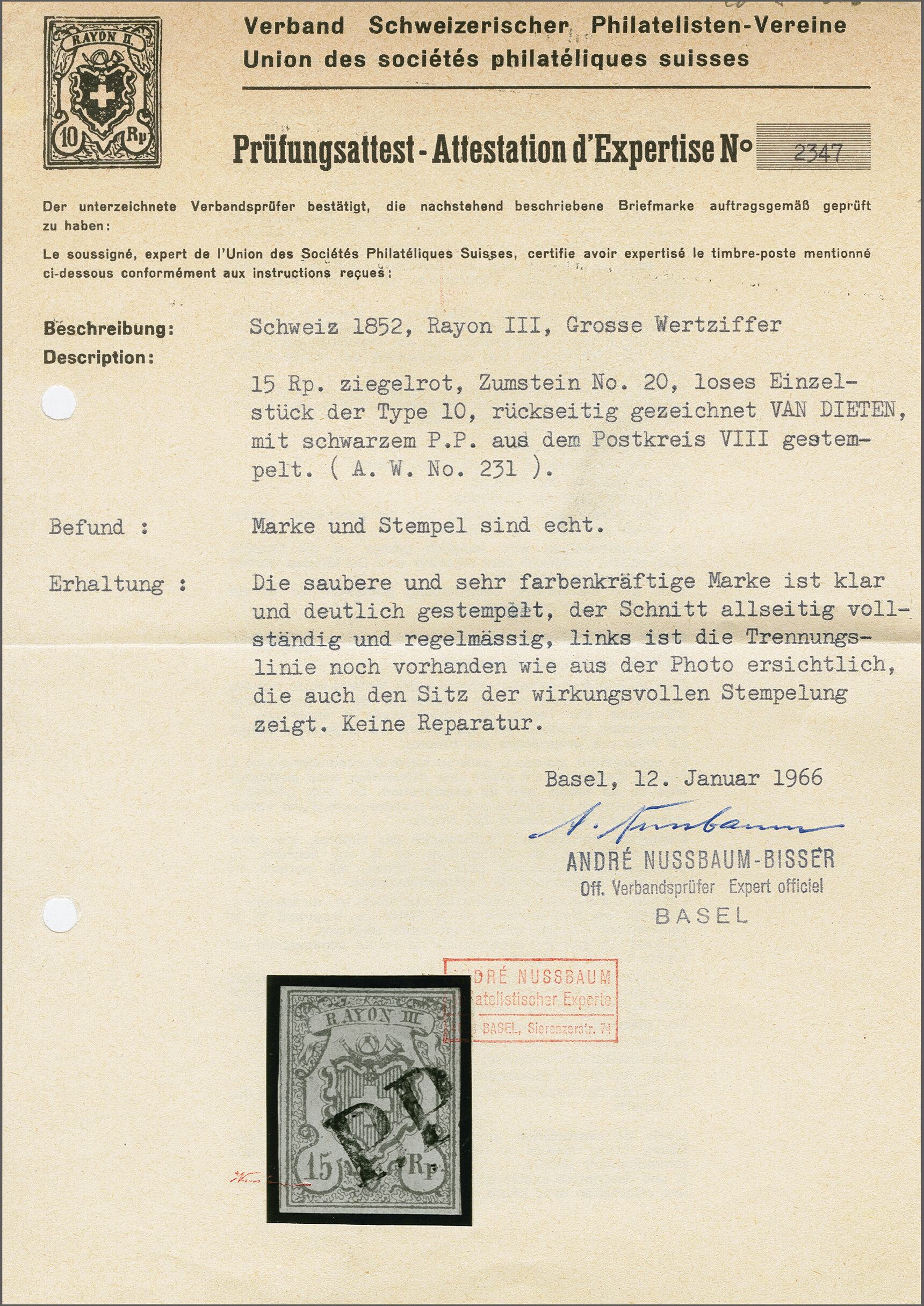 in: Gerhard Blaickner, "Schweizer Auslandsfrankaturen zur Zeit der Rayon-Marken", S. 108. Provenienz: Sammlung "Zürichsee", 114. Corinphila-Auktion, Zürich Oktober 1999, Los 206. (Image 1)