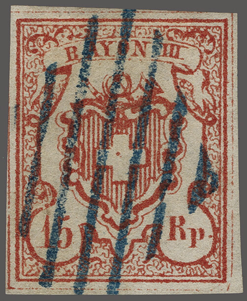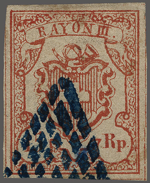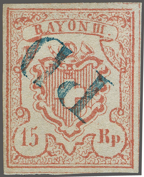 Gr. Wertziffer: Type 10, farbfr. und breit- bis überrandig, ideal klar und kontrastvoll entw. mit auf dieser Ausgabe seltenen 7-linigen Luzerner Raute (AW 41/42) in blau. Ein schöne Marke von kräftiger und ausgewogener