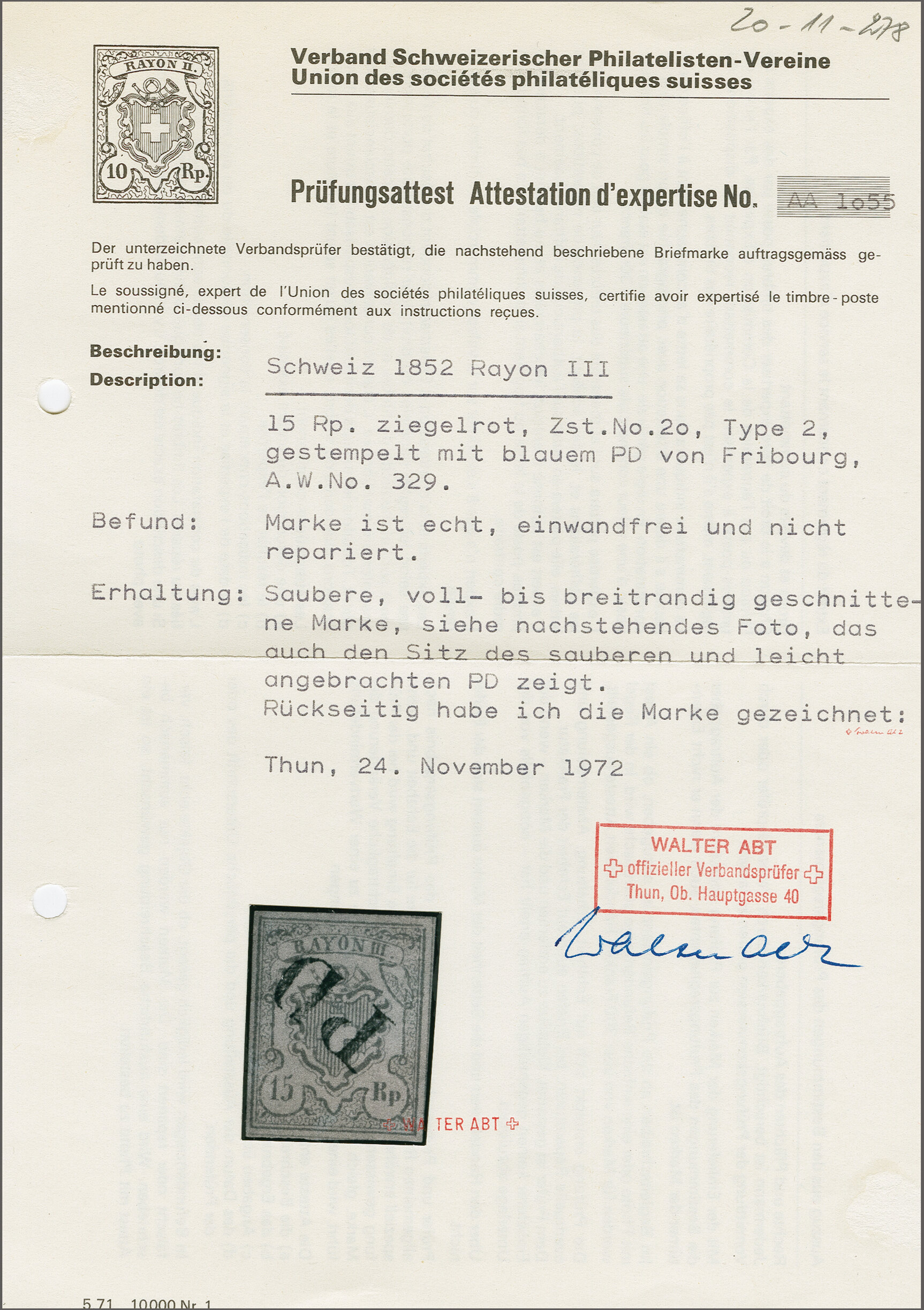 Gr. Wertziffer: Type 2, farbfr. und breitrandig, ideal zartklar, kontrastreich und voll aufgesetzt entw. mit blauem "PD" von Fribourg (AW 329). Eine seltene Entwertung auf dieser Ausgabe; Attest Abt (1972). (Image 1)
