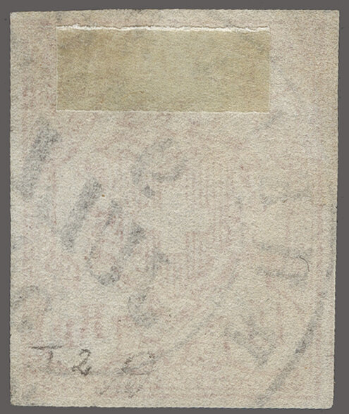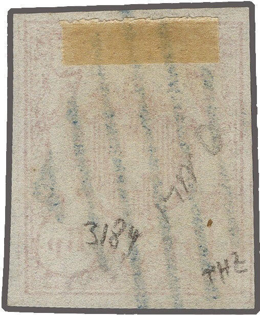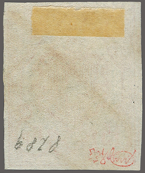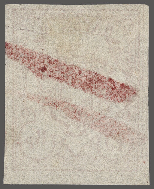 Gr. Wertziffer: Type 9, farbfr. und breit- bis überrandig mit echtem Gruppenabstand und kompletter Trennlinie der unteren Nebengruppe, klar und kontrastreich entwertet mit zwei dicken roten Tintenstrichen. Ein Blickfang rot in