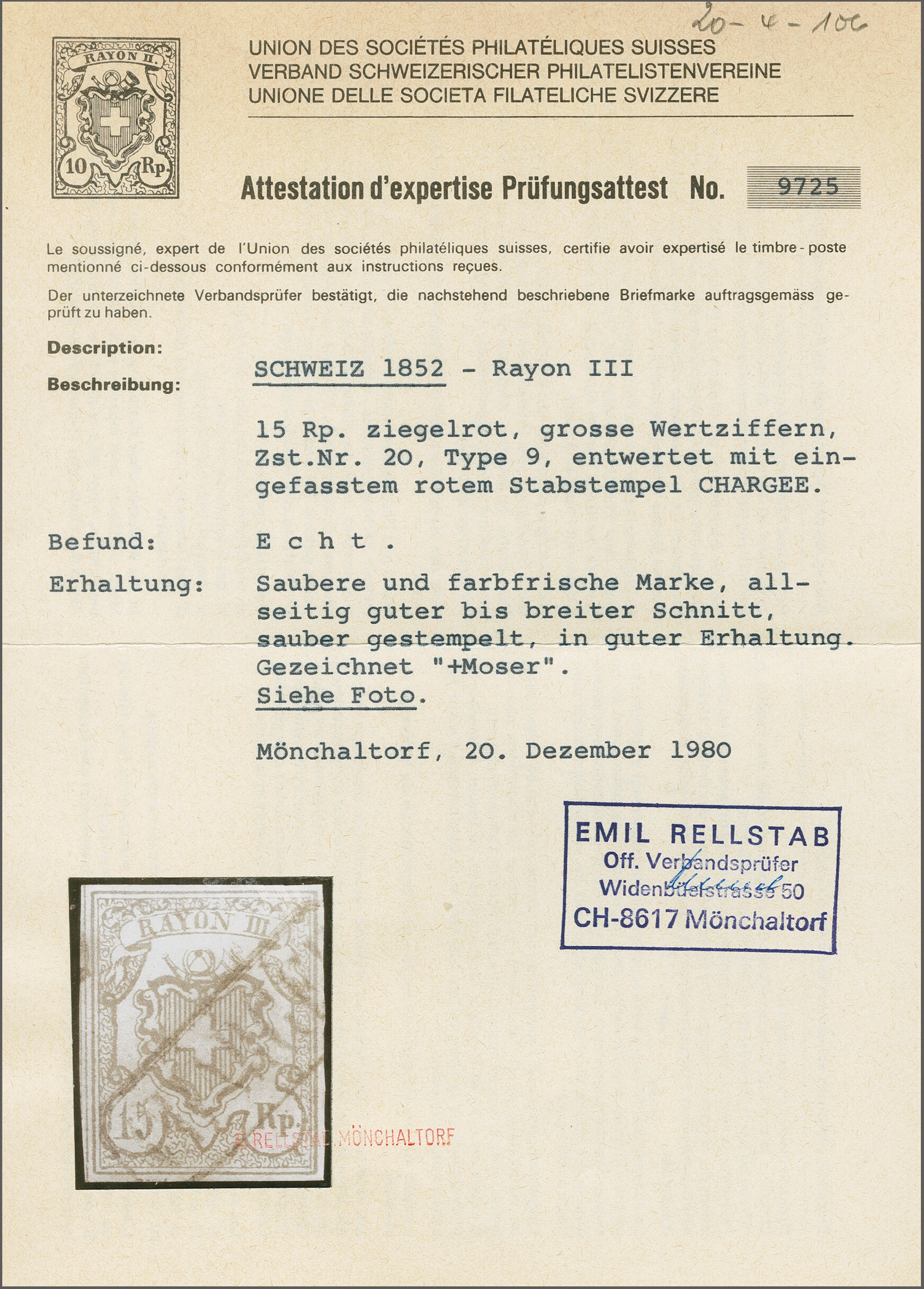 Gr. Wertziffer: Type 9, farbfr. und breit- bis überrandig, zart entw. mit diagonal aufgesetztem, gefasstem "CHARGÈE" von Basel (AW 702/703) in rot. Eine seltene Entwertung; signiert Moser, Attest Rellstab (1980). (Image 1)