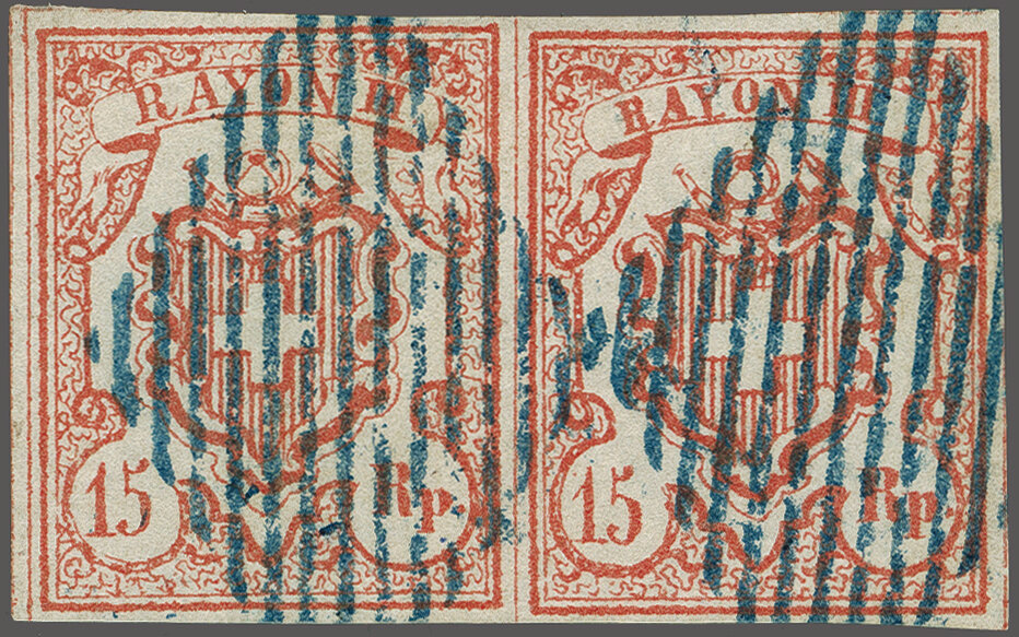 Centimes: Typen 1+2 im waagrechten Paar in Kombination mit Rayon I hellblau, Unbekannter Stein, Type 4 r/u, alle farbintensiv und breit- bis überrandig, ideal klar und übergehend entw. mit zwei Abschlägen der schwarzen eidg.