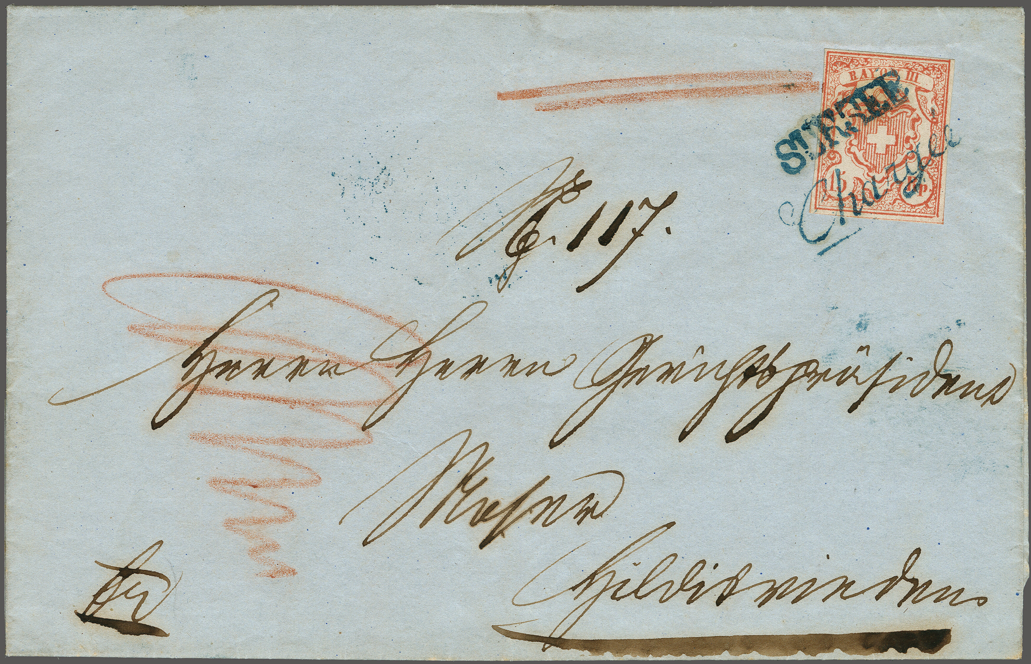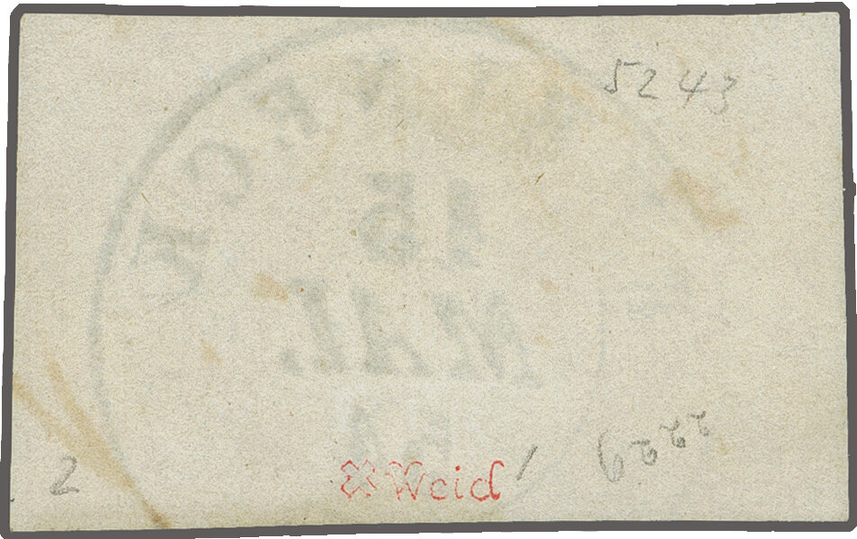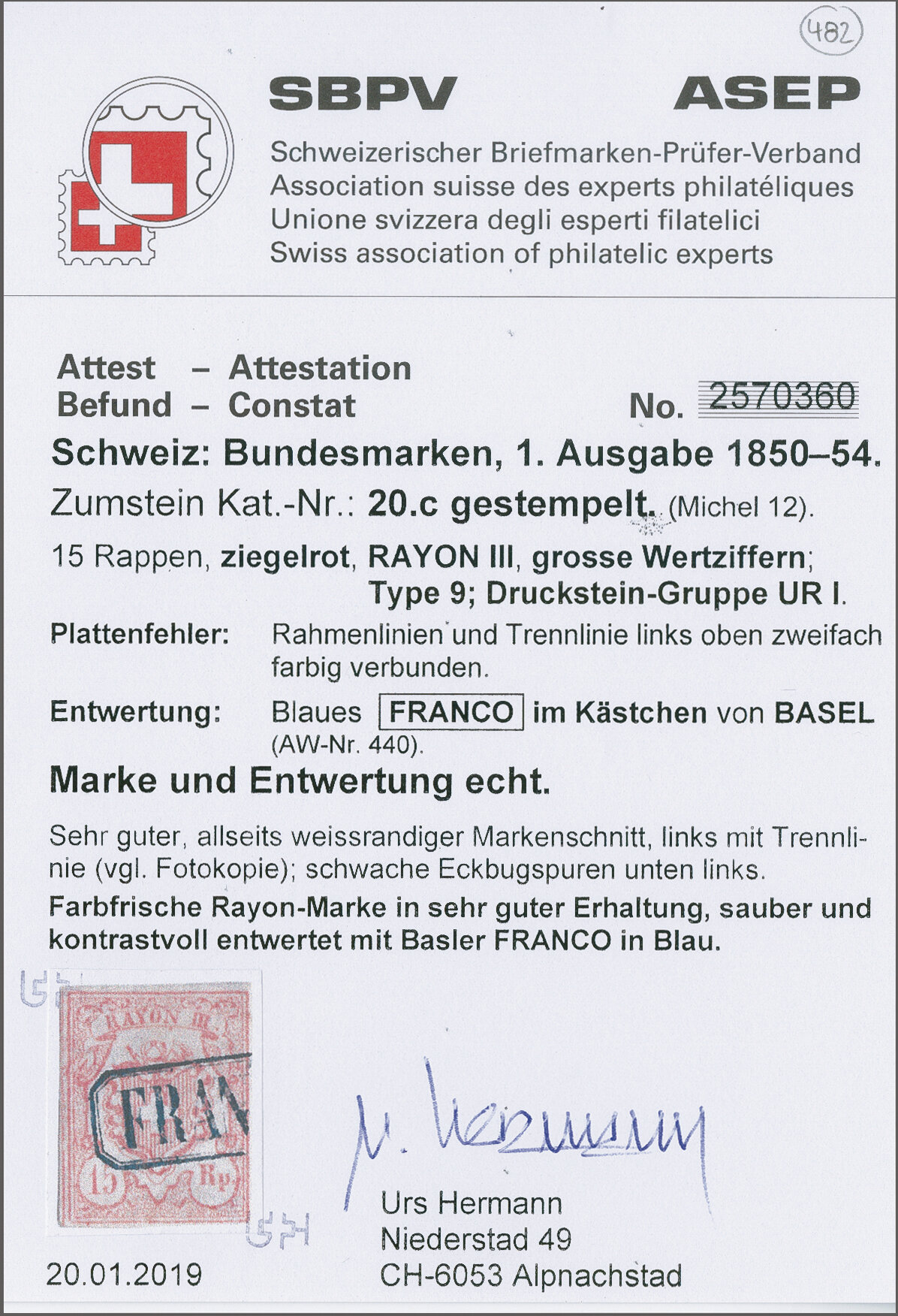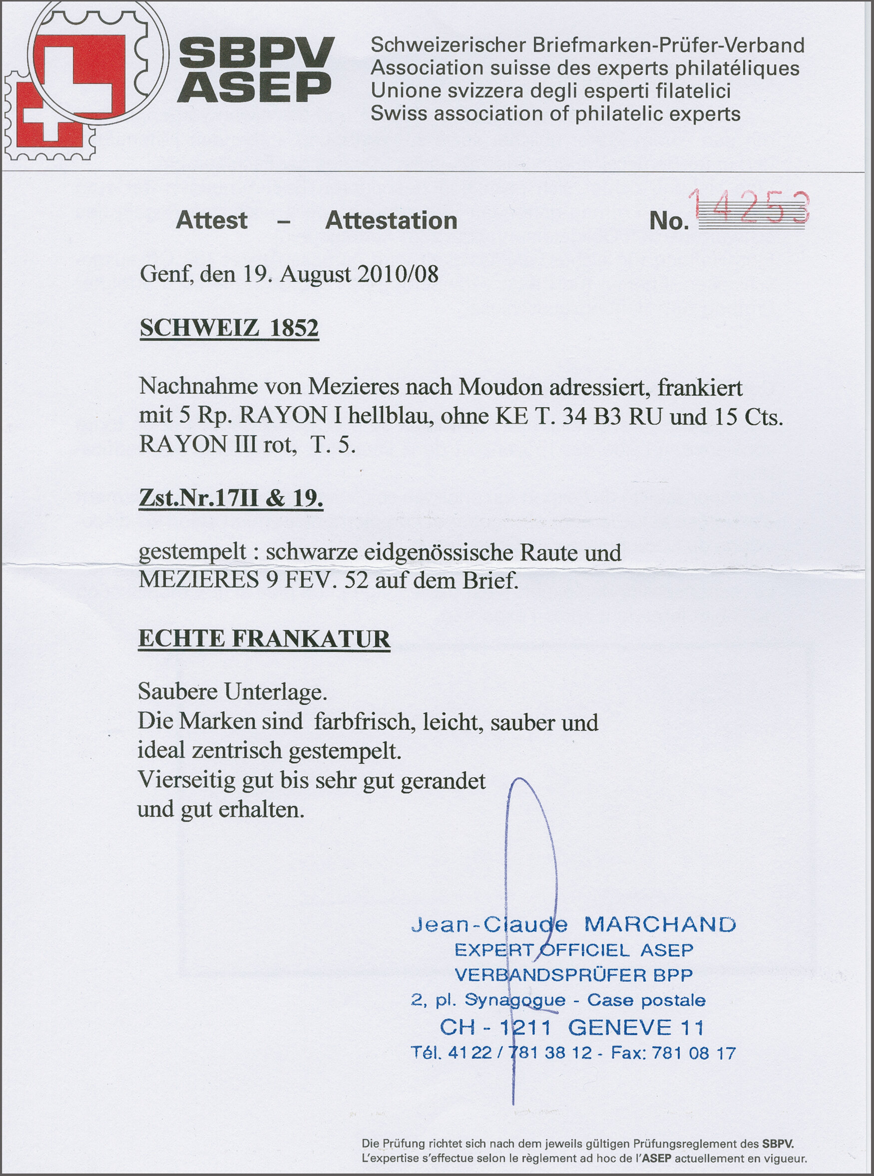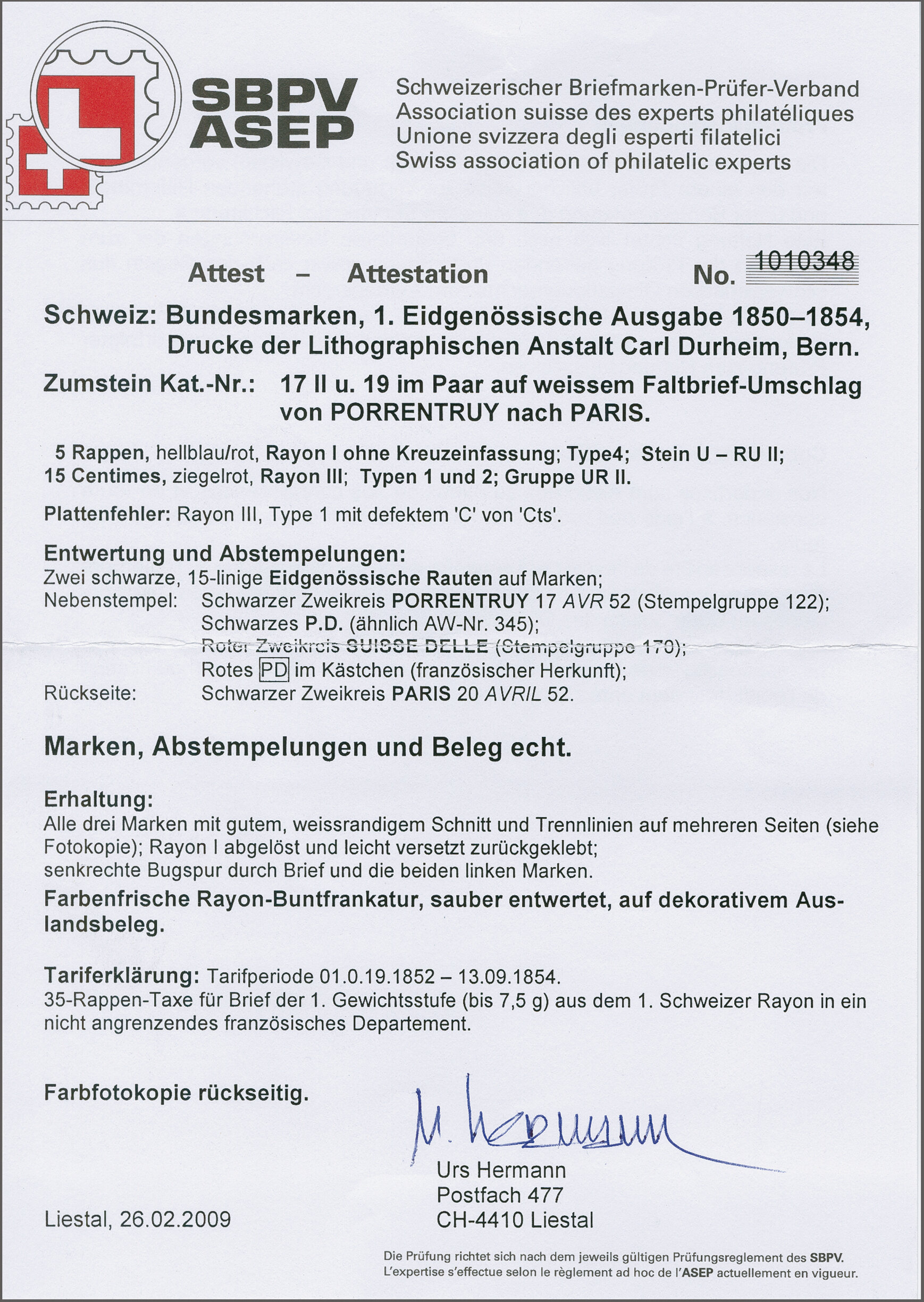 "Schweizer Auslandsfrankaturen zur Zeit der Rayon-Marken (1850-1854)", S. 107. Provenienz: Sammlung Jack Luder, 219. Corinphila-Auktion, Zürich 11. November 2017, Los 2297. (Image 1)