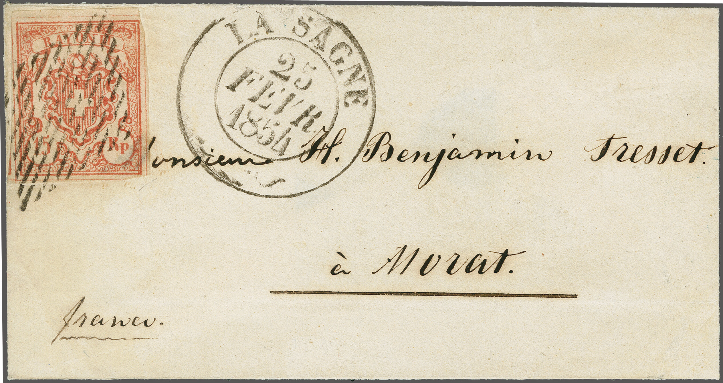 nebenges. grossem Zierkreisstempel "LA SAGNE 25 FEVR.1854" in derselben Farbe auf kleinformatigem Briefumschlag (umgefaltet) nach Murten. Ein zierliches Brieflein mit dieser seltenen Entwertung; Atteste Hunziker (1977) und Eichele (2001). Provenienz: