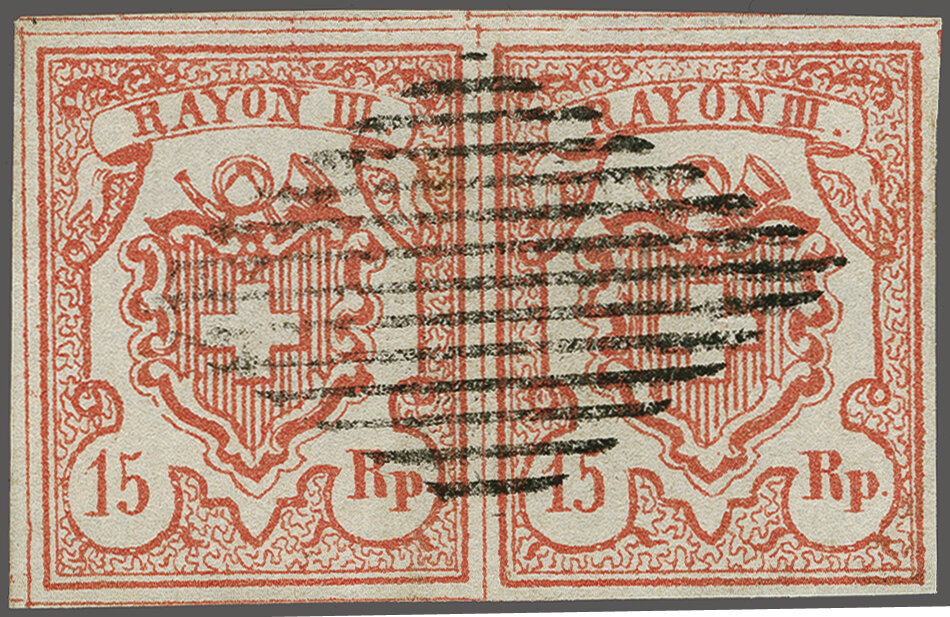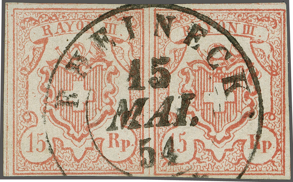Gr. Wertziffer: Typen 1+2 im waagr. Paar, farbfr. und breit- bis überrandig mit Gruppenabstand und kompletter Trennlinie der Nebengruppe oben, zus. klar und voll aufgesetzt entw. mit schwarzer eidg. Raute. Eine schöne Einheit;