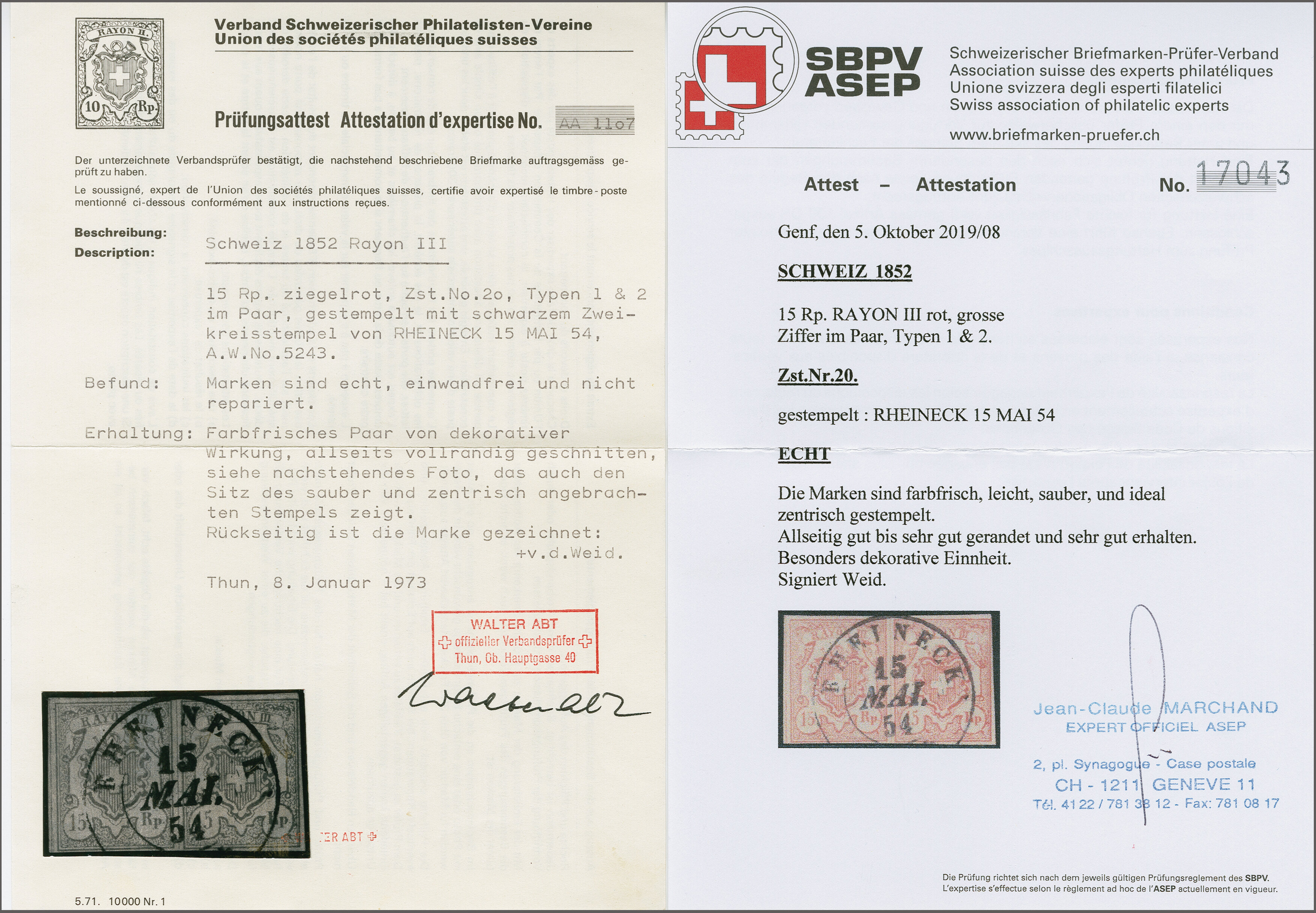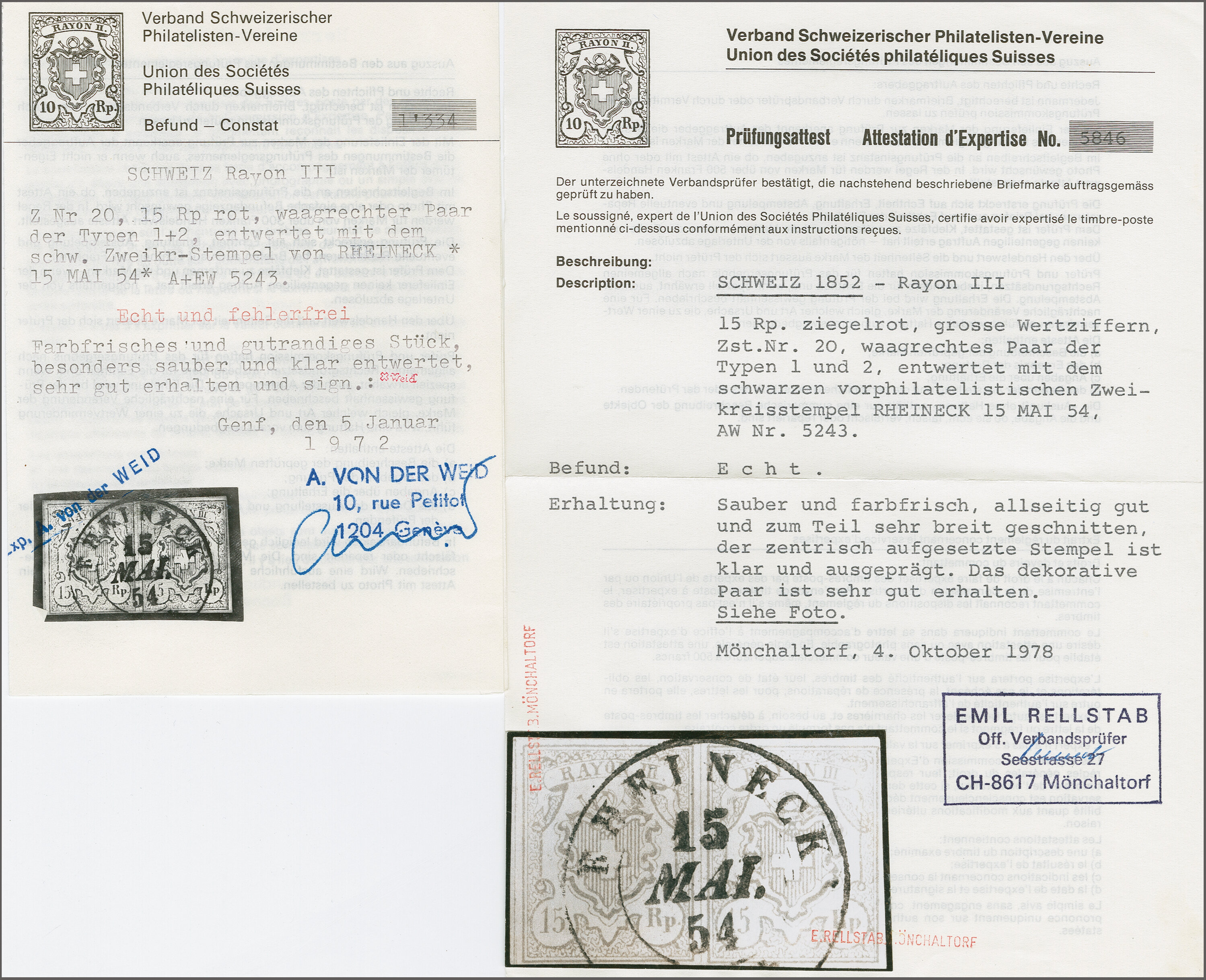 Gr. Wertziffer: Typen 1+2 im waagr. Paar, farbfr. und gut- bis überrandig, zus. klar und zentr. entw. mit schwarzem Zierzweikreisstp. "RHEINECK 15 MAI 54" (AW 5244). Eine attraktive Einheit, Befund von der Weid (1972); Atteste