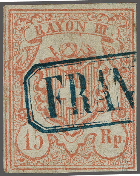 Gr. Wertziffer: Type 9, farbfr. und gut- bis breitrandig (min. Eckbugspur), gestochen klar und kontrastreich entwertet mit blauem "FRANCO" im Kästchen von Basel (AW 440). Eine zierliche und sehr seltene Basler Entwertung;