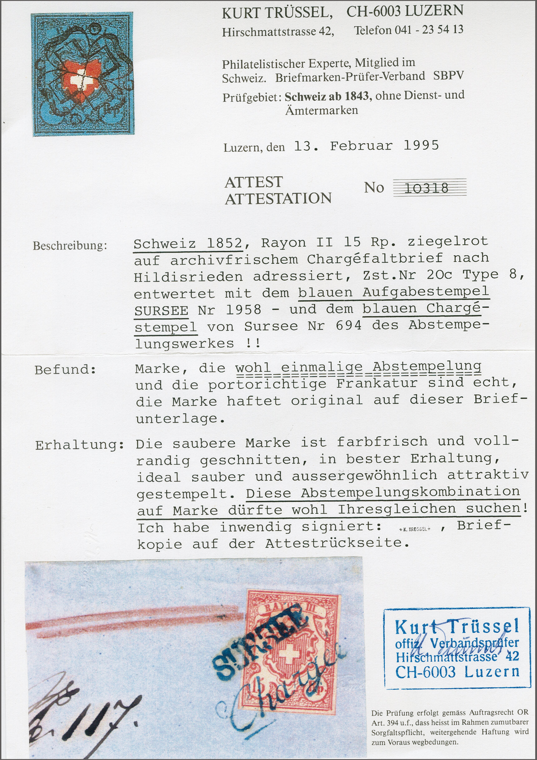 Gr. Wertziffer: Type 8, farbfr. und voll- bis breitrandig, klar und übergehend entw. mit blauem Stabstempel "SURSEE" (AW 1958) und Schreibschriftstp. "Chargée" (AW 694), schön parallel und diagonal aufgesetzt, auf