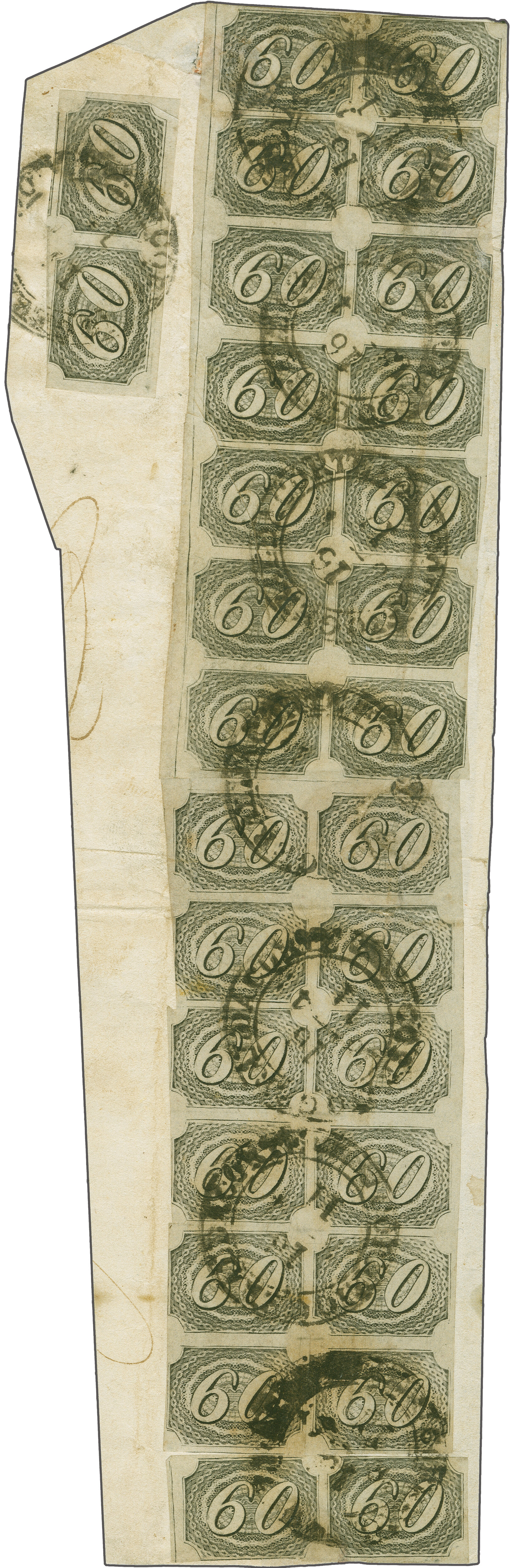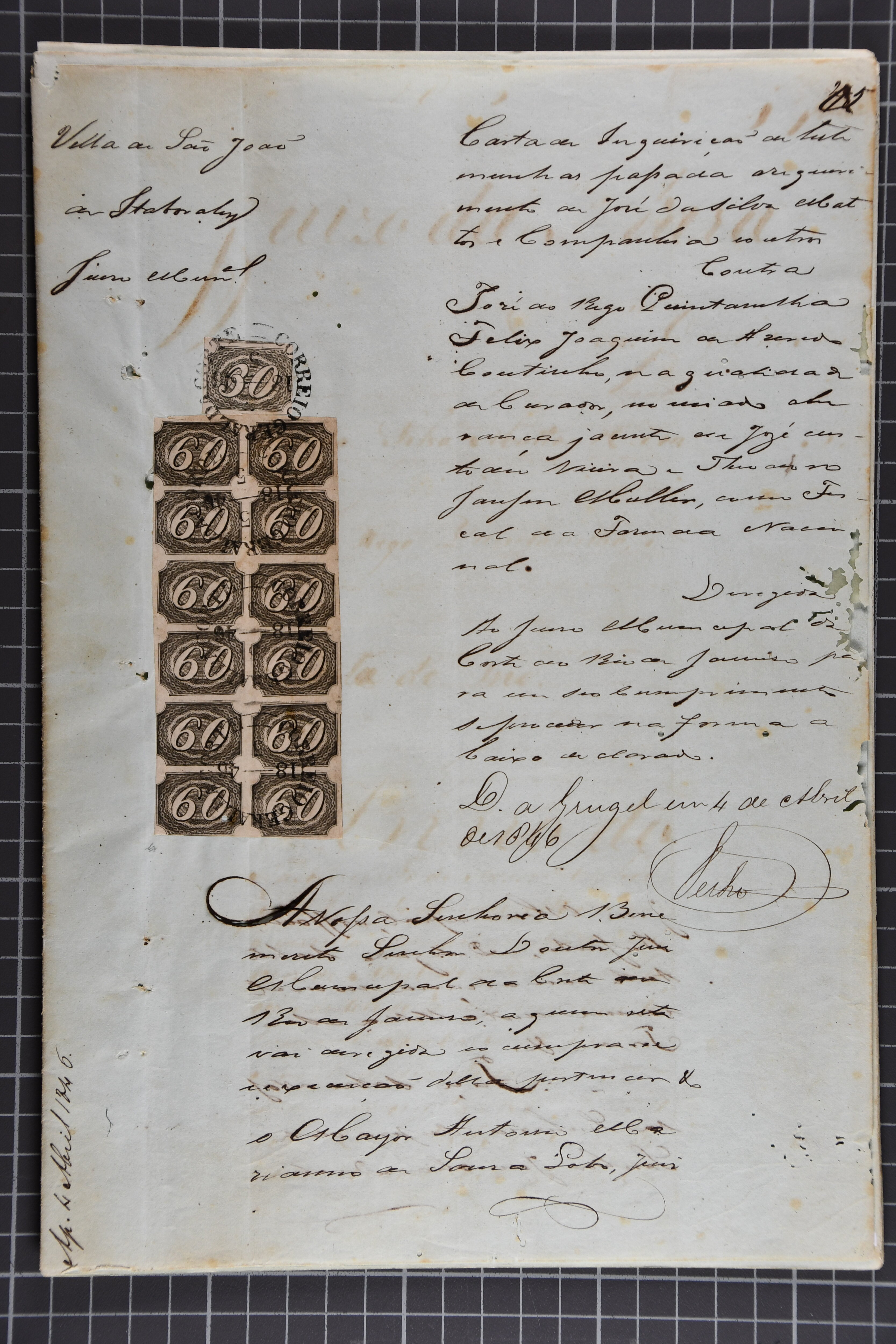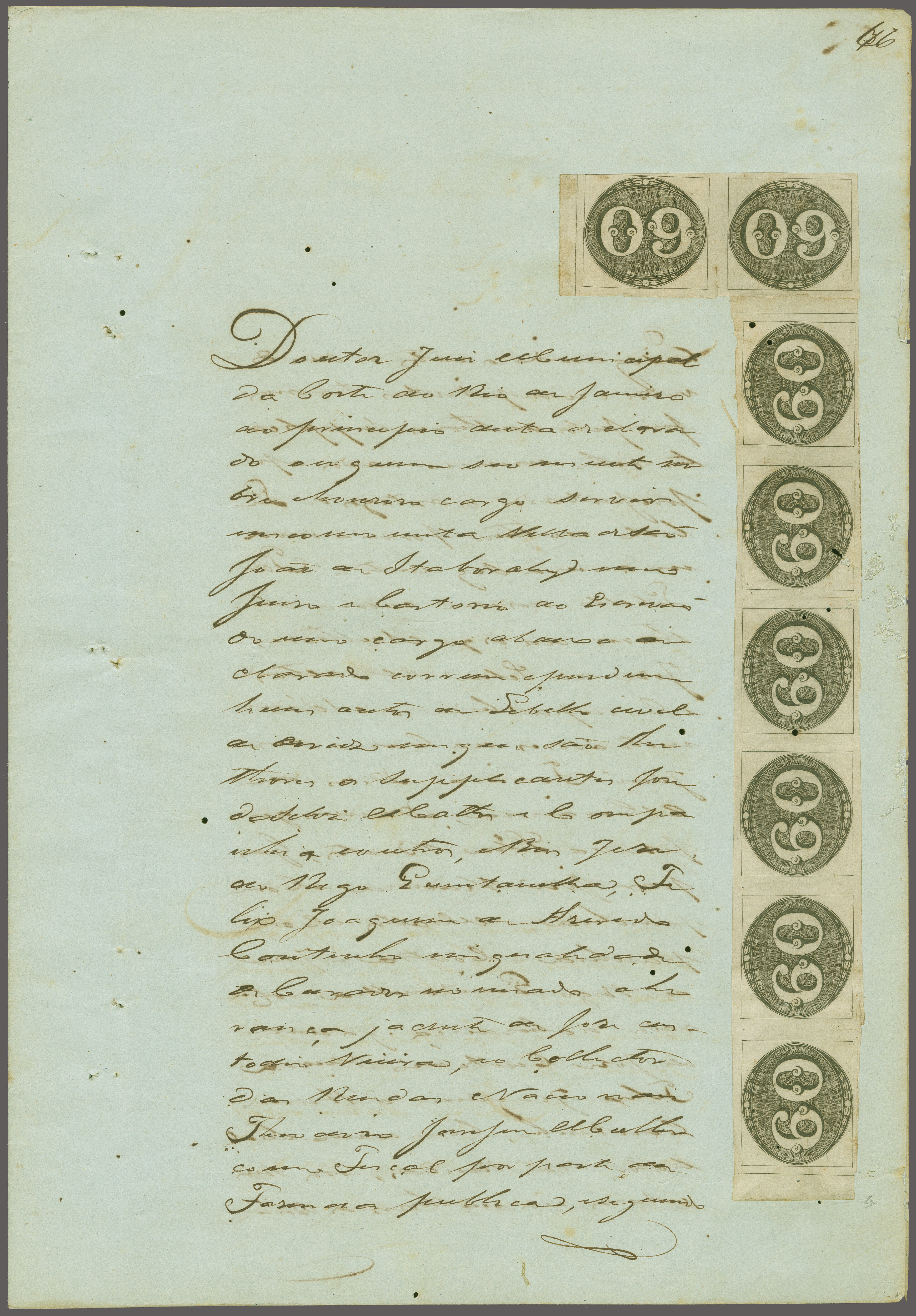 147 cover image60 reis black, Early Impression, the horizontal sheet marginal pair and horizontal sheet marginal strip of six showing the sheet margins at both left and at right, applied to top sheet of Judicial document weighing between 15 and 16 ounces dated 26 Mar 1846 – the Bull’s Eyes paying a 480 réis rate from Itaborai to Rio de Janeiro, uncancelled as the document was sent by a special court messenger, with large margins on the strip of six and the pair just shaved on one stamp and with scissor cut in margin only, some typical worm holes. Reply document included with 1844/46 30 r. grey-black, a single example applied above a 60 r. black block of twelve (2 x 6) used on the return of the Judicial document from Rio de Janeiro to Itaborai dated 4th April 1846, all with just touched to mostly large margins all round, one stamp with worm hole, tied by rimless "CORREIO GERAL DE CORTE" circular datestamps dated 5th May 1846 in black. Illustrated and discussed by Everaldo Santos FRPSL in the London Philatelist, Volume 124, Oct 2015, where there is a full discussion on the usages of both Bull's Eye usages and later multiples applied to judicial forms for pre-payment, this item illustrated on page 361. Copies of the article are enclosed with the lot. An extraordinary and fabulous piece of stunning appearance and enormous rarity. Unique. Reference: Illustrated in "Bull's Eyes on Covers" by B. Juchert on page 279. (Image 1) (Image 2) (Image 3)
