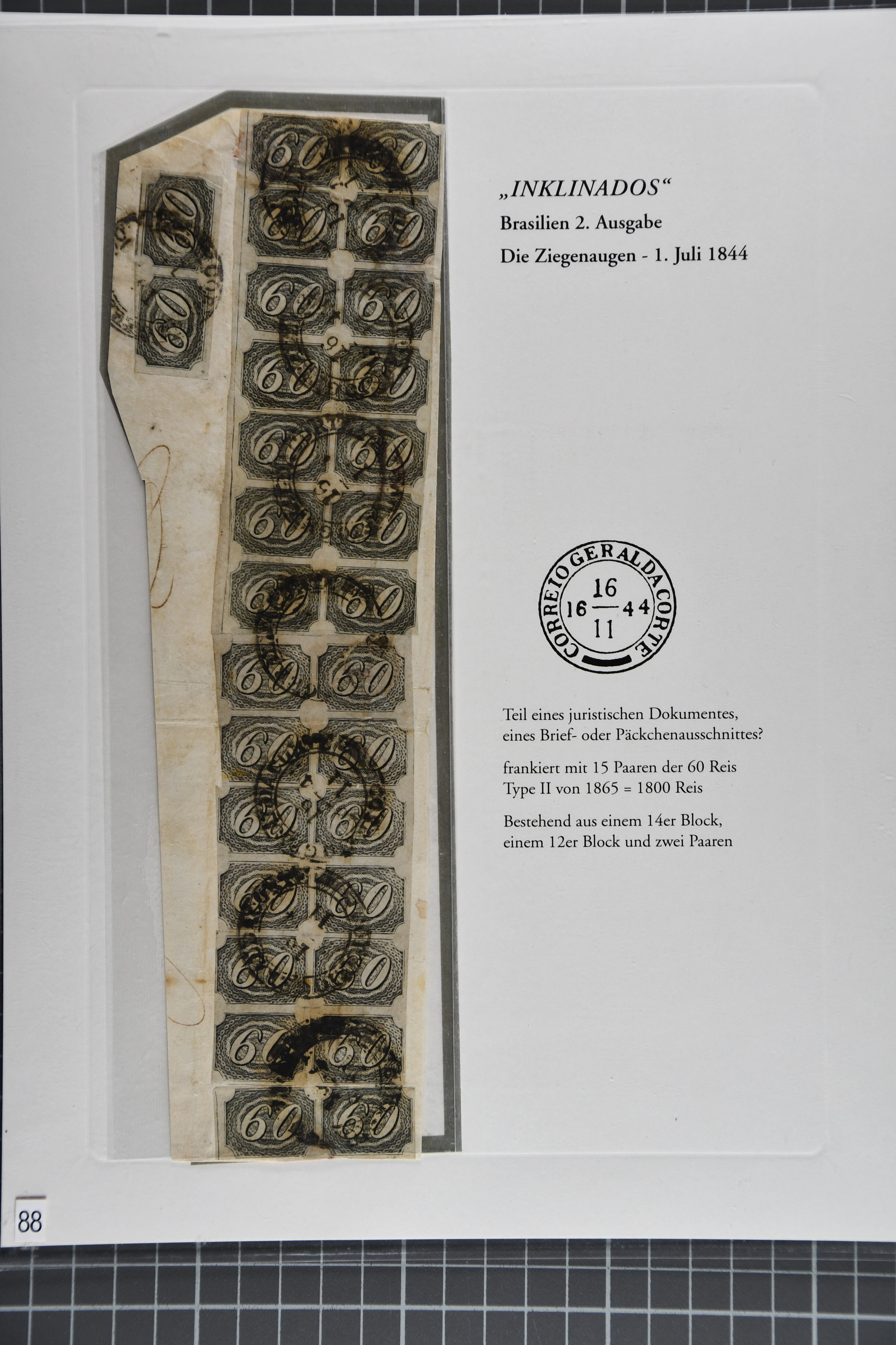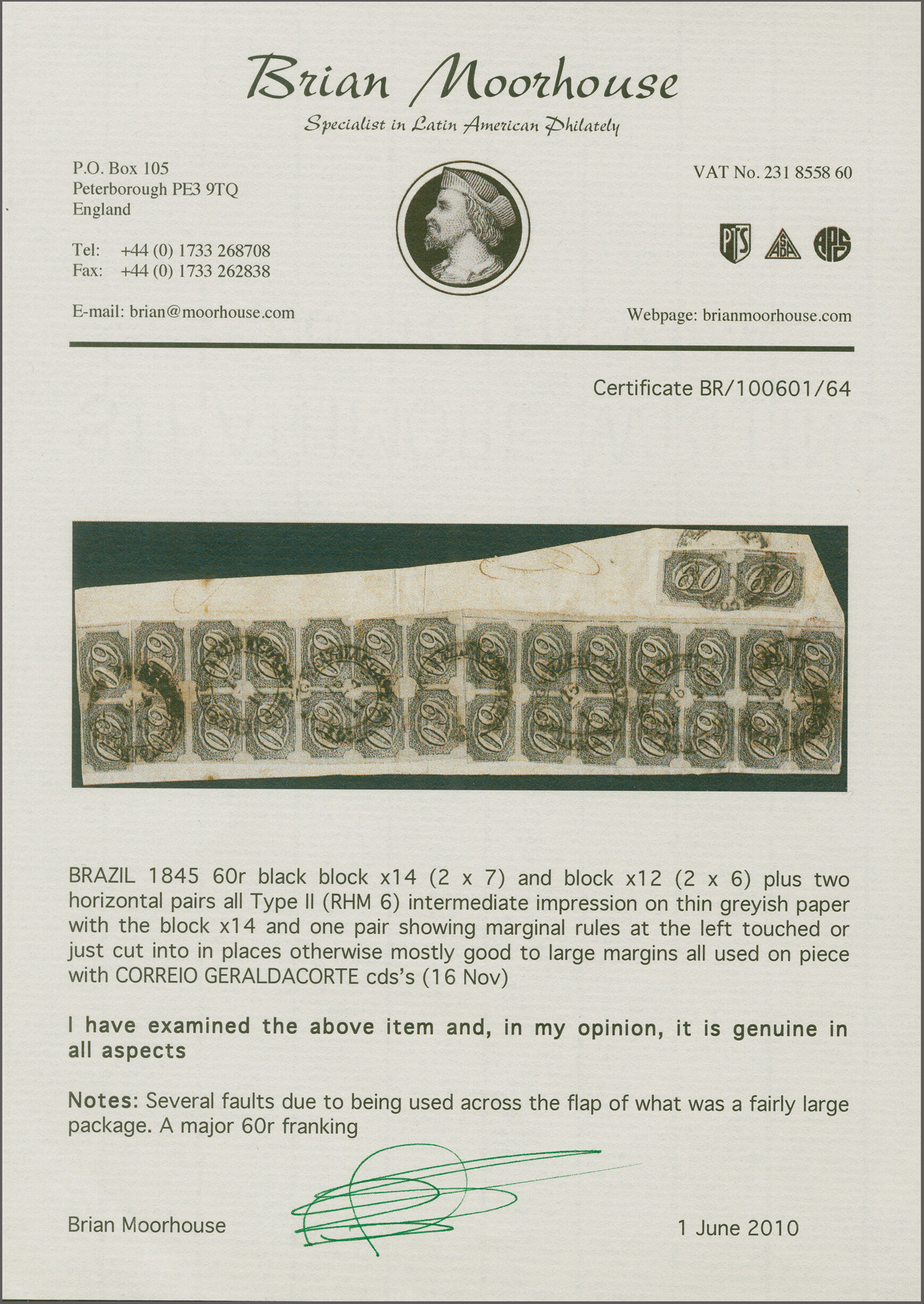 154 piece/bof imageInclinados 1844/46: 60 r. black, Type II, the remarkable part Judicial document / heavy packet, franked by two horizontal pairs, and two vertical format blocks of fourteen (2 x 7) and twelve (2 x 6) all tied by seven centrally struck "CORREIO GERAL DA CORTE" circular datestamps (16 Nov 1844) in black. The lower block with central closed tear where the multiple was applied over a seal from a heavy packet - an exceptional 1'800 reis franking and of extreme rarity. Cert. Moorhouse (2010). (Image 1) (Image 2) (Image 3)