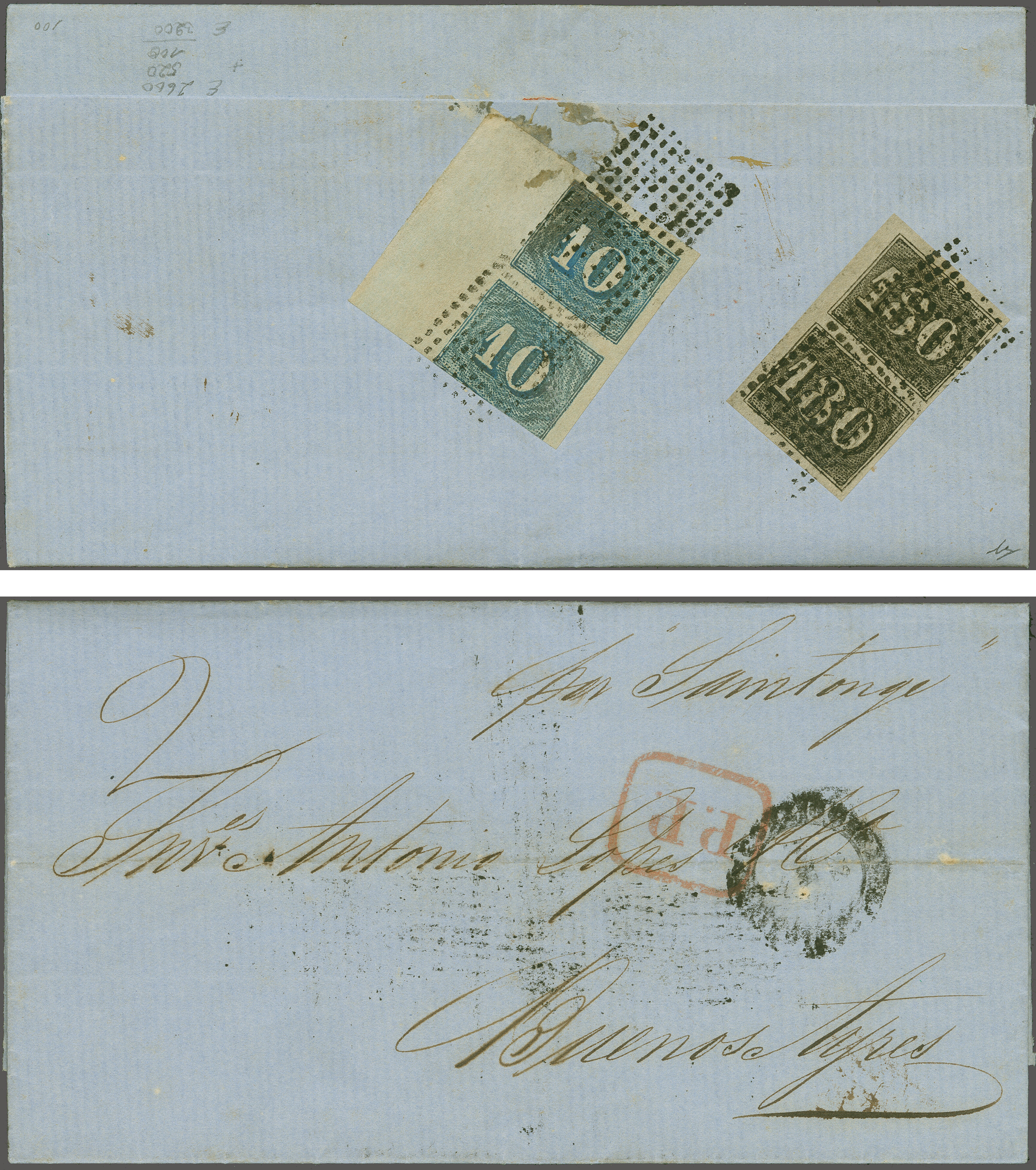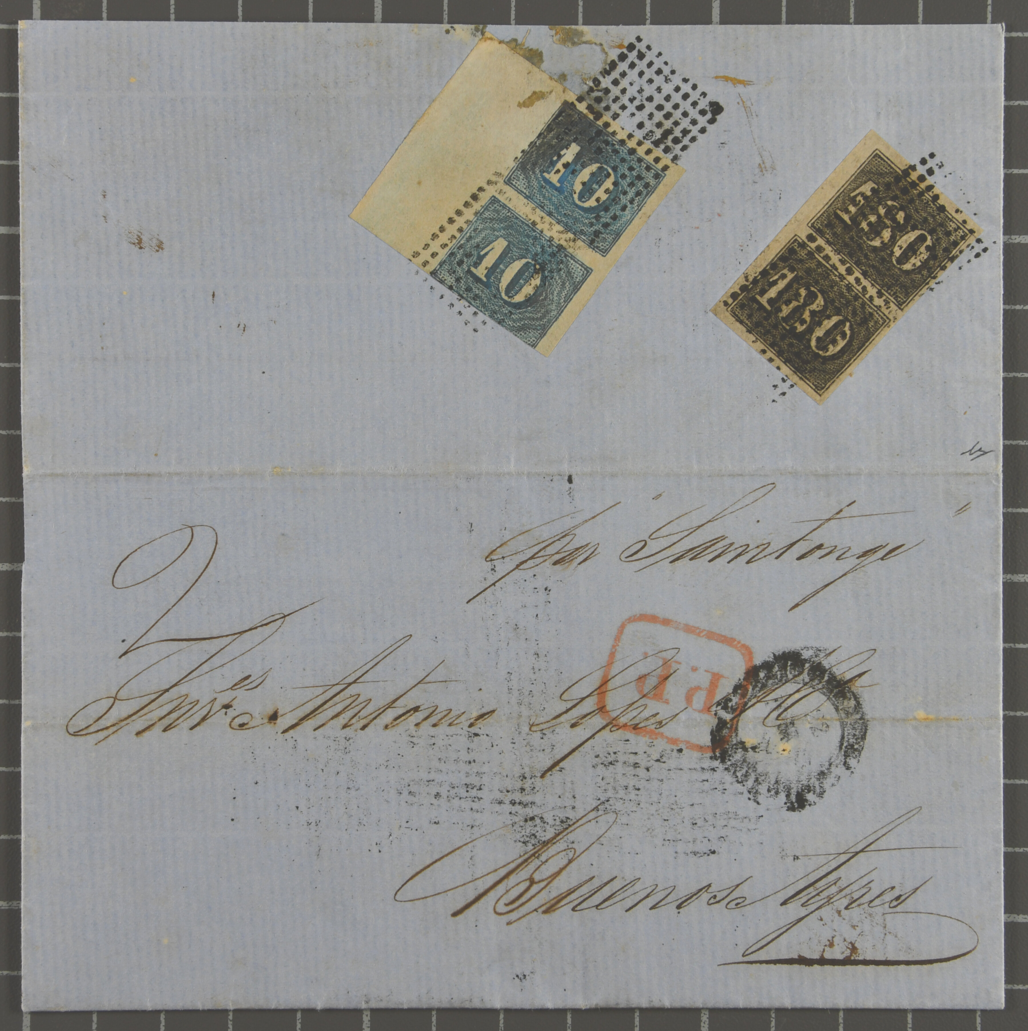 158 cover imageVerticais 1850: 180 r. black, a fine used vertical pair with good margins all round, used in combination with 1854 10 r. blue vertical pair - sheet marginal at left - on 1865 double rate entire letter to Buenos Ayres, Argentina endorsed "par Saintonge" tied by Rio de Janeiro roller of dots handstamps in black. Framed "P.P." in red on obverse with Rio despatch cds (Feb 22) in black. A charming and rare entire. (Image 1) (Image 2)