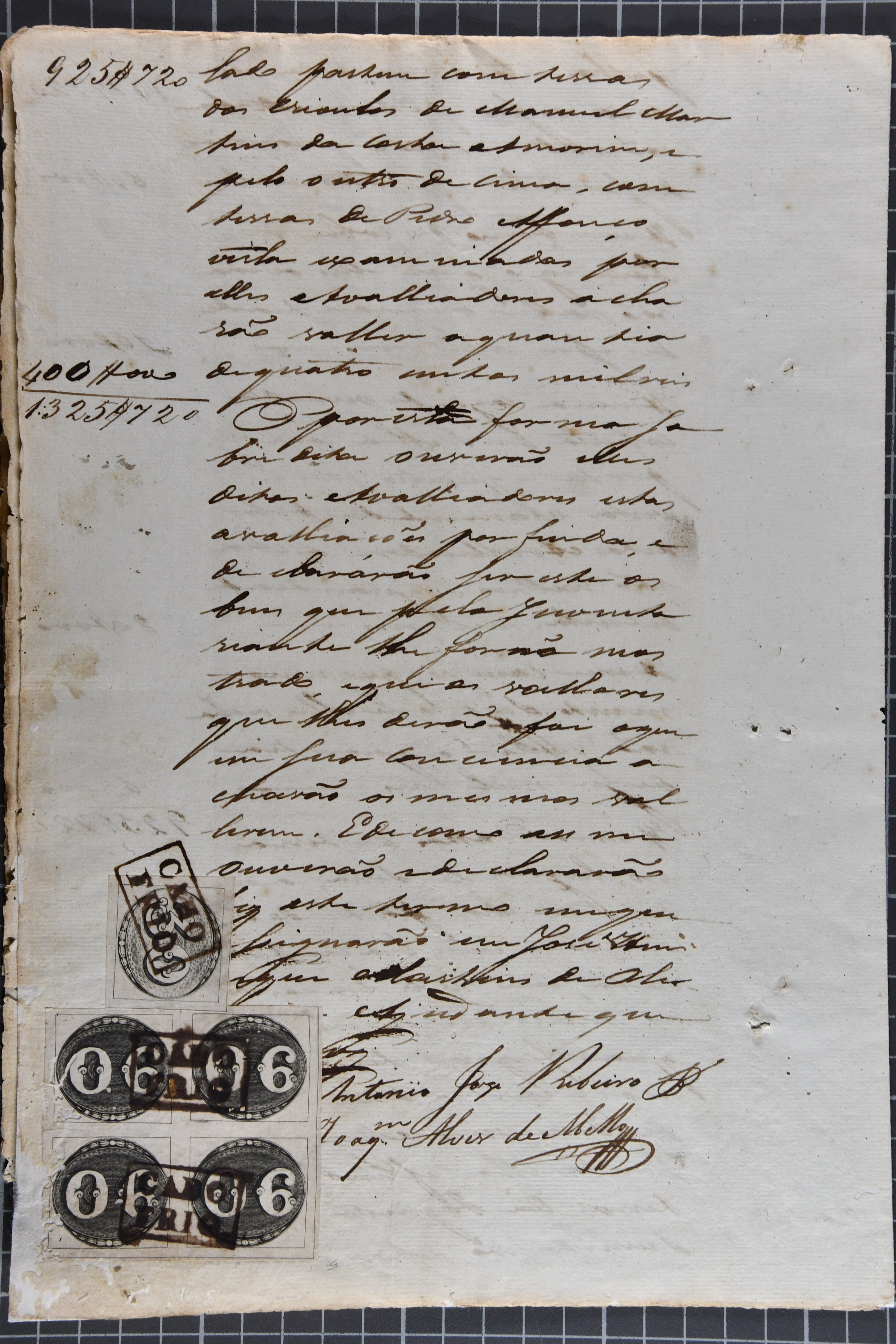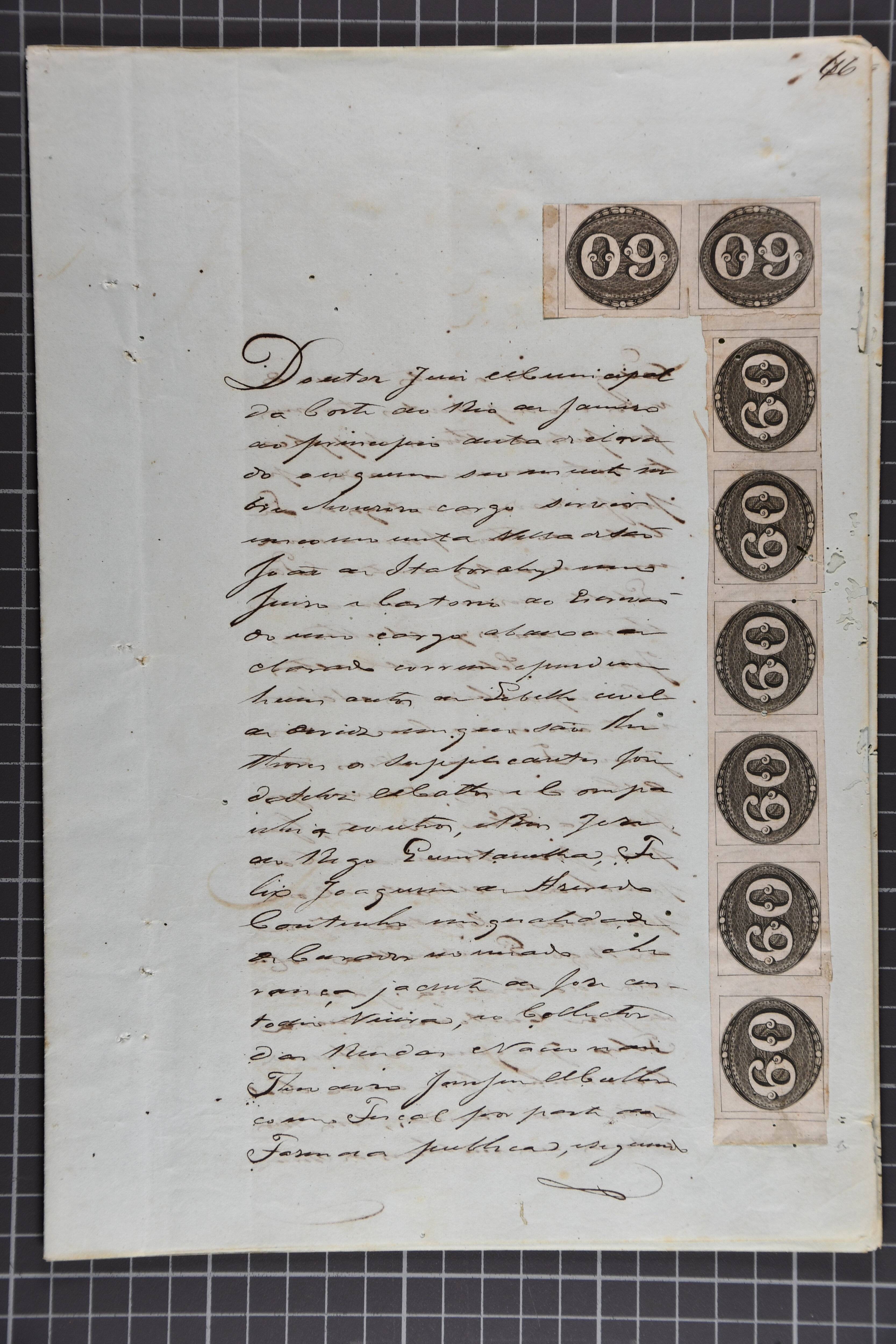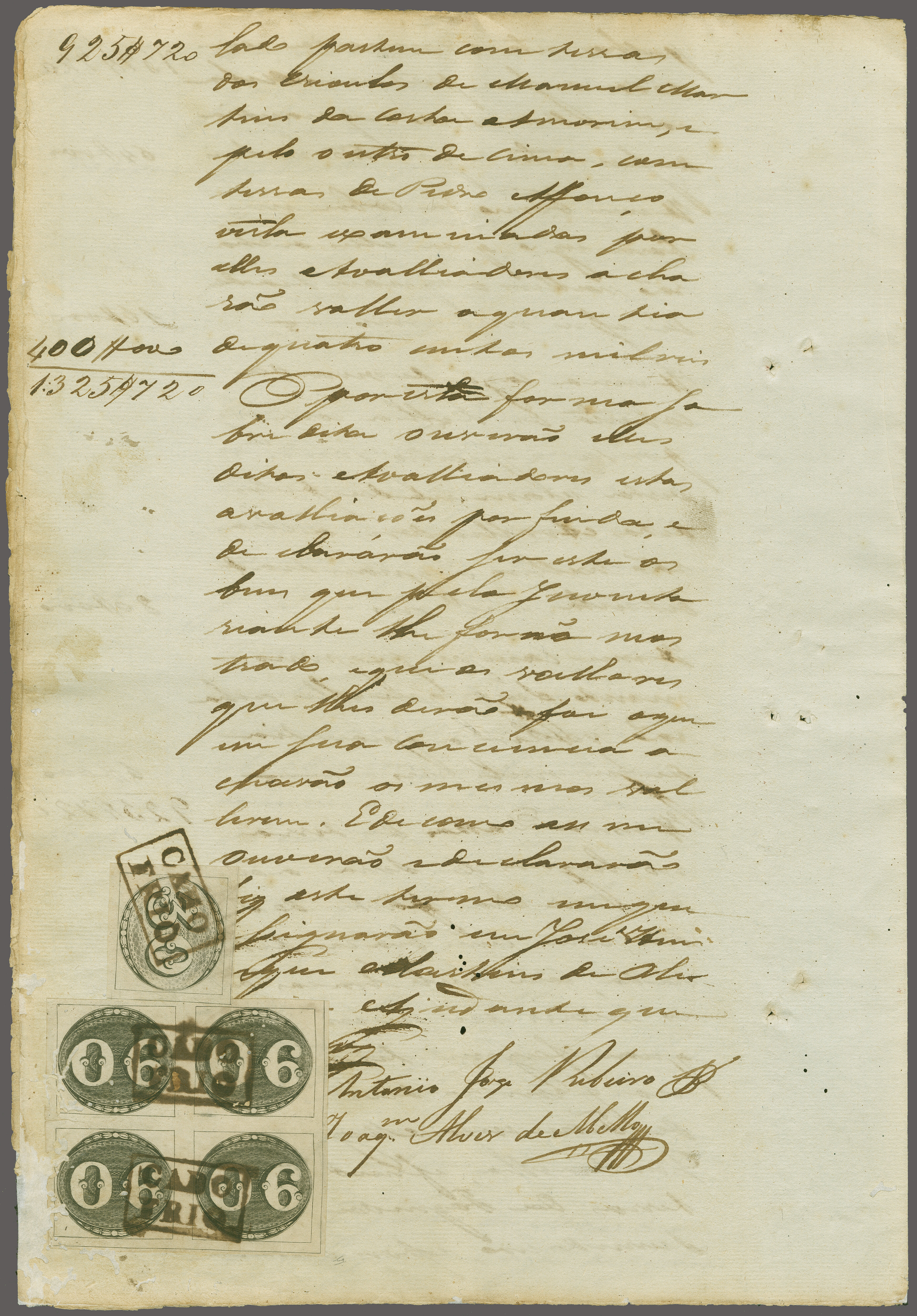 153 cover/bof image90 reis black, Early Impression in a corner block of four, positions 1-2/7-8 and showing the vertical frame line at left and horizontal frame line at top, in combination with single 30 reis grey, Worn Impression, all applied to a 12 page judicial document mailed on January 14, 1845 from Cabo Frio to the Court in Rio de Janeiro, tied by framed "CABO FRIO" handstamps (Ayres fig. 1248) in black. The rate totals 390 reis which is explained by the fact that judicial mail was carried at half the normal rate. The page has been restored to prevent further acid ink attack to the adhesives but this remarkable document is an important facet of Brazilian classic philately and is in all senses unique. Cert. Comelli (2003) and Dr. Goeggel. Note: See the article by Everaldo Santos FRPSL in the London Philatelist, Volume 124, Oct 2015, for a full discussion on the usages of Bull's Eyes and their multiples and usages on judicial forms. (Image 1) (Image 2)